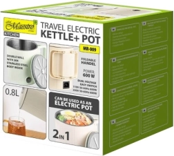 Élvezze az utazás kényelmét a kompakt vízforralóval és a többfunkciós 2 az 1-ben MAESTRO elektromos fazékkal. A 600 W teljesítmény gyorsan felforralja a vizet teához vagy kávéhoz, és éppoly könnyedén melegít levest vagy egyszerű ételeket. A kétfalú kialakítás, a belső 304-es rozsdamentes acéllal, jobb szigetelést, biztonságosabb érintést és hosszabb élettartamot biztosít.