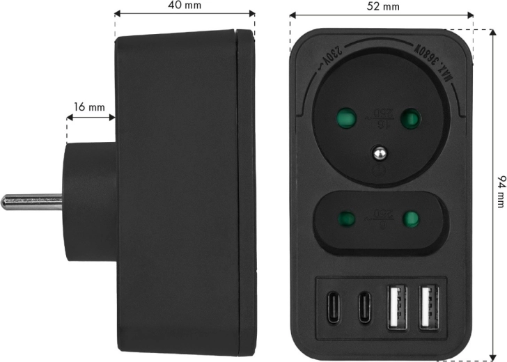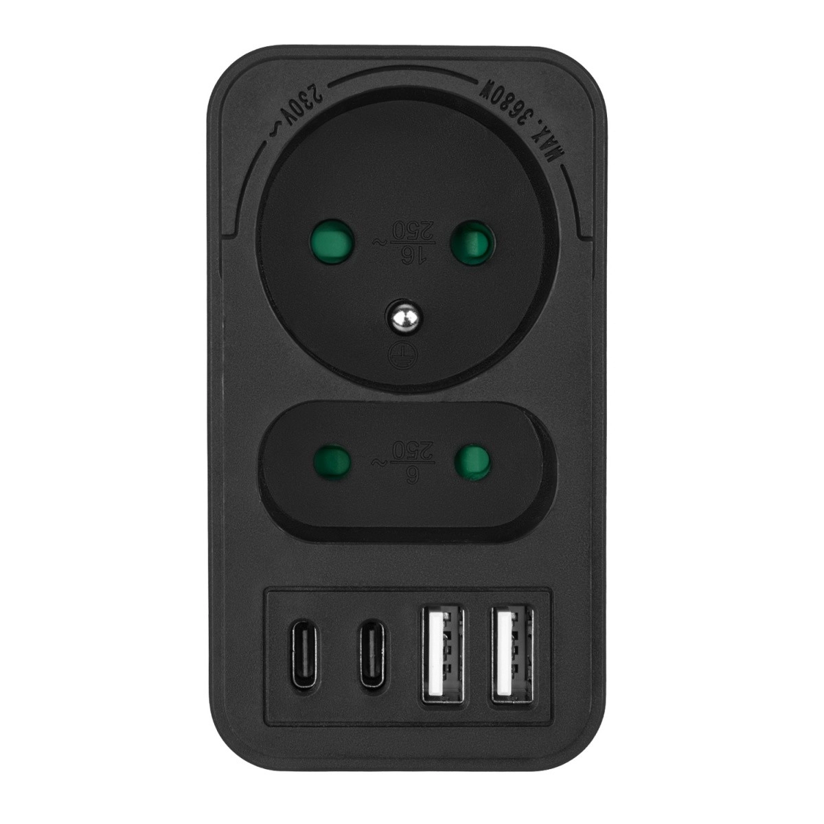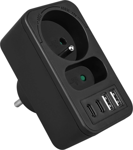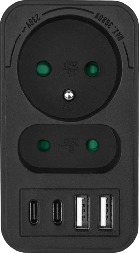 Okos megoldás otthonra és irodába: a kompakt fali adapter ötvözi a hagyományos 230 V-os táplálást négy nagy teljesítményű USB kimenettel. Elérhető egy földelt schuko aljzat a nagyobb teljesítményű készülékekhez és egy lapos euro aljzat a kisebb elektronikához. Így a több eszköz egyidejű töltése egyszerű és átlátható.