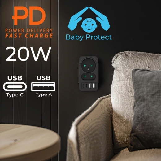 Az USB rész 2× USB‑A-t (akár 3 A / 18 W) kínál a kiegészítők számára és 2× USB‑C‑t PD-vel (akár 20 W) a modern okostelefonok és tabletek gyors és stabil töltéséhez. A beépített védelemnek köszönhetően a töltés biztonságos és hatékony, ideális nappaliba, dolgozószobába és hálószobába.