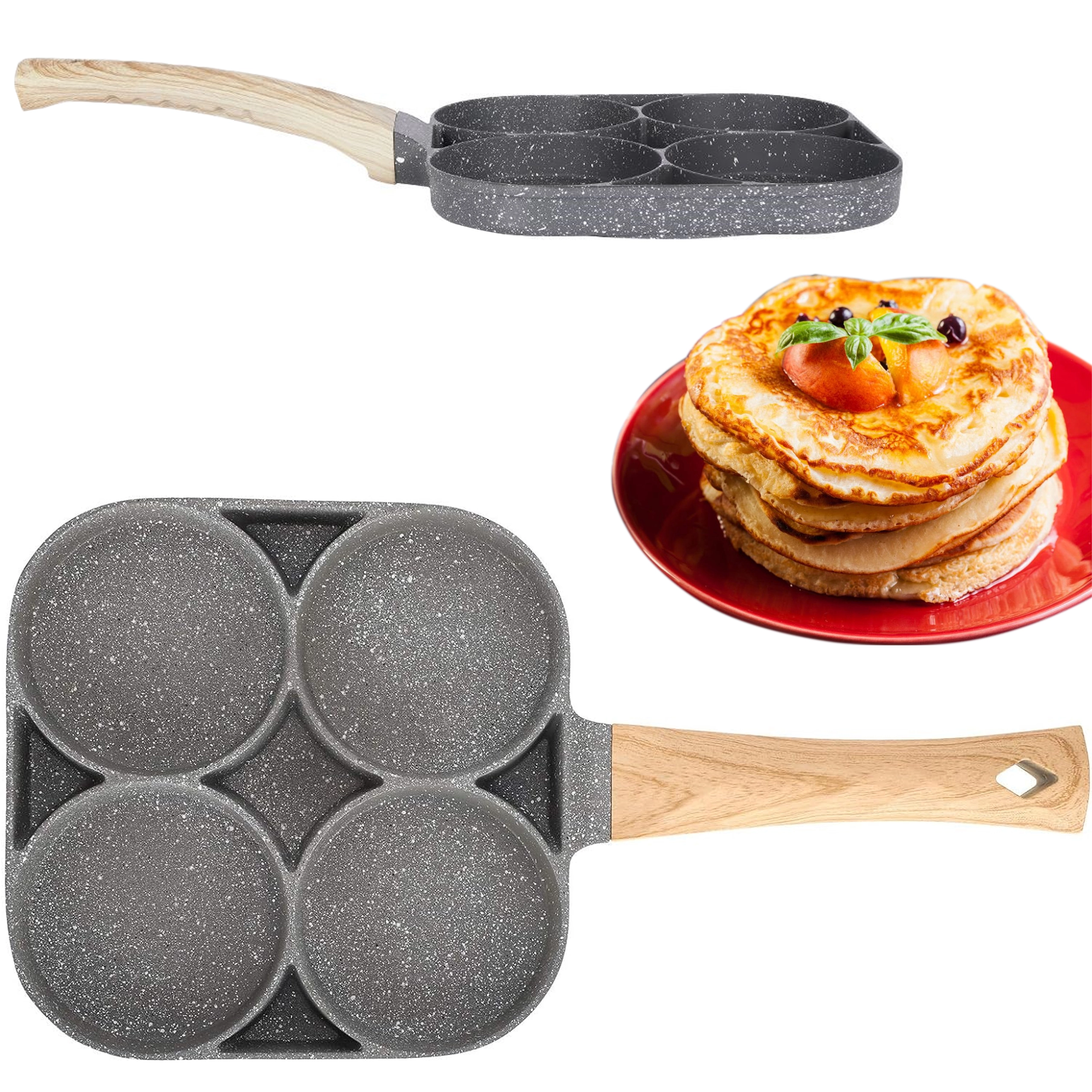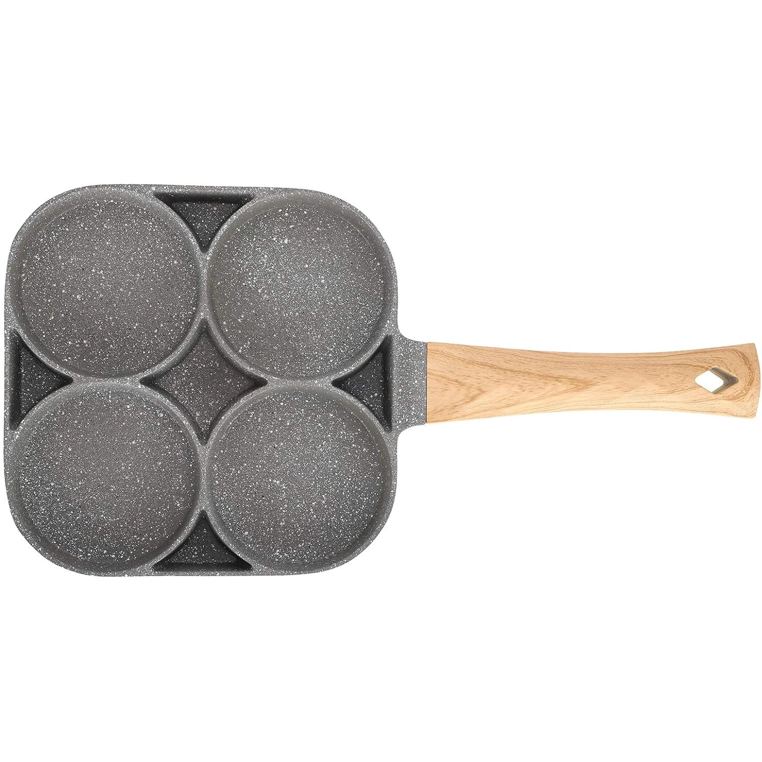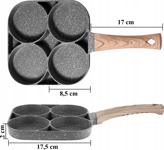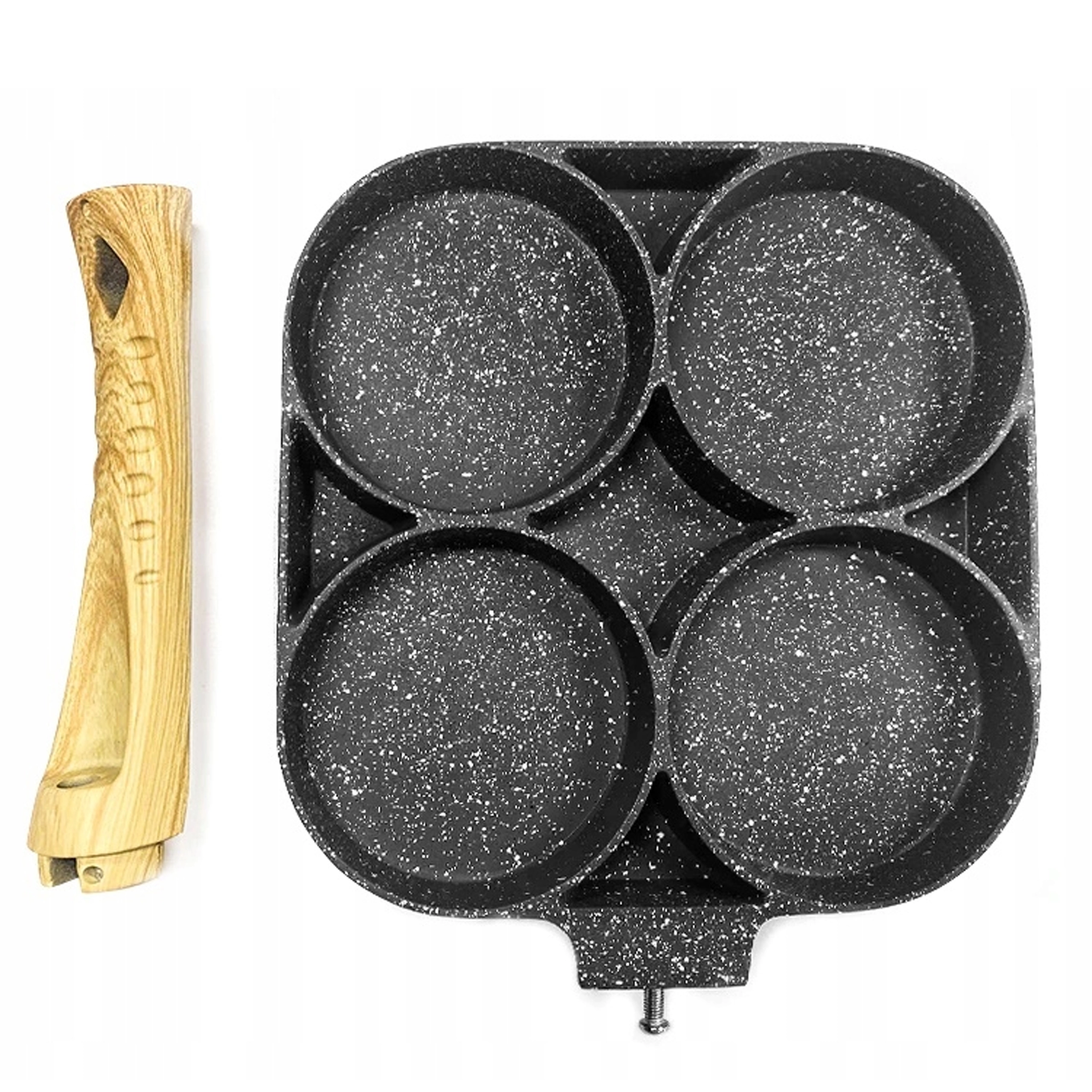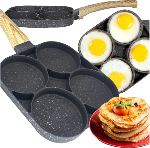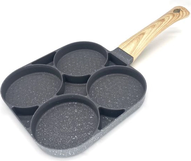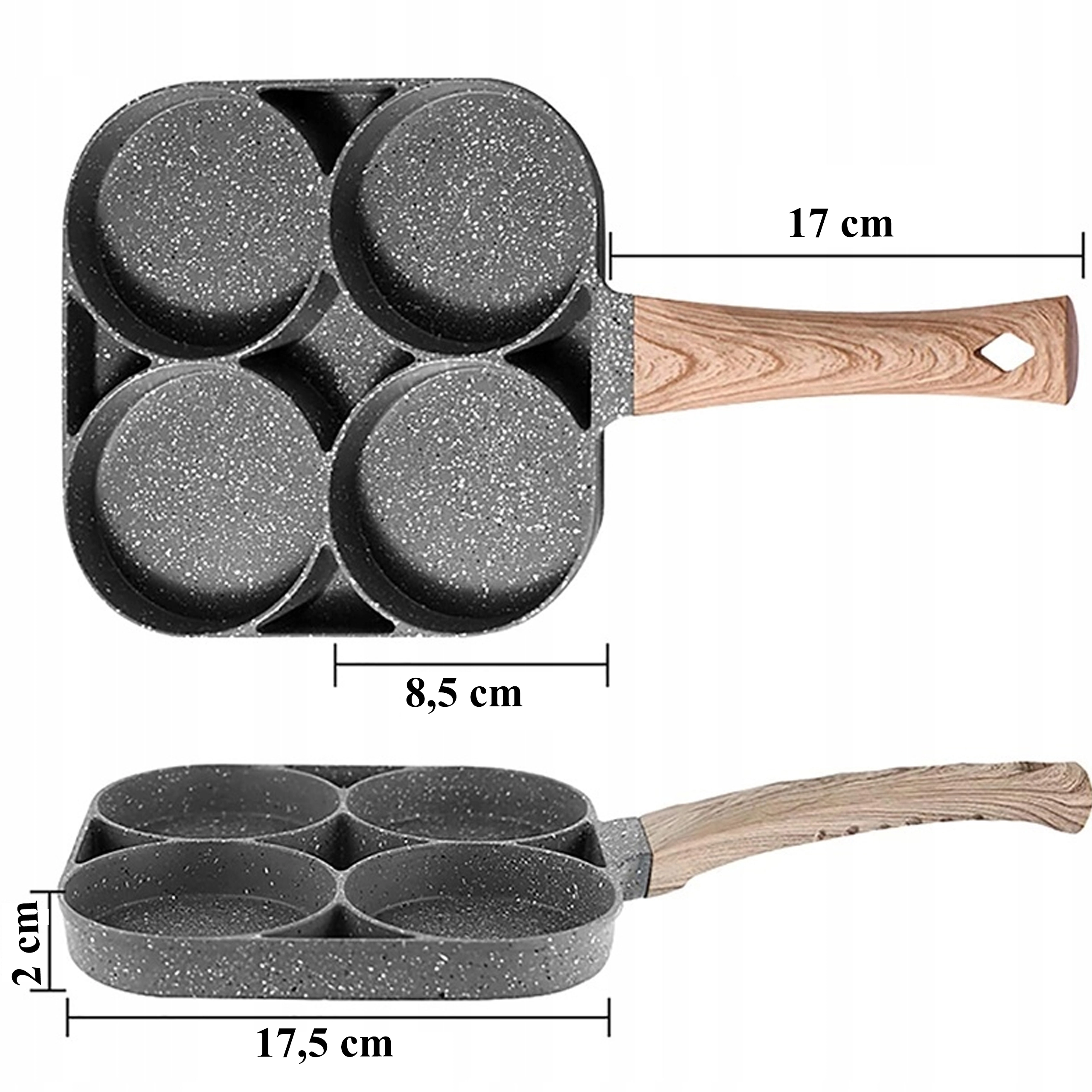 Készítsen reggelit gyorsabban és rend nélkül ezzel az univerzális serpenyővel, amely négy kerek rekesszel rendelkezik. A tapadásmentes felületnek és az egyenletes hőeloszlásnak köszönhetően tojást, palacsintát, lepényt és mini amerikai palacsintát egyszerre és tökéletes formában készíthet. Az ergonomikus, fa hatású nyél kényelmes fogást biztosít, a serpenyő pedig indukciós, gáz- és egyéb típusú főzőlapokhoz is alkalmas.