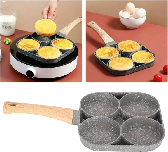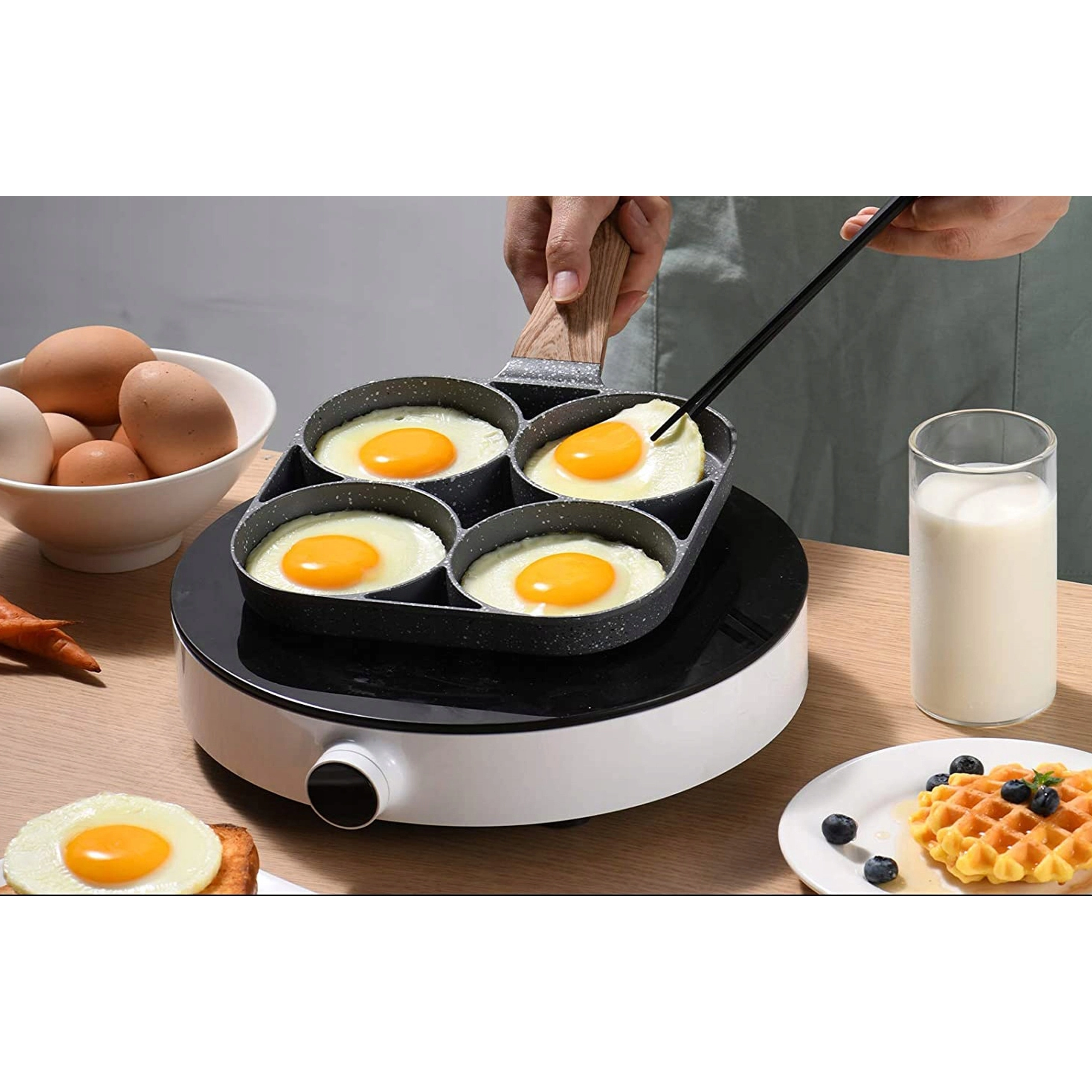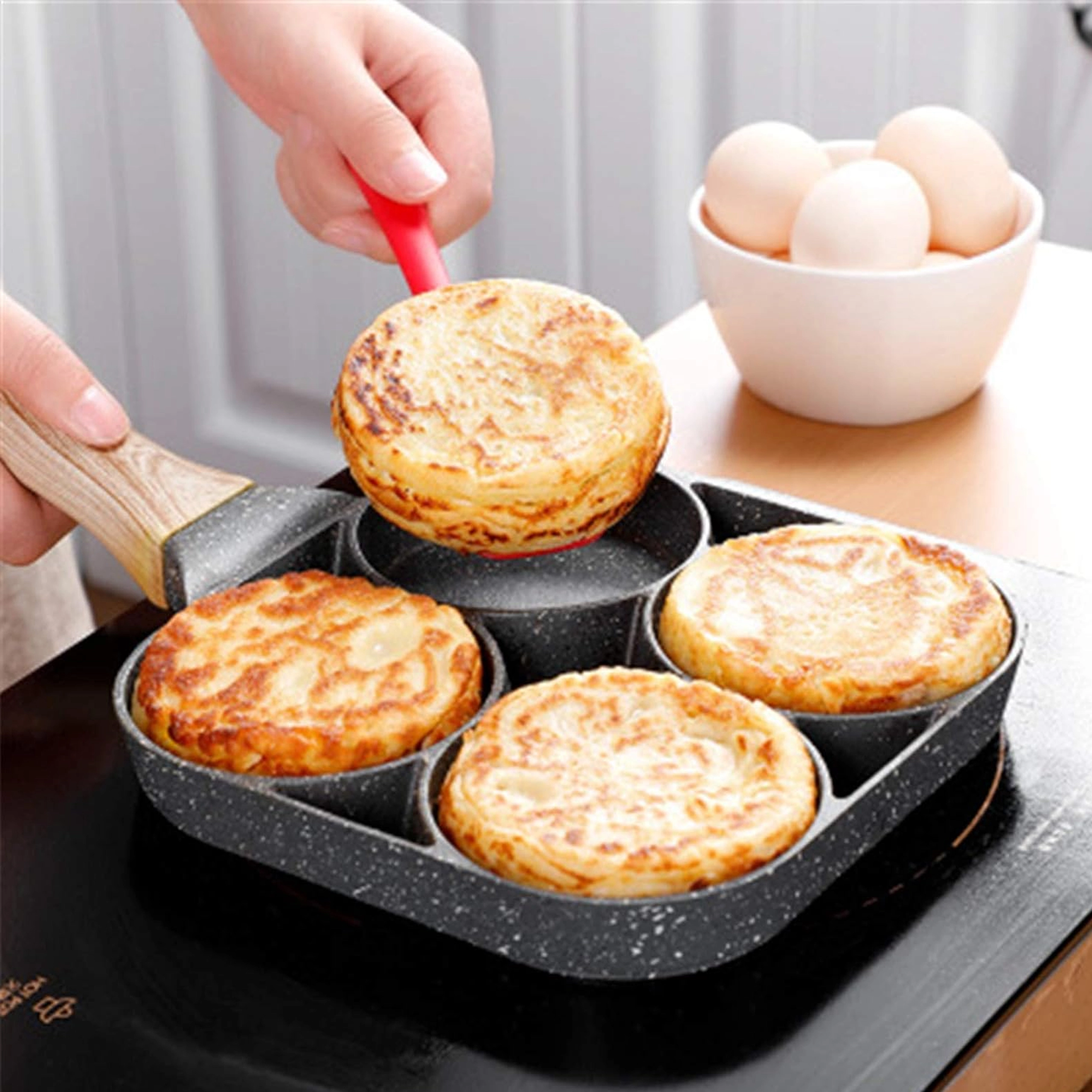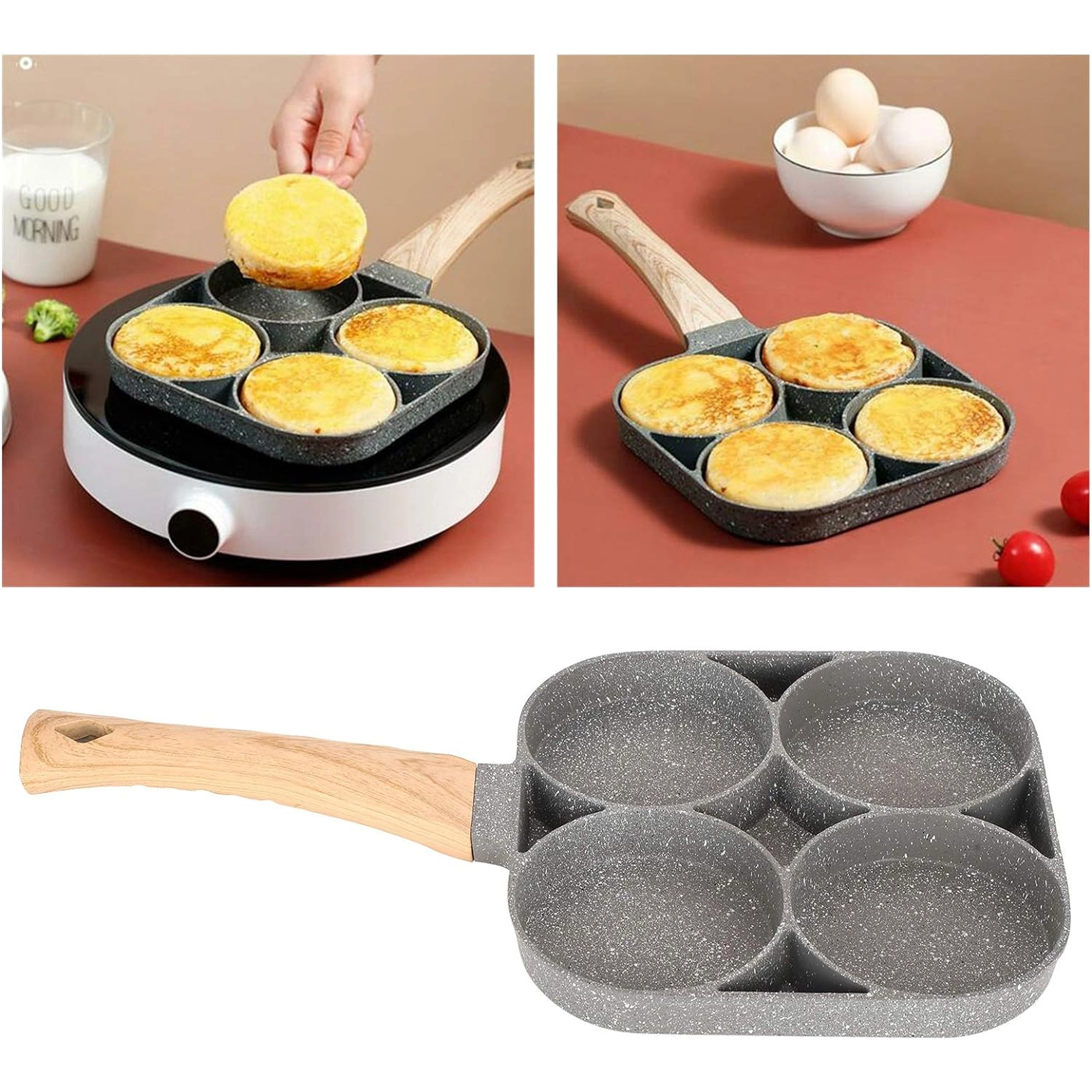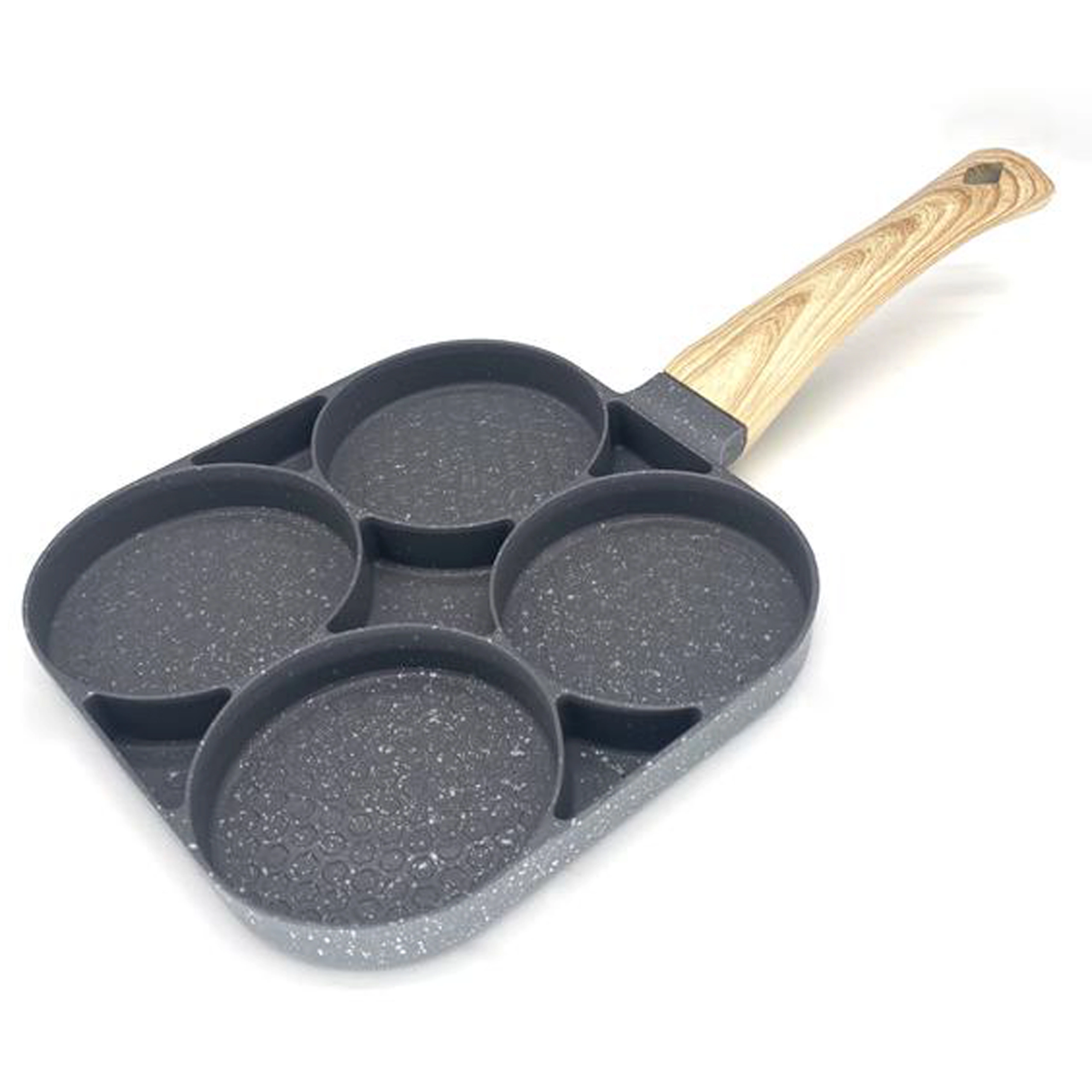 Készítsen reggelit gyorsabban és rend nélkül ezzel az univerzális serpenyővel, amely négy kerek rekesszel rendelkezik. A tapadásmentes felületnek és az egyenletes hőeloszlásnak köszönhetően tojást, palacsintát, lepényt és mini amerikai palacsintát egyszerre és tökéletes formában készíthet. Az ergonomikus, fa hatású nyél kényelmes fogást biztosít, a serpenyő pedig indukciós, gáz- és egyéb típusú főzőlapokhoz is alkalmas.