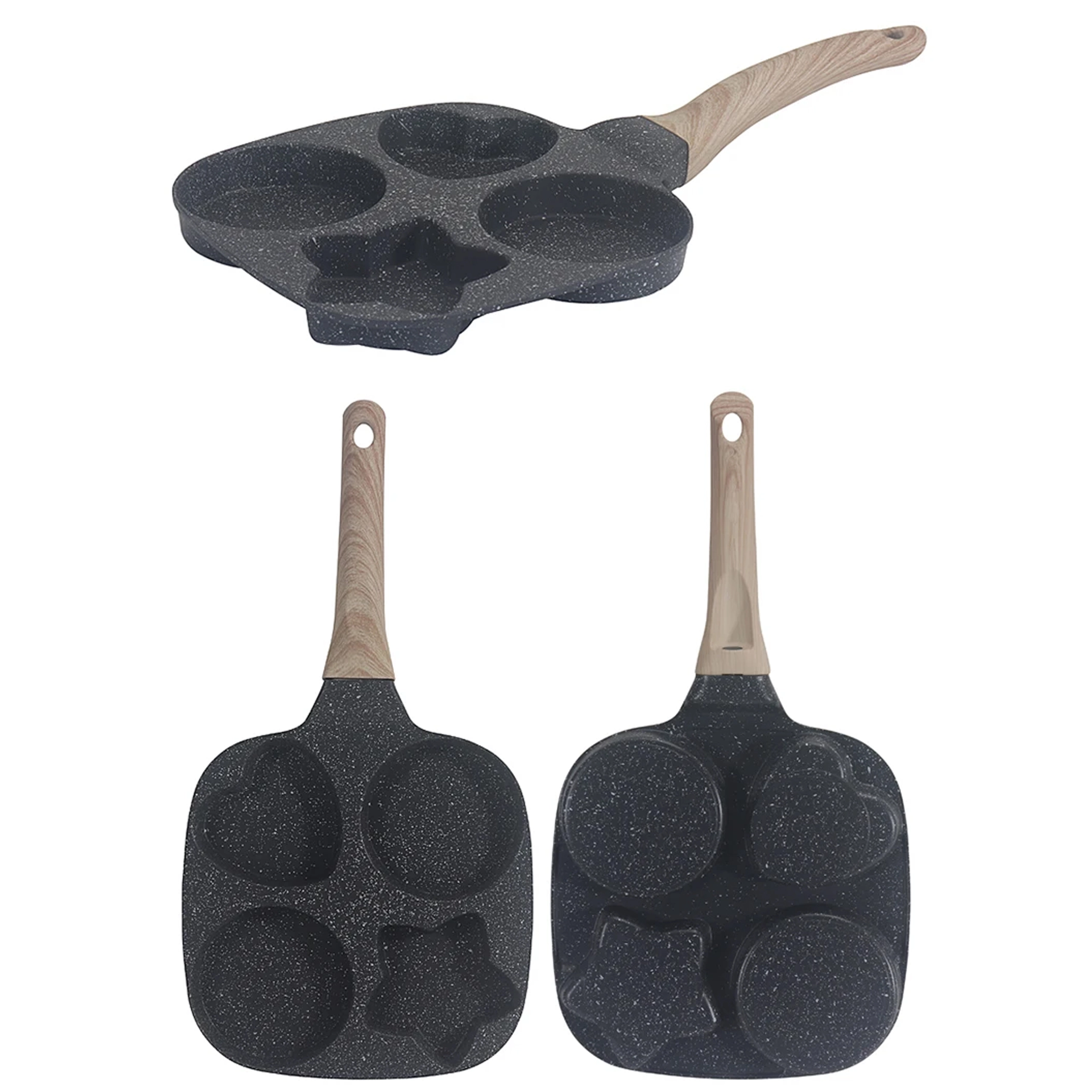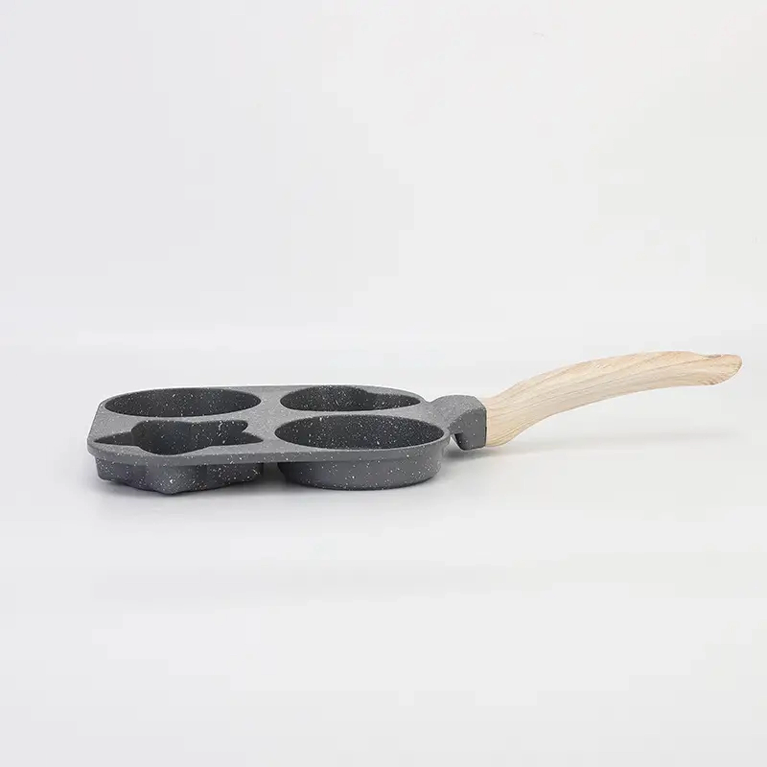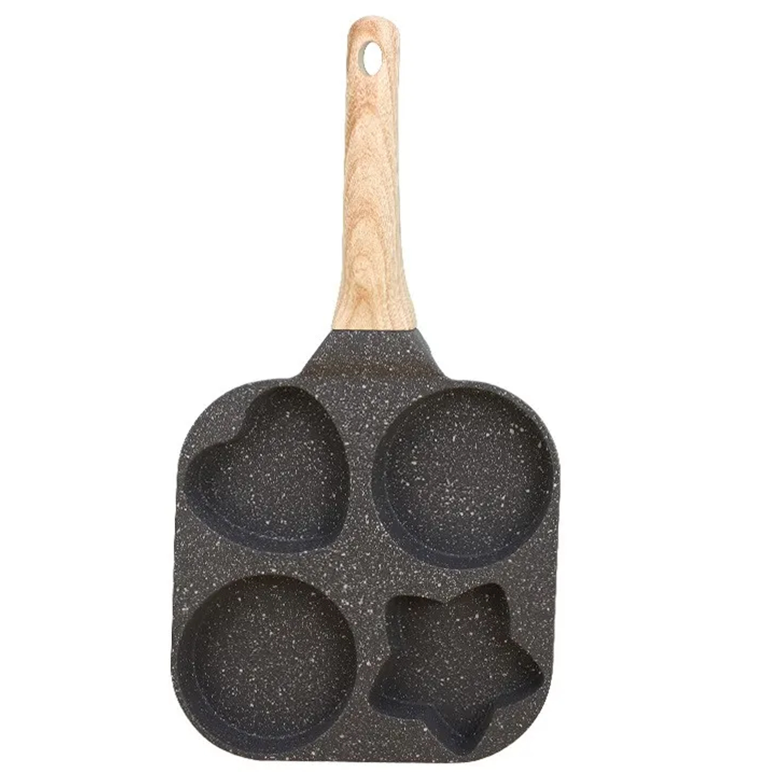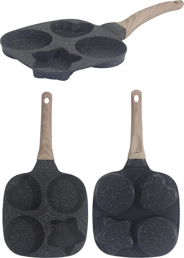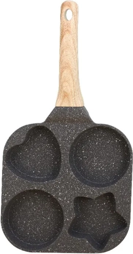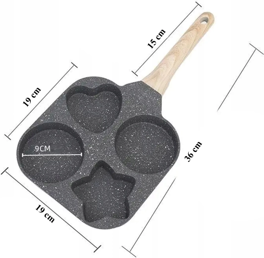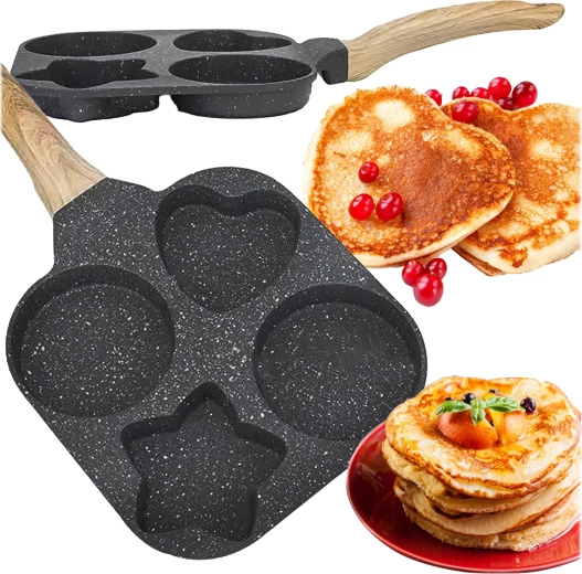 Ez a praktikus serpenyő négy mélyített formával lehetővé teszi több adag egyidejű elkészítését – ideális tojásokhoz, amerikai palacsintához, tócsnihoz vagy kis lepényekhez. A formázott rekeszek (2× kerek, 1× szív, 1× csillag) vidám és egyenletes adagokat hoznak létre, amelyek a gyerekeknek és a felnőtteknek is örömet okoznak.