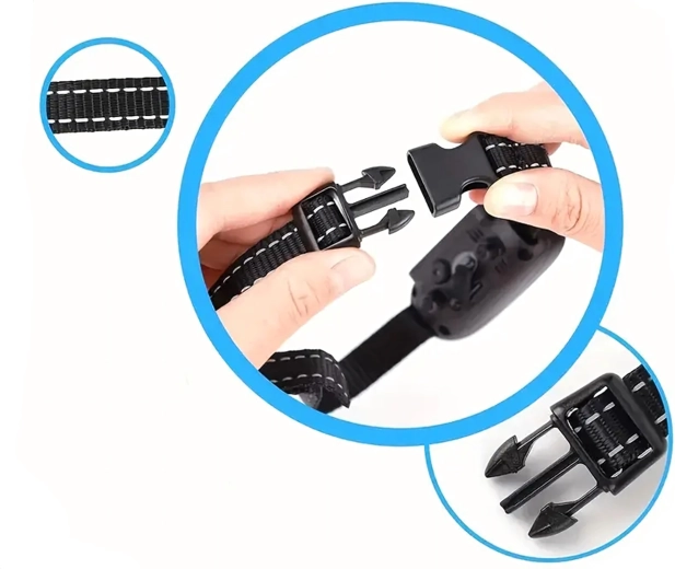 A fényvisszaverő nylon pánt gyorscsatos csattal egyszerűen a kutya nyakára igazítható a biztos és komfortos viselésért.