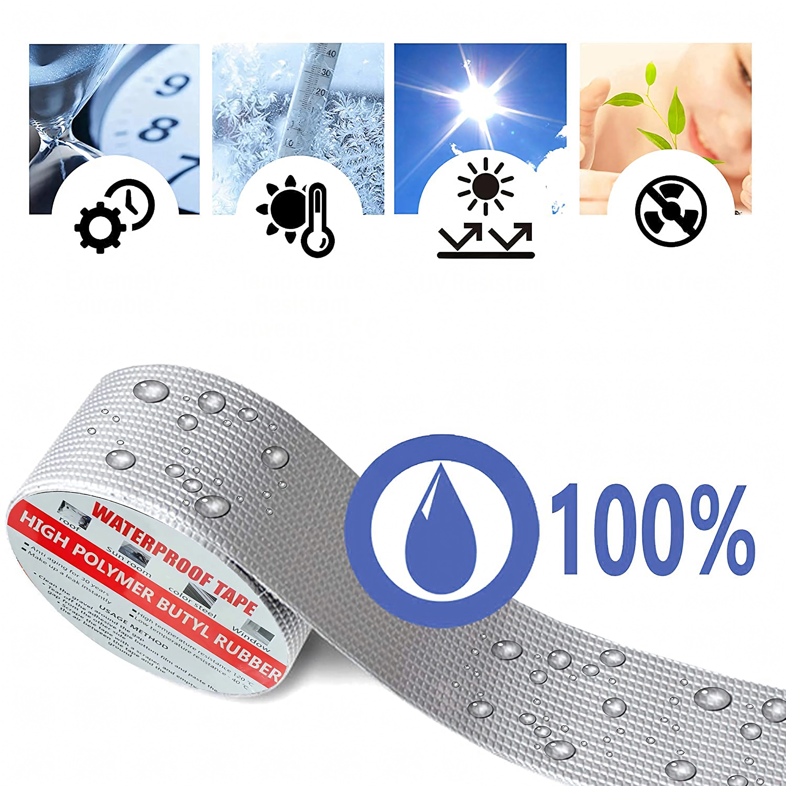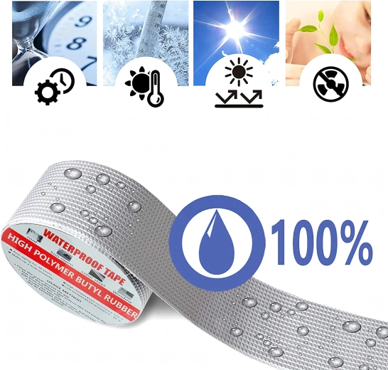 Az alumínium felület véd az UV-sugárzástól és a hőingadozásoktól, így a szalag esőben, fagyban és hőségben is megőrzi tömítőképességét.