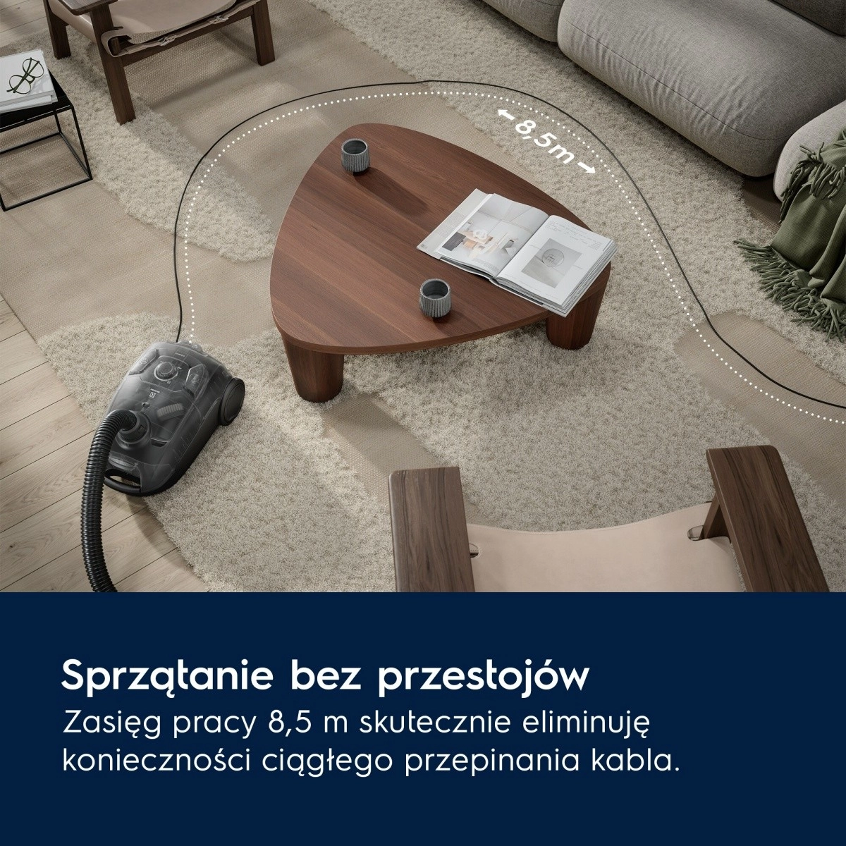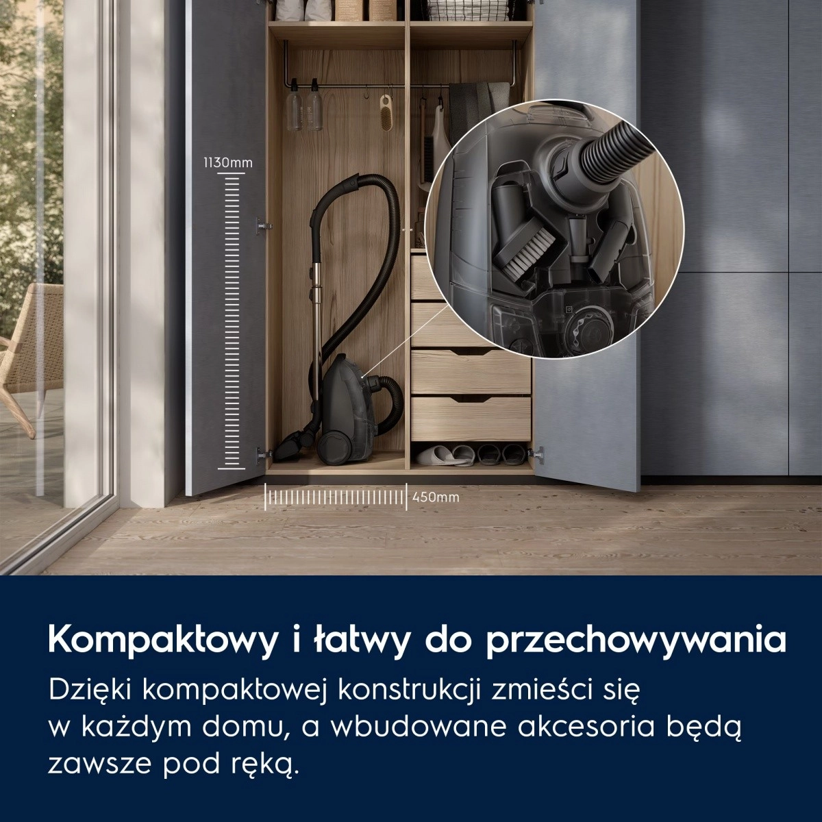 A teleszkópos csőnek, a nagy kerekeknek és a 8,5 m-es működési sugárnak köszönhetően könnyedén elér minden sarkot, ritkább aljzatcserével. A szűrőrendszer akár 99,99% finom részecskét (pl. por és atka) is felfog a higiénikusabb beltéri levegőért. A kompakt ház beépített tartozéktárolóval helytakarékos, és mindent kéznél tart.