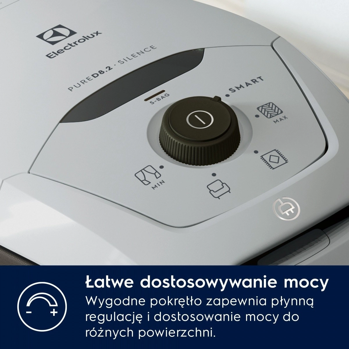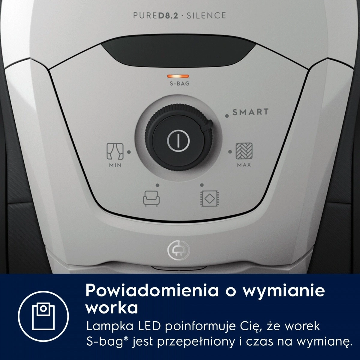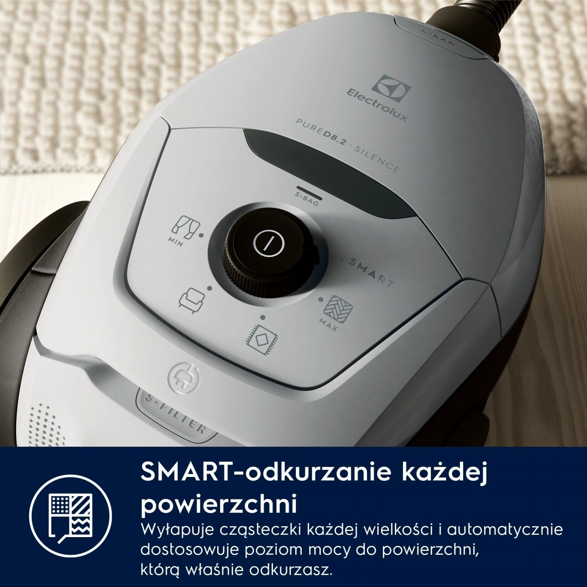 A Pure D8.2 Silence PD82-4MG a csend, teljesítmény és higiénia csúcsminőségű kombinációját nyújtja. A SmartMode technológia automatikusan felismeri a padló típusát, és a legjobb eredmény érdekében kézi beállítás nélkül igazítja a szívóerőt. Az innovatív PureSound rendszer a zajt mindössze 57 dB(A)-re csökkenti, így akár a gyerekek alvása közben is porszívózhat.