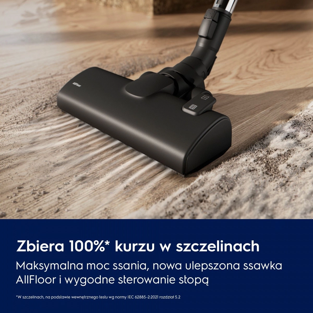 A porszívó kiváló hatékonyságot nyújt a résekből történő porfelszívásban, az új AllFloor fejjel pedig a kemény padlókat és a szőnyegeket is könnyedén kezeli. A kefeváltás kényelmesen, lábbal elvégezhető.
