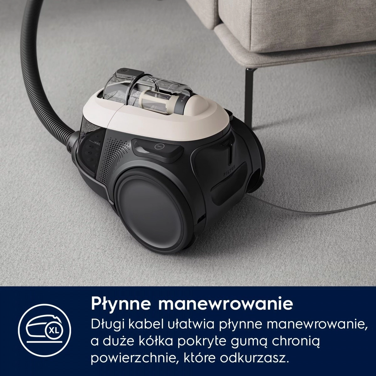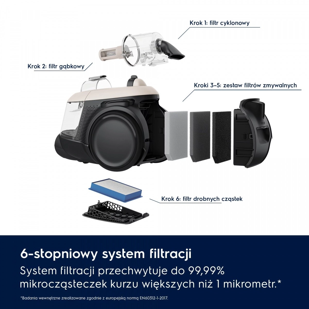 A fejlett ciklonrendszer állandó szívóteljesítményt tart fenn még tele tartály mellett is, és hatékonyan gyűjti a port keménypadlón és szőnyegen. A HEPA szűrőrendszer akár 99,99% 0,3 µm méretű részecskét is megfog – finom port, atkákat és allergéneket – a tisztább beltéri levegőért.