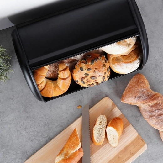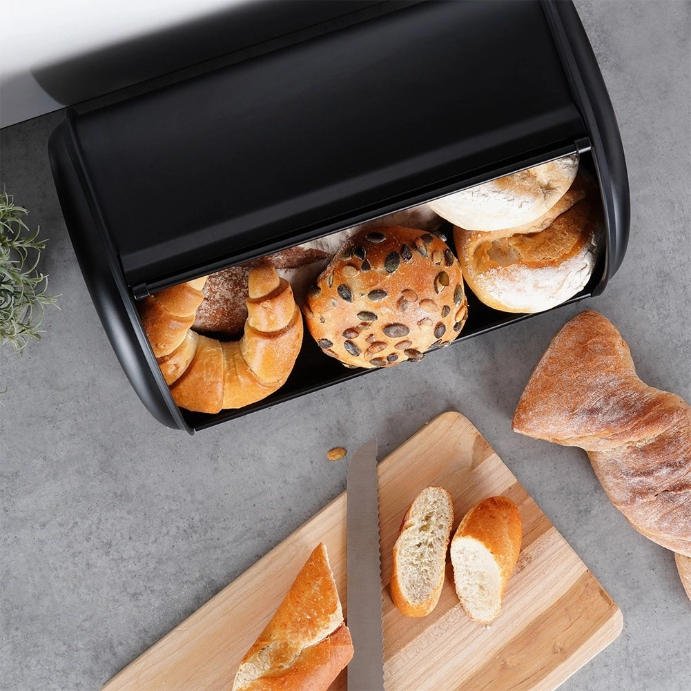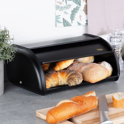 Minden nap egyszerű használat a simán nyíló rolós előlapnak köszönhetően, amely helytakarékos a pulton. A fémtest stabil és ellenálló a sérülésekkel szemben, így a pékáru biztonságban marad. A kenyértartó praktikus megoldás a konyhapult rendszerezéséhez is – csökkenti a rendetlenséget, és védi a pékárut a levegő bejutásától.