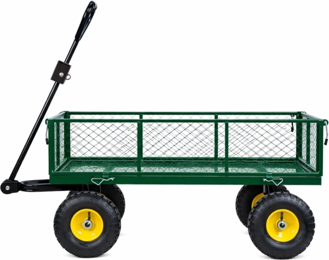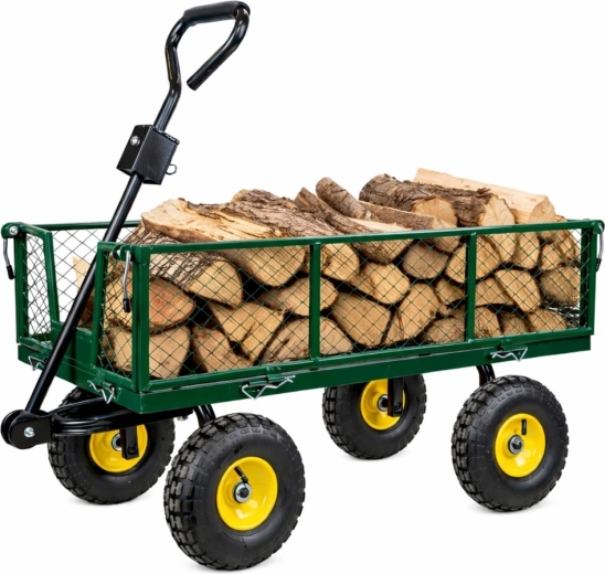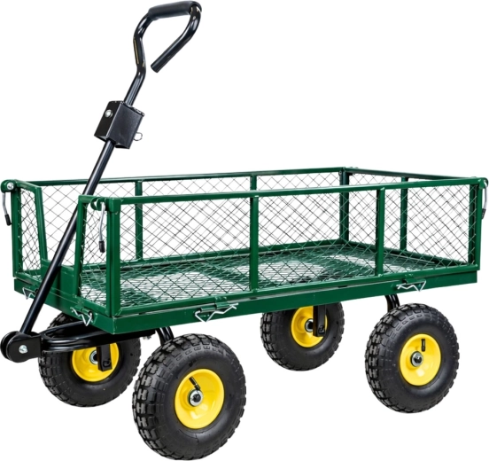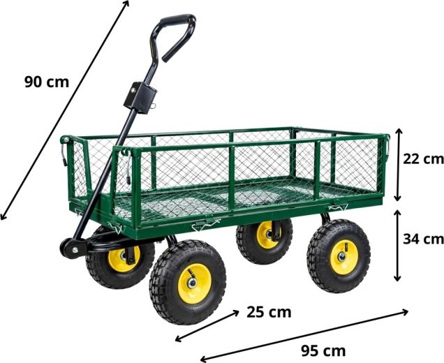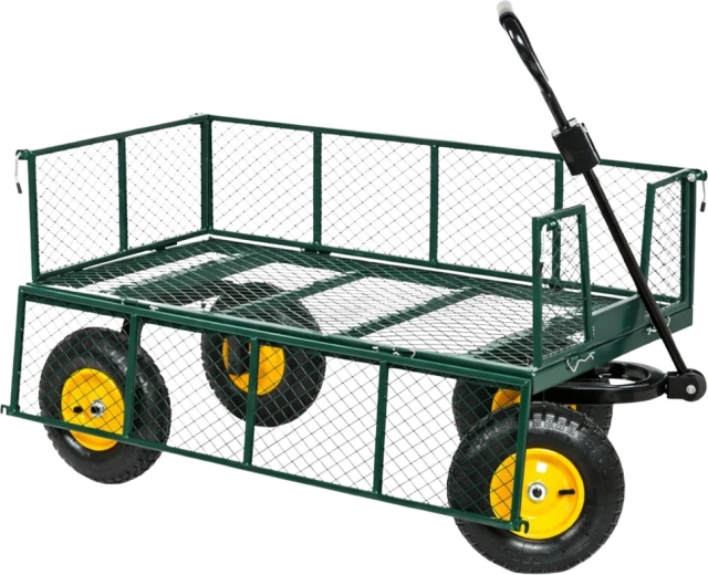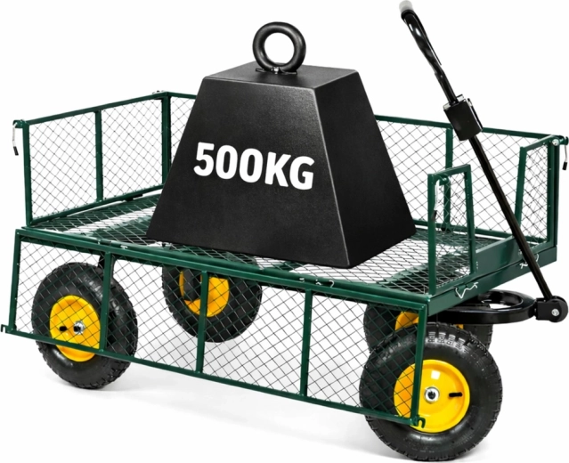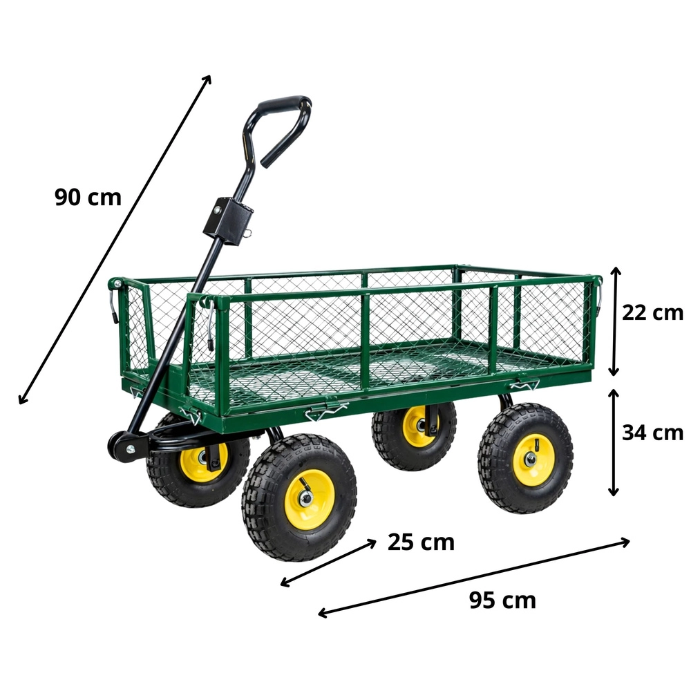 Masszív, strapabíró acél kerti kocsi az anyagok egyszerű szállításához a kertben, az építkezésen és a raktárban. Akár 200 kg teherbírás, 4 felfújható kerék a sima haladáshoz terepen, forgó első tengely a pontos manőverezéshez és lehajtható oldalfalak a gyors rakodáshoz és kirakodáshoz.