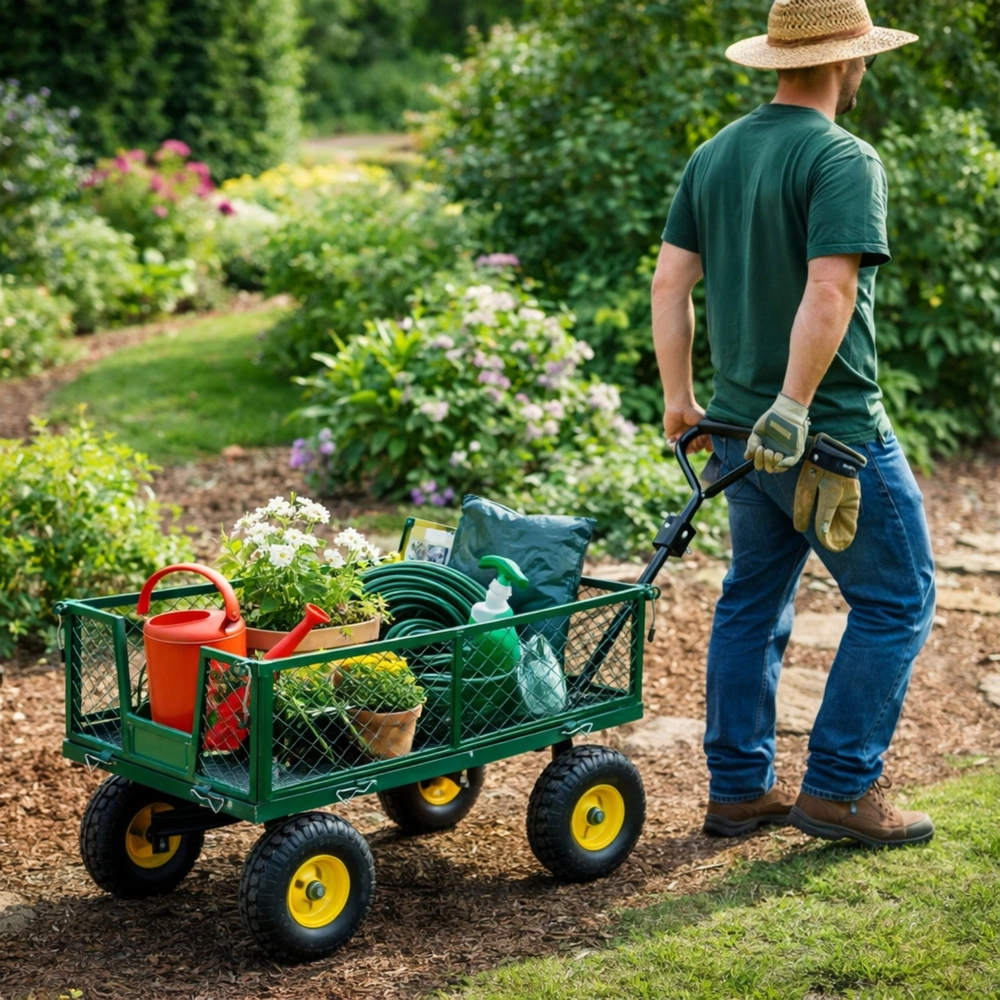 Sokoldalú segítséget keres a kertben, az építkezésen vagy a műhelyben? Ez az acél kerti kocsi 200 kg teherbírással elbír földdel, fával, kövekkel és szerszámokkal is. A stabil, négykerekű kialakítás felfújható kerekekkel csillapítja az egyenetlenségeket füvön, kavicson és burkolaton, míg a forgó első tengely pontos kormányzást biztosít teljes terhelésnél is.