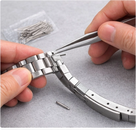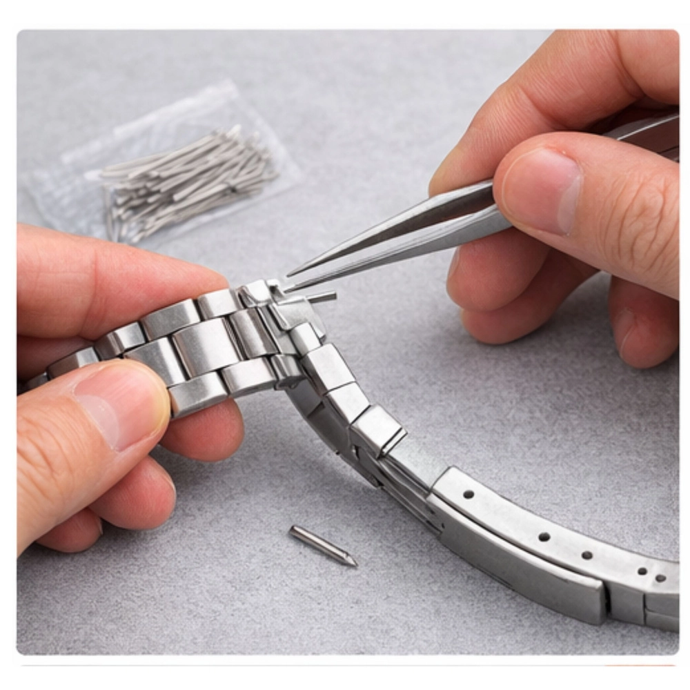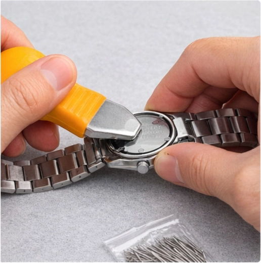 Átfogó szerszámkészlet hátlapnyitáshoz, szíjrövidítéshez, rugós stift cseréhez és precíz alkatrész-kezeléshez. A praktikus tok mindent áttekinthetően rendezve tart.