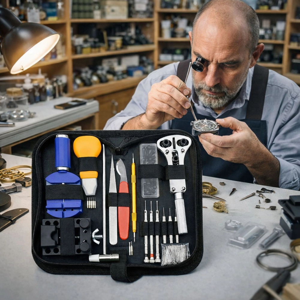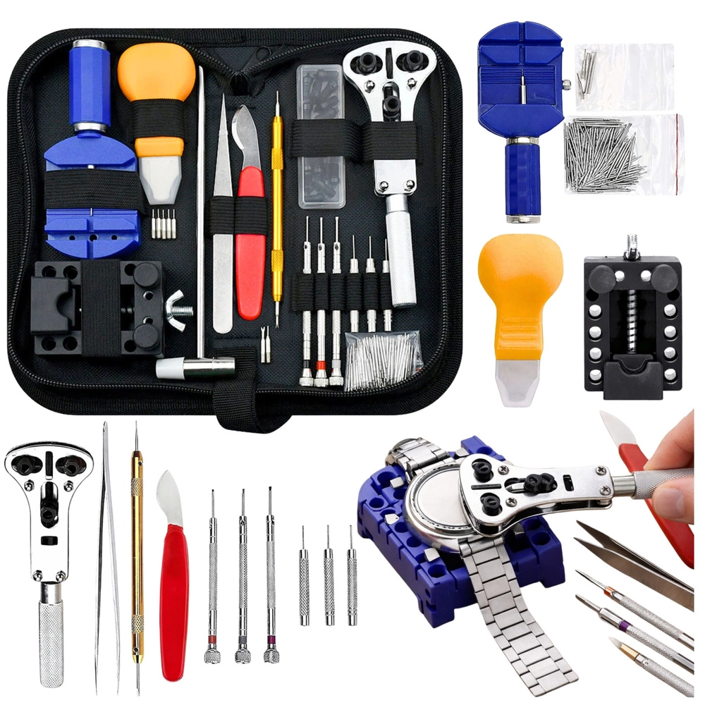 Teljes óraszerviz-készlet, amely mindent tartalmaz az otthoni és haladó órásmunkákhoz. Eszközök hátlapok nyitásához, szíjak rövidítéséhez és beállításához, rugós stiftek cseréjéhez és az óra biztonságos rögzítéséhez. A rozsdamentes acélból és alumíniumból készült minőségi szerszámok praktikus cipzáras tokban vannak elhelyezve az egyszerű rendszerezés és hordozhatóság érdekében.