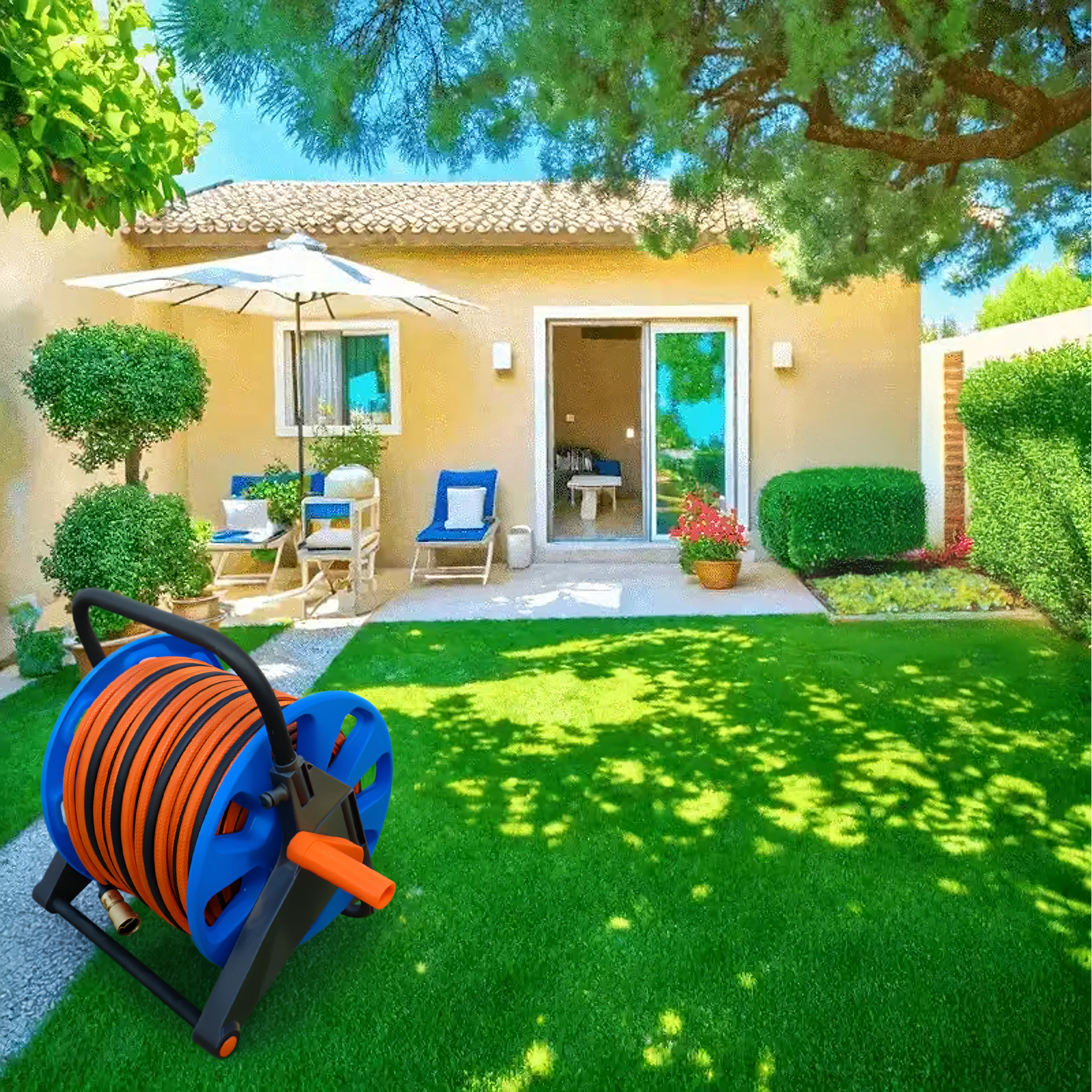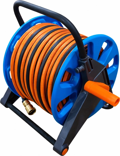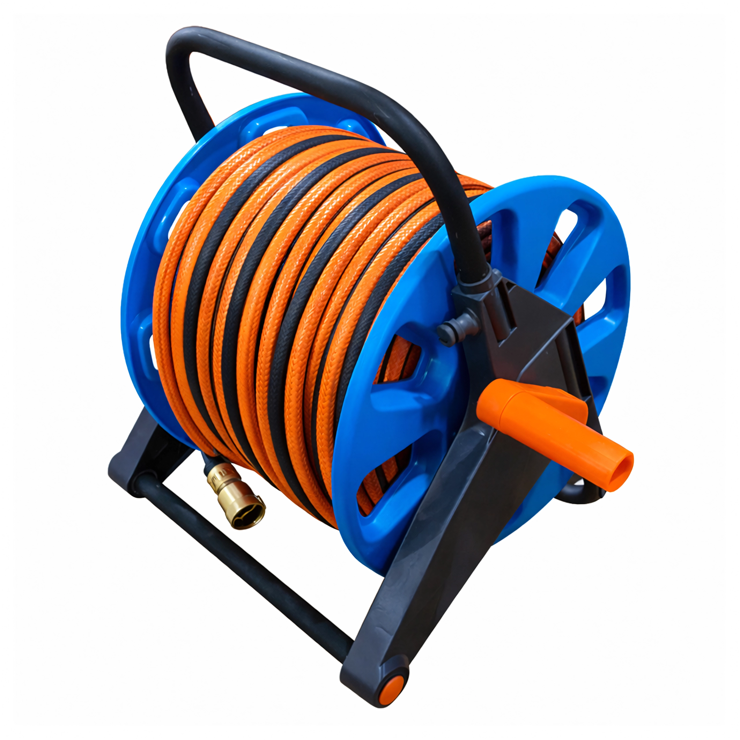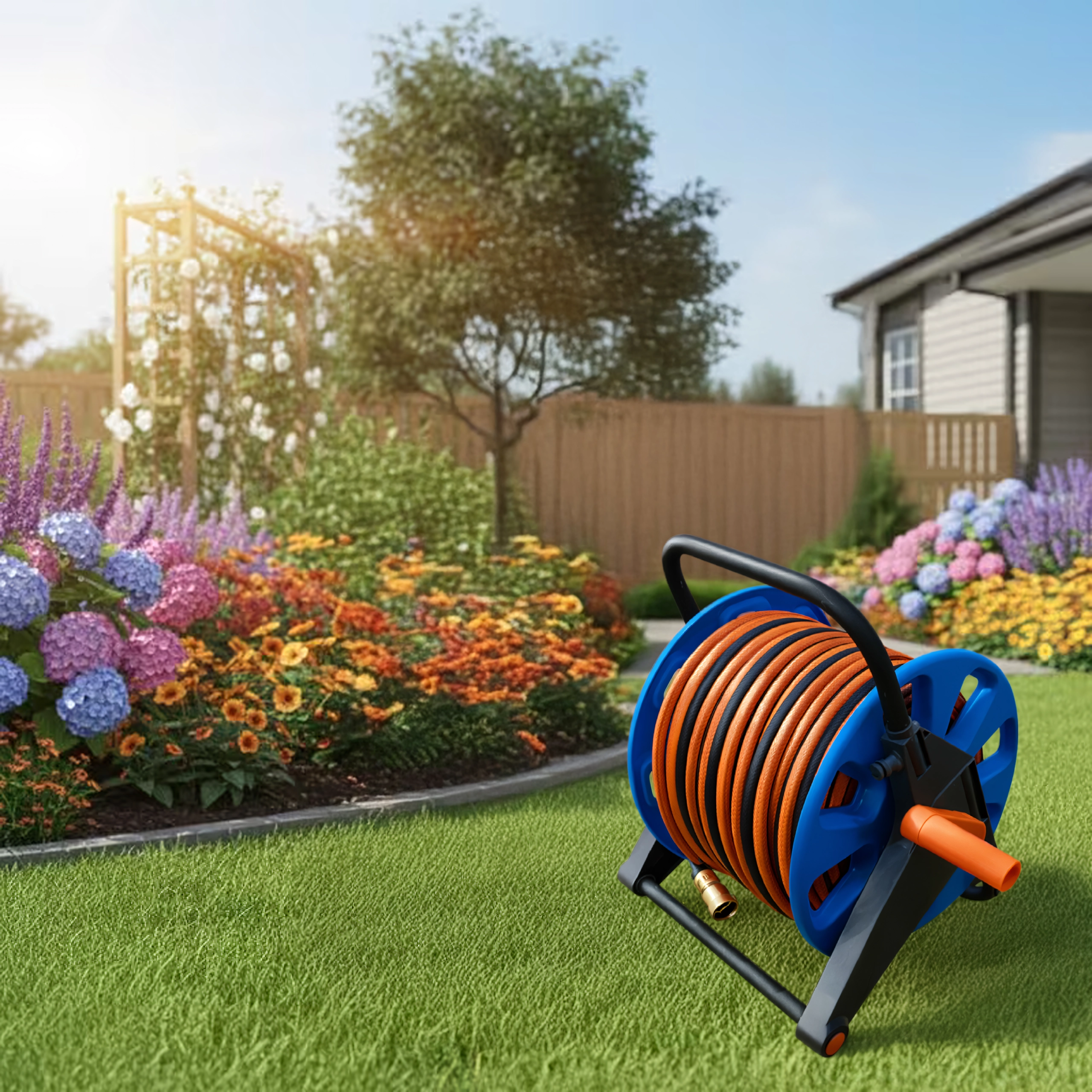 A dob akár 50–60 m kerti tömlőt is befogad, ideális nagyobb kertekhez és hosszabb hatótávhoz.