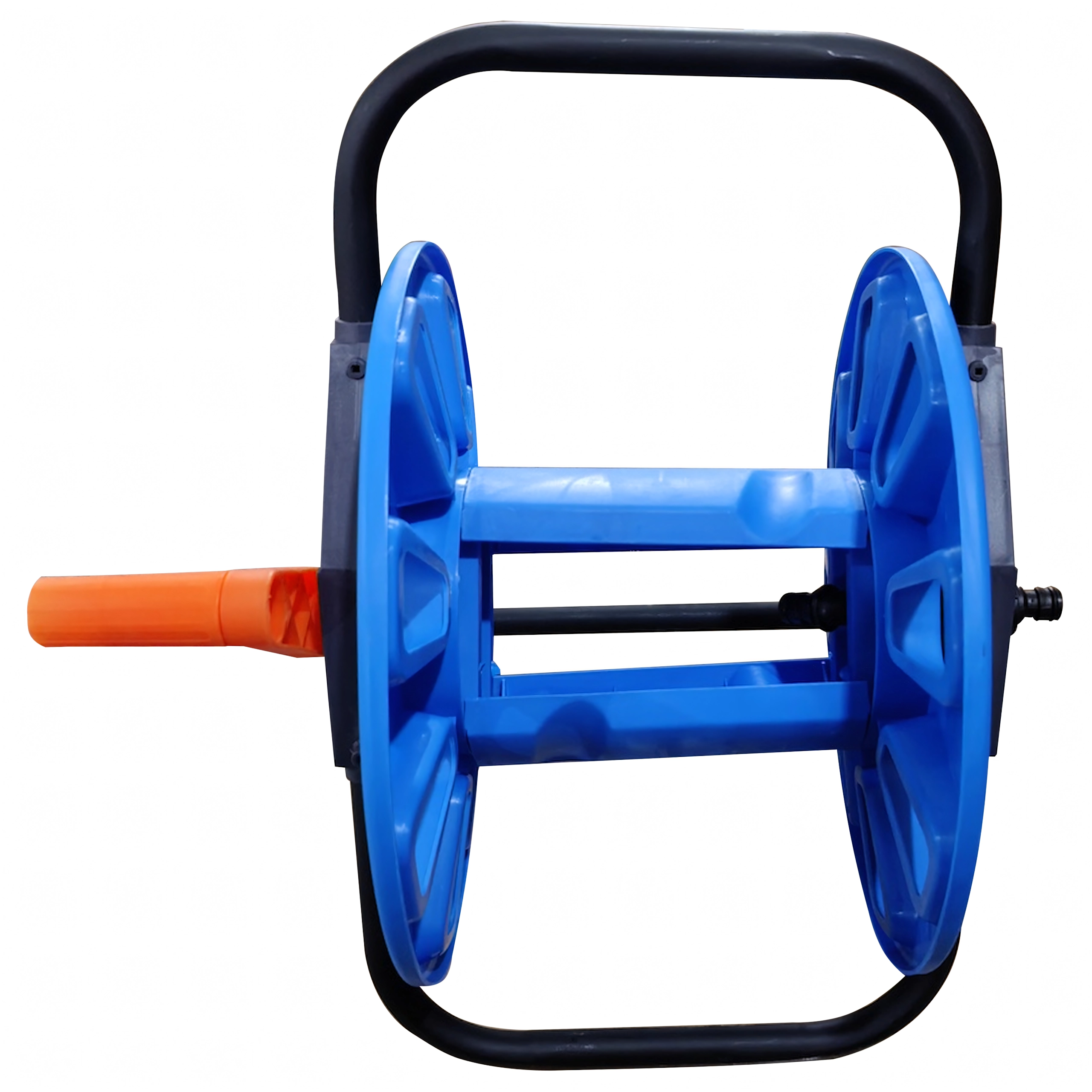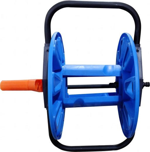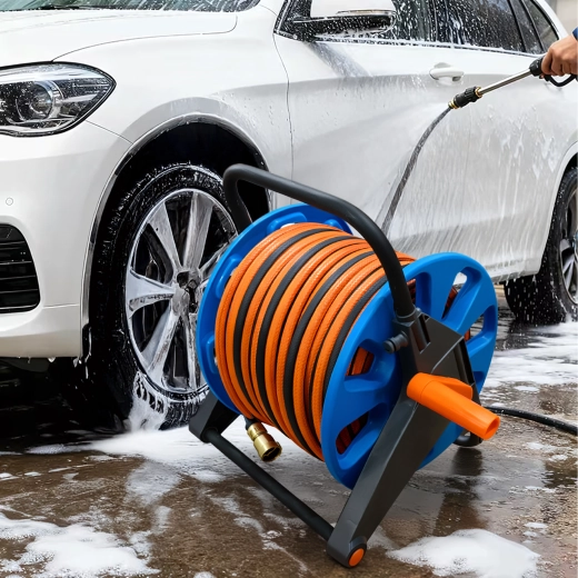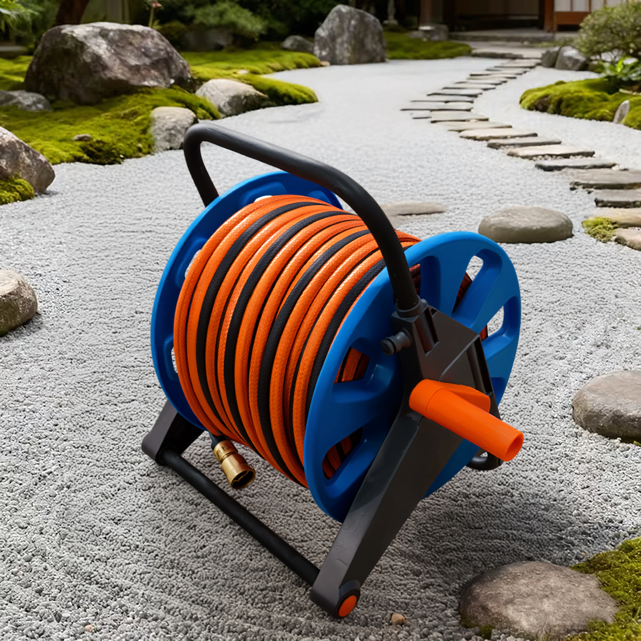 A dob akár 50–60 m kerti tömlőt is befogad, ideális nagyobb kertekhez és hosszabb hatótávhoz.