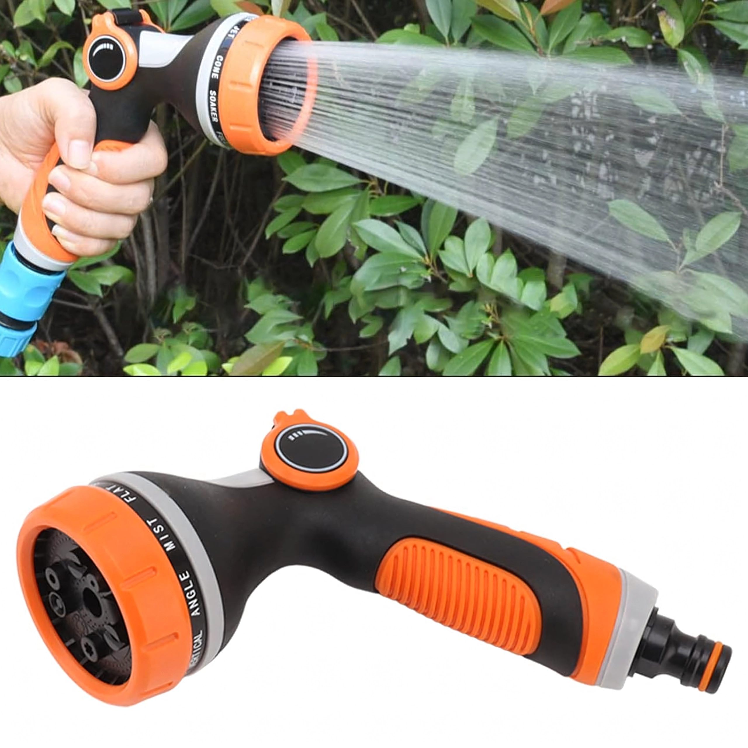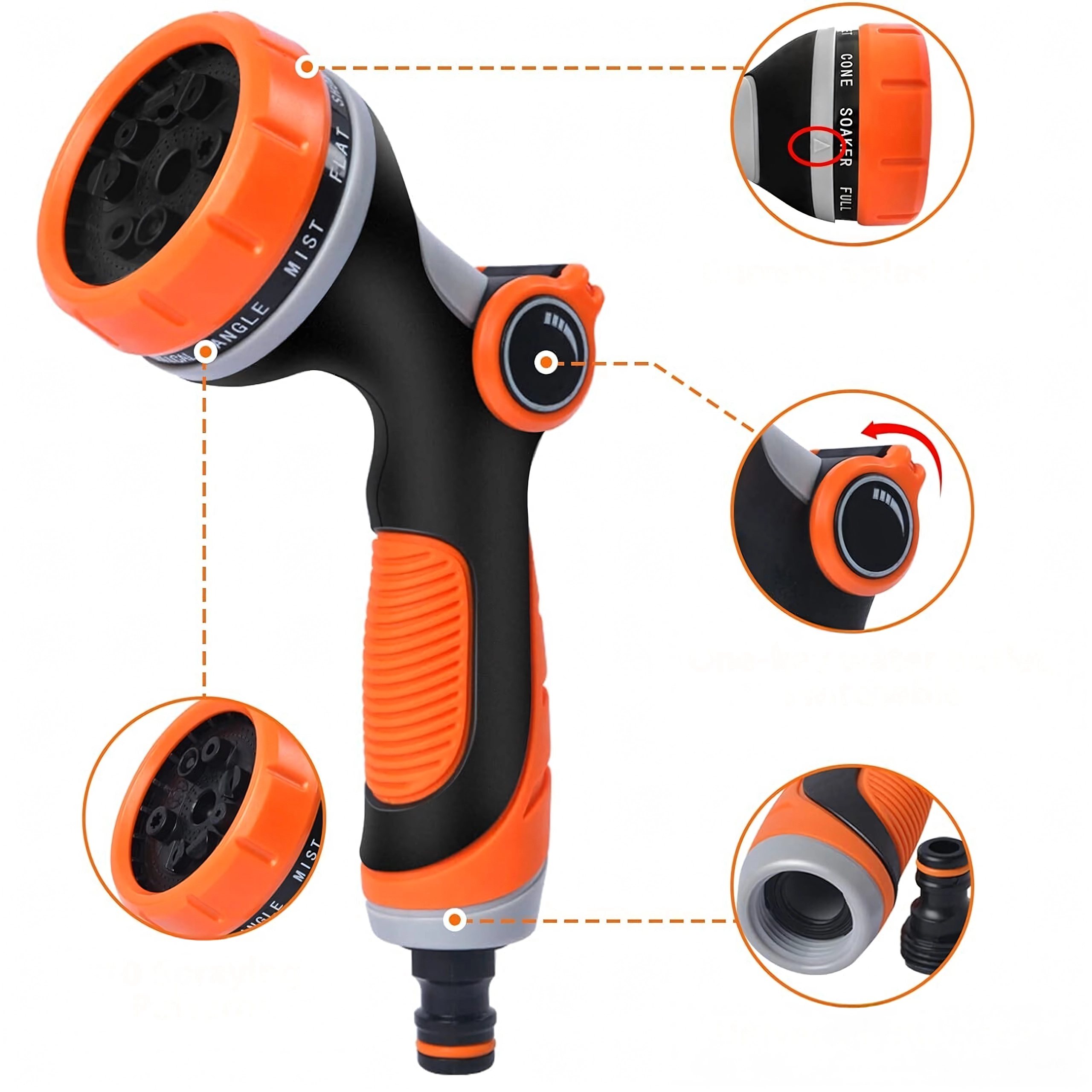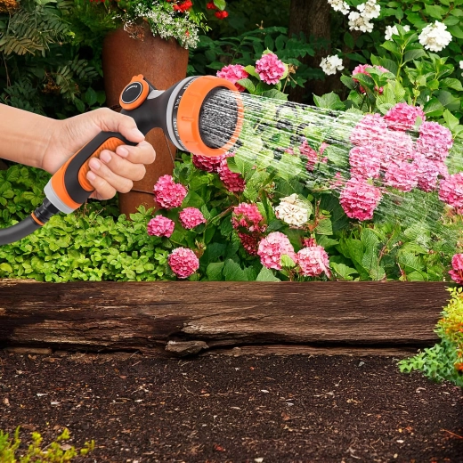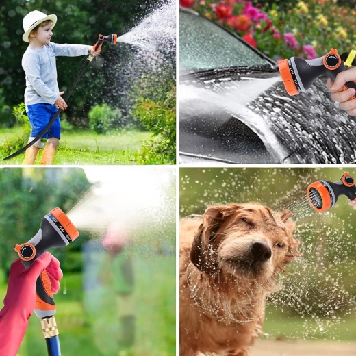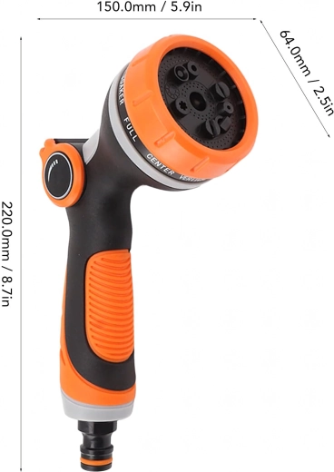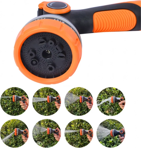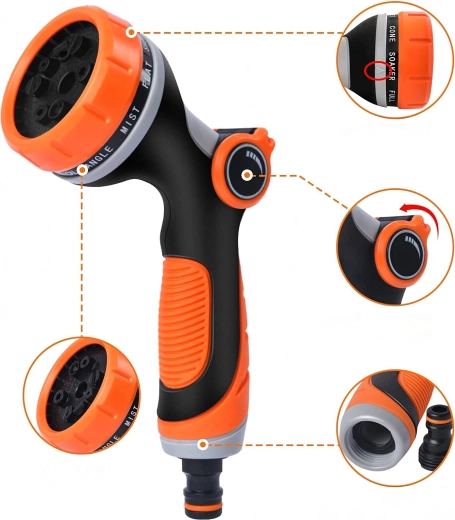 Többféle szórásmód közül választhat (pl. mist/permet, full/teljes, center/középpont, vertical/függőleges, cone/kúp, jet/sugár), így kíméletesen öntözheti a virágokat, gyorsan leöblítheti a teraszt, vagy lemoshatja a kerékpárt és az autót. A fej szabványos gyorscsatlakozóval kompatibilis, ezért a legtöbb tömlőhöz könnyen csatlakoztatható.