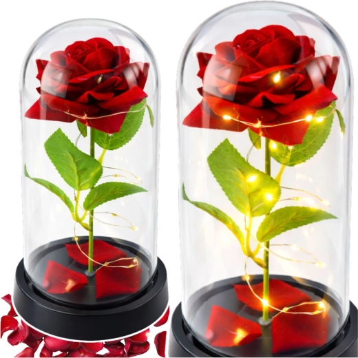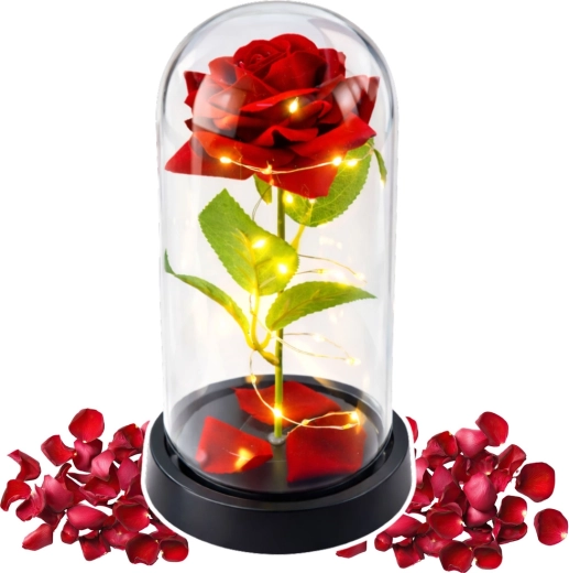 Az örök rózsa üvegkupolában a klasszikus szépséget modern megoldással ötvözi. A meleg LED mikro‑fényfüzér finoman körbeöleli a virágot, kiemelve mélypiros árnyalatát, míg az átlátszó üvegbura védi a dekorációt a portól. A stabil fekete talp jól illik a nappaliba, hálószobába vagy irodába.