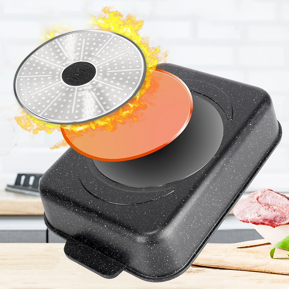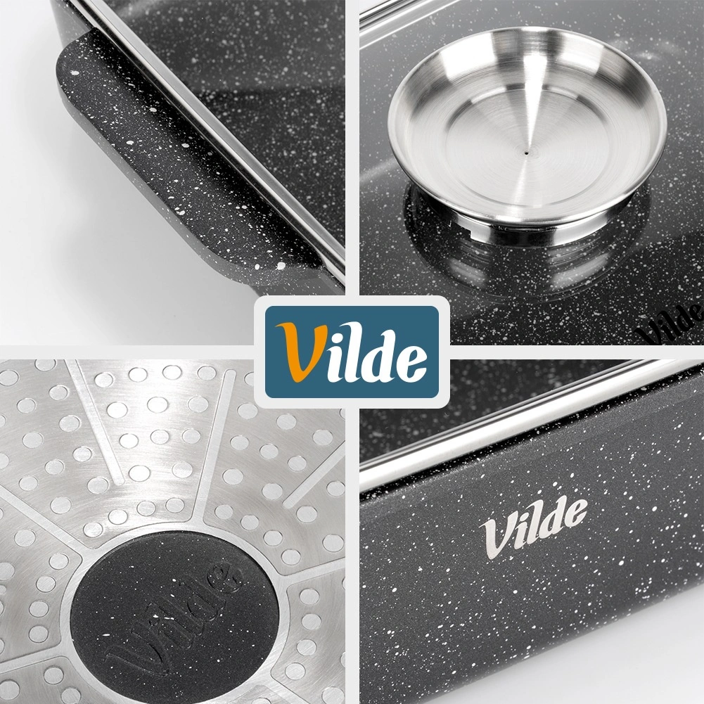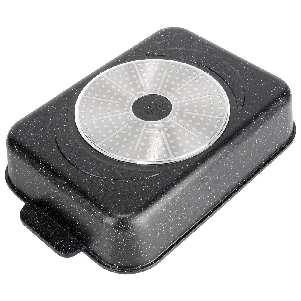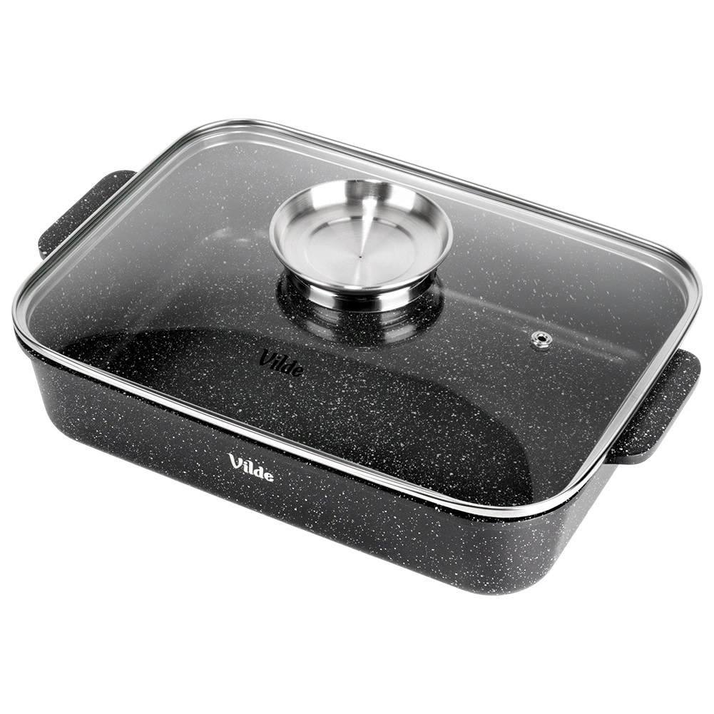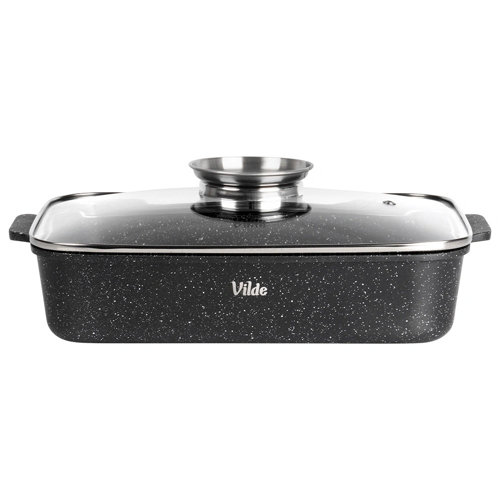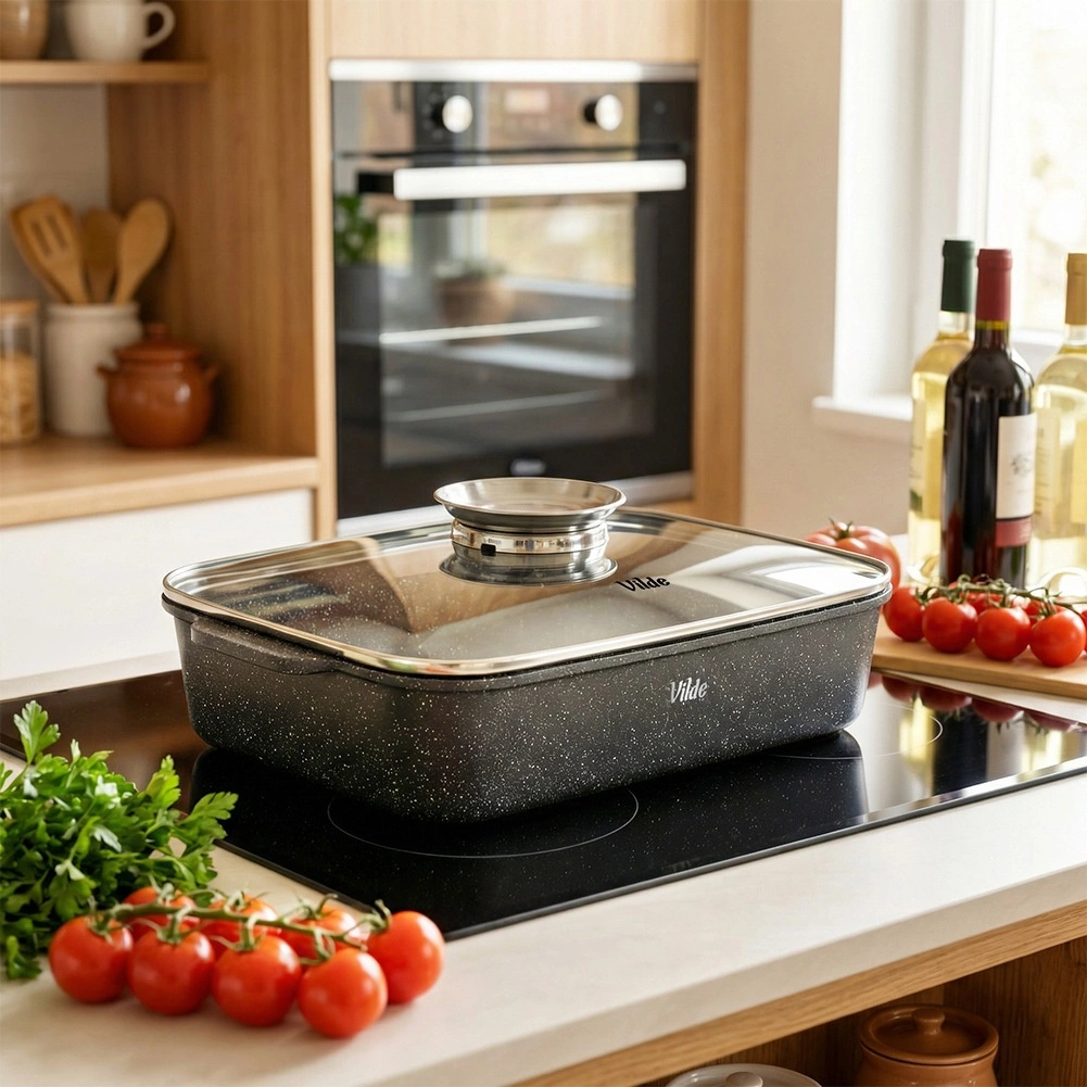 A nyomásos öntésű alumíniumból készült, téglalap alakú tepsi tartós, gránit tapadásmentes bevonattal egyenletesen oszlatja el a hőt, és tovább melegen tartja az ételeket. A üvegfedő gőzszeleppel és integrált folyékony fűszeradagolóval lehetővé teszi víz vagy bor hozzáadását nyitás nélkül, így az étel megőrzi szaftosságát és aromáját.