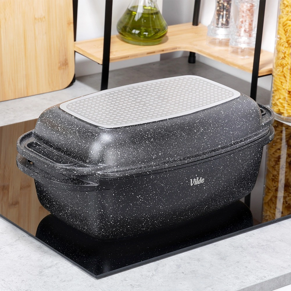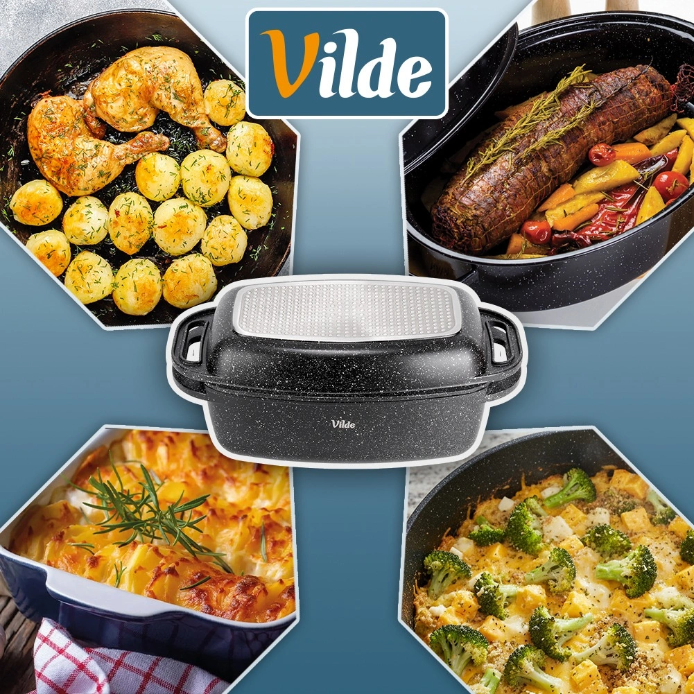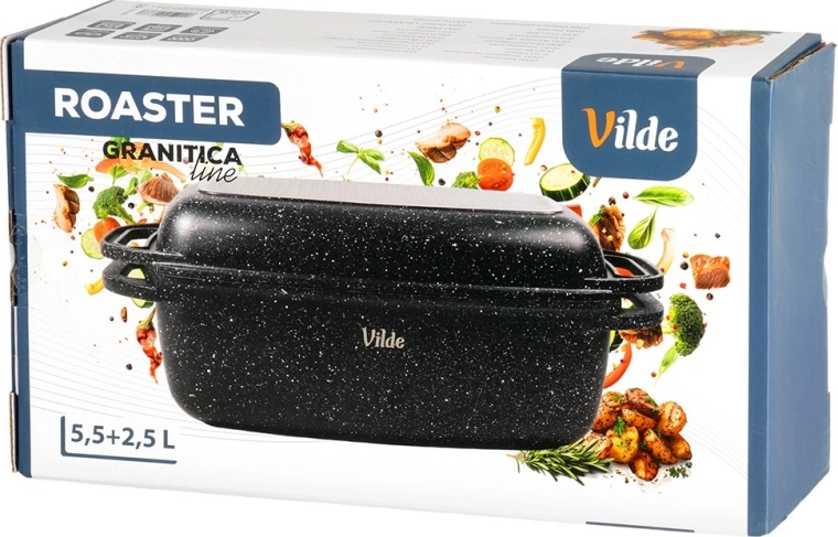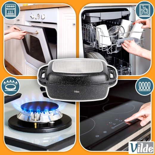 Sokoldalú felhasználás: sütőben egészen 250 °C-ig, gáztűzhelyen, elektromos, üvegkerámia és indukciós főzőlapon is. Főzés után egyszerűen tegye a mosogatógépbe. Eredeti termék VILDE – Granitica Line, európai szabványok szerint gyártva.