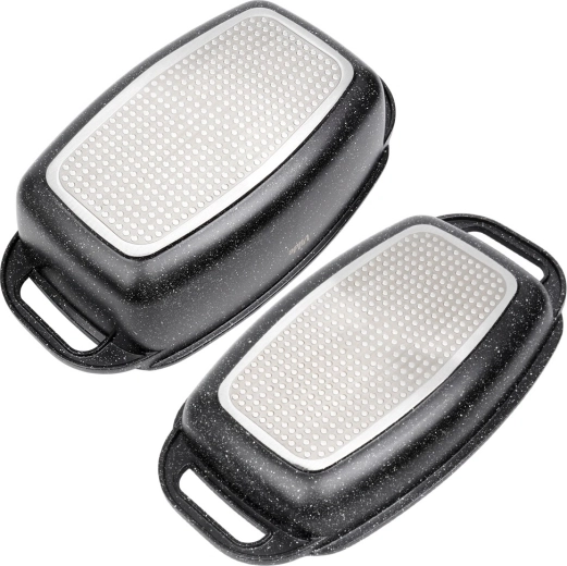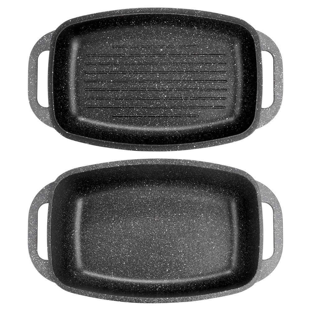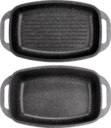 A tepsi tartós alumíniumöntvényből készül tapadásmentes gránit bevonattal, amely lehetővé teszi a minimális olajjal való főzést és a könnyű tisztítást. Az anyag kiválóan tárolja a hőt, így az ételek tovább maradnak melegek és egyenletesen átsültek. Az ergonomikus fogantyúk mindkét részen biztosítják a biztonságos mozgatást.