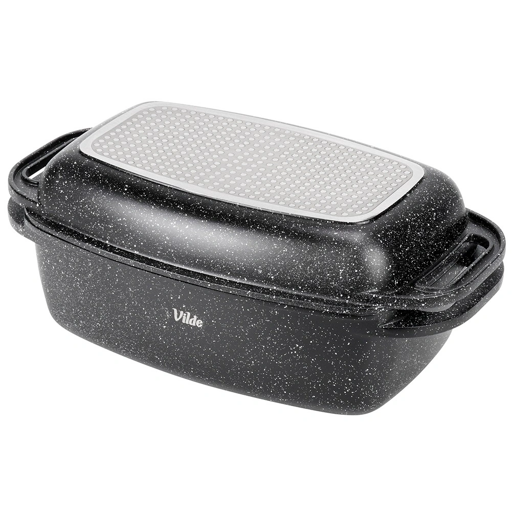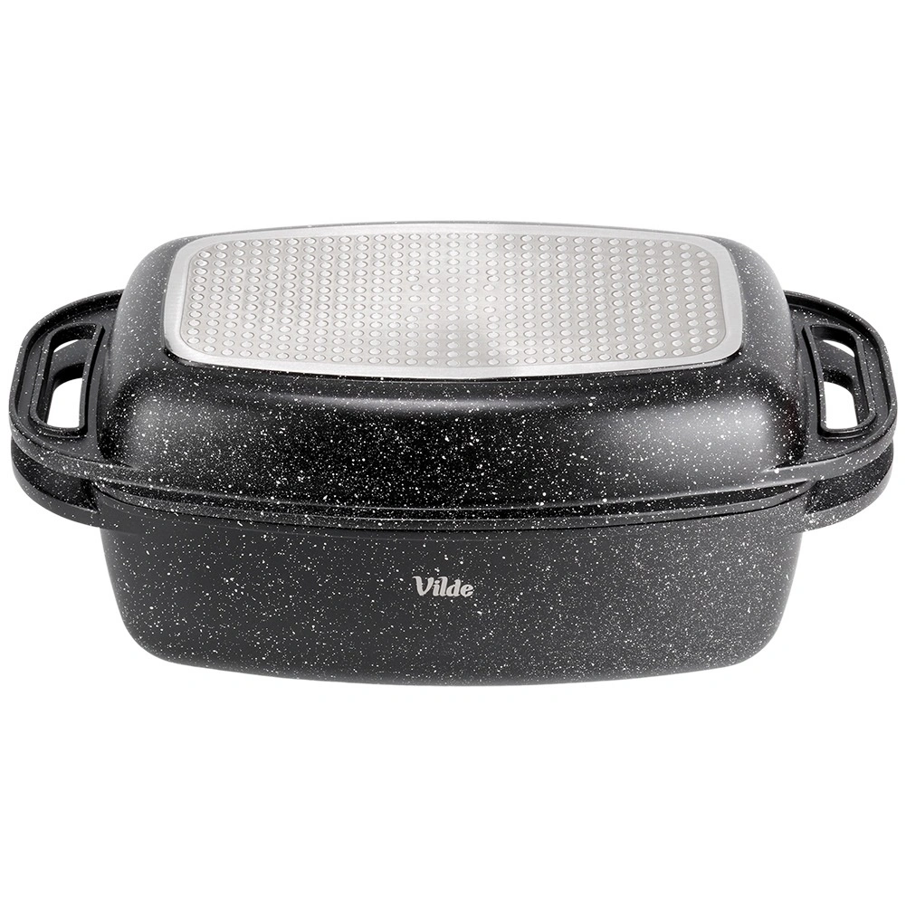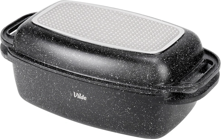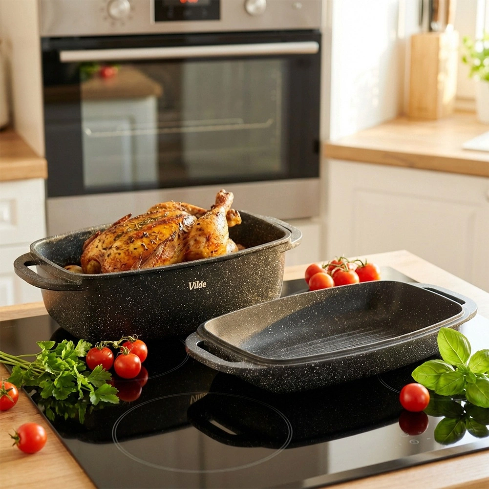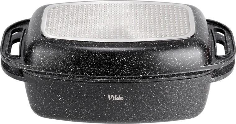 Praktikus gránit tepsi 2 az 1-ben fedővel sütéshez, pároláshoz és rakott ételekhez. A fedő önálló serpenyőként/grillserpenyőként is használható. Alumíniumöntvény tapadásmentes gránit felülettel, indukciós talp és biztonságos fogantyúk a könnyű kezelhetőségért. Űrtartalom 5,5 l + 2,5 l, méret 40 × 22,5 cm, ellenállás 250 °C-ig, sütőben és minden típusú főzőlapon, valamint mosogatógépben is használható. VILDE Granitica.