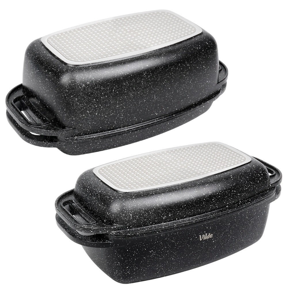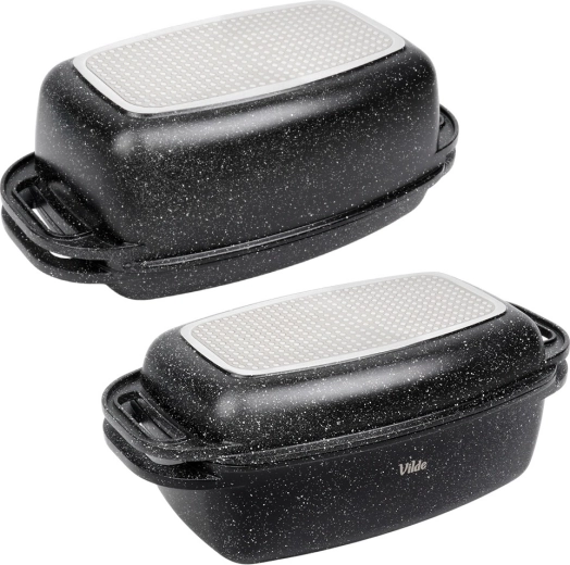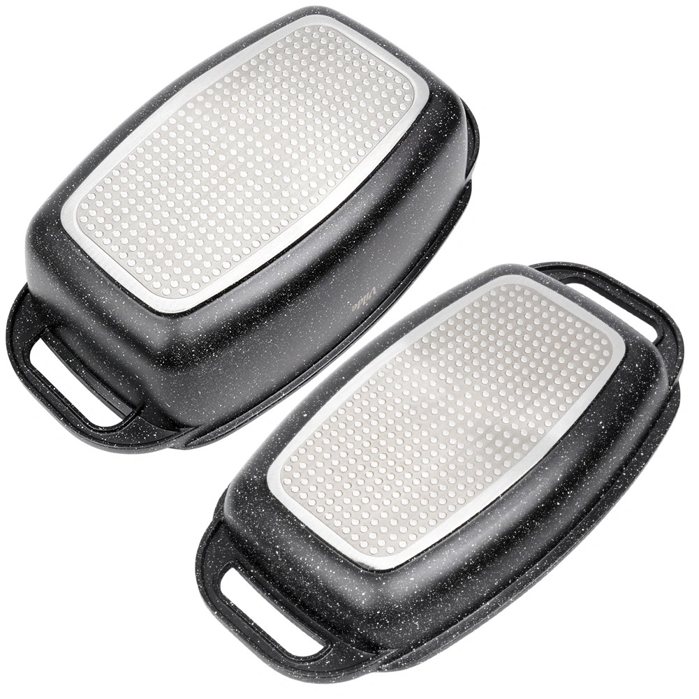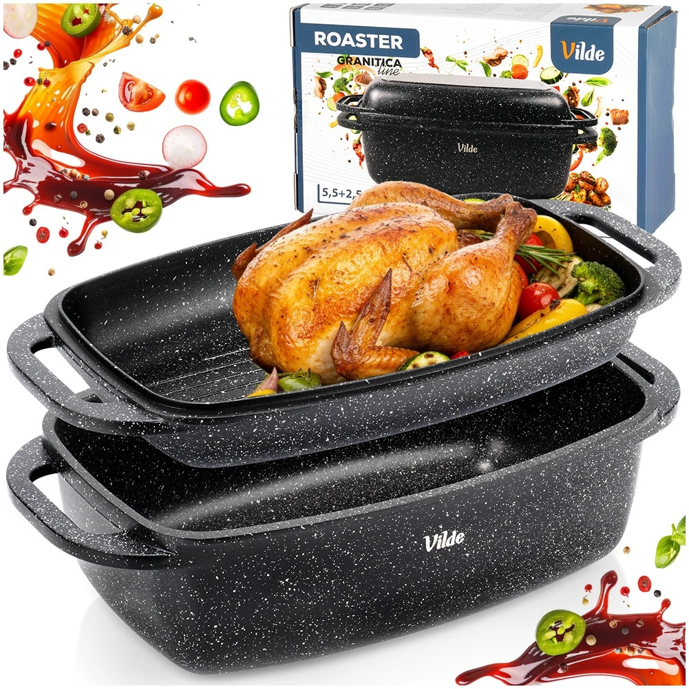 Praktikus gránit tepsi 2 az 1-ben fedővel sütéshez, pároláshoz és rakott ételekhez. A fedő önálló serpenyőként/grillserpenyőként is használható. Alumíniumöntvény tapadásmentes gránit felülettel, indukciós talp és biztonságos fogantyúk a könnyű kezelhetőségért. Űrtartalom 5,5 l + 2,5 l, méret 40 × 22,5 cm, ellenállás 250 °C-ig, sütőben és minden típusú főzőlapon, valamint mosogatógépben is használható. VILDE Granitica.