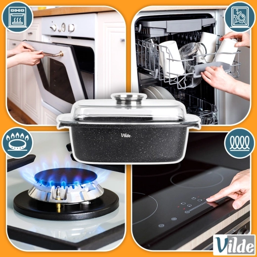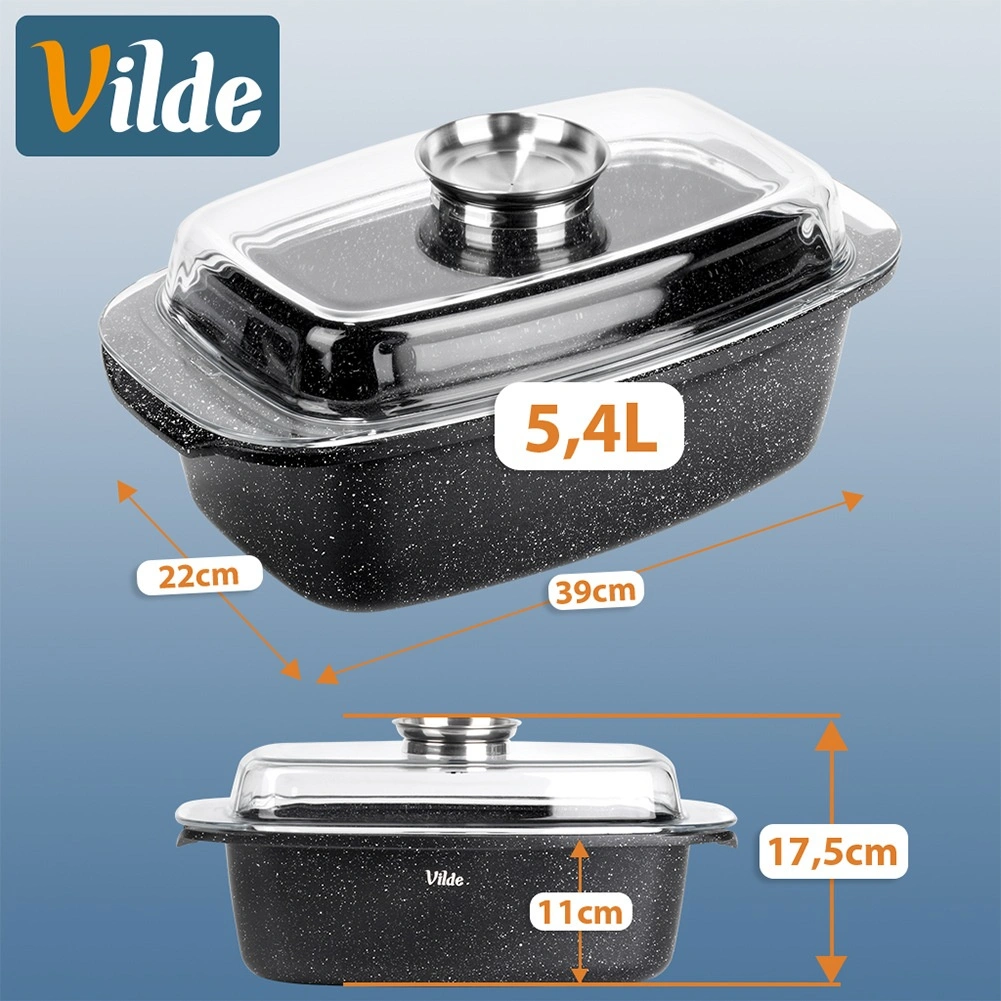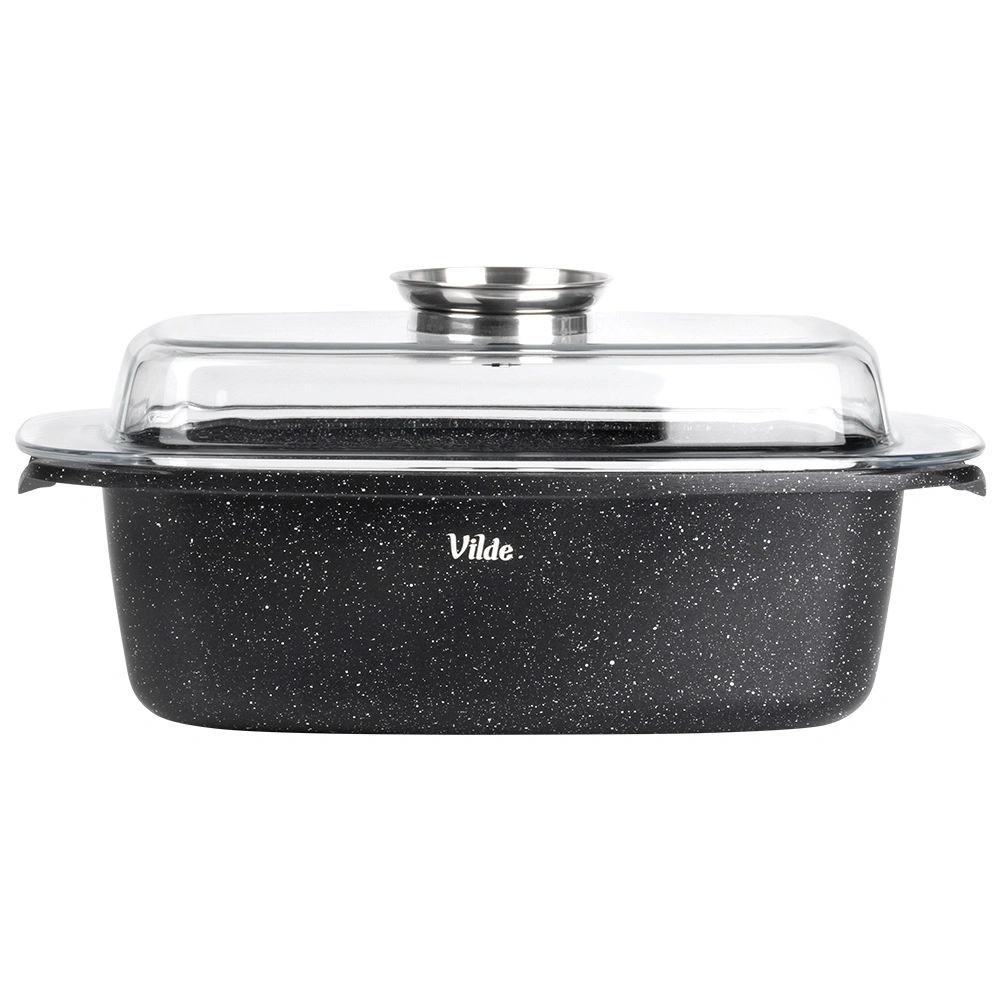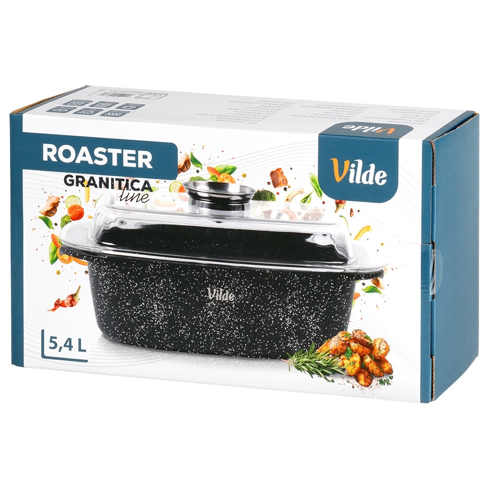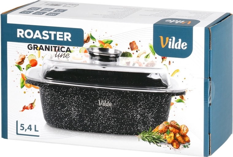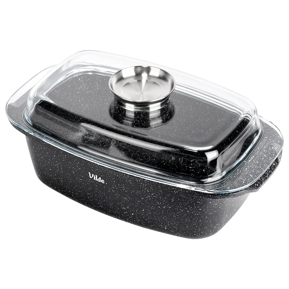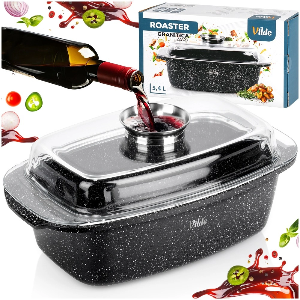 Praktikus, 5,4 l űrtartalmú gránit tepsi hőálló üvegfedővel és folyékony fűszeradagolóval. Ideális sütéshez, pároláshoz és rakott ételekhez húsokhoz, zöldségekhez és egytálételekhez. Tartós, öntött alumíniumból készült, tapadásmentes gránit bevonattal, amely lehetővé teszi a főzést minimális zsiradékkal és kiválóan tartja a hőt. Használható sütőben és minden tűzhelytípuson, beleértve az indukciót is, könnyen tisztítható és mosogatógépben is mosható.