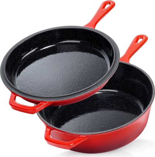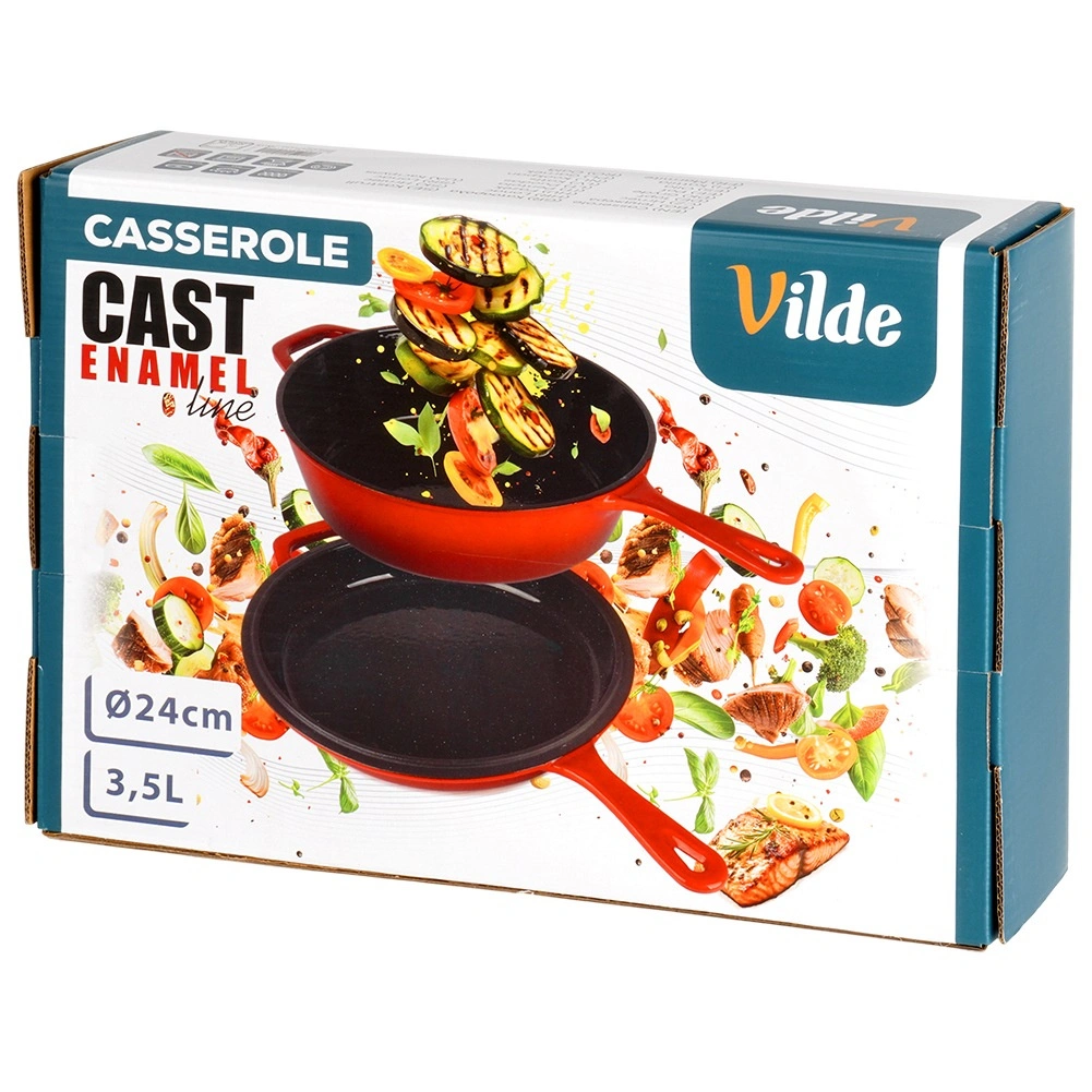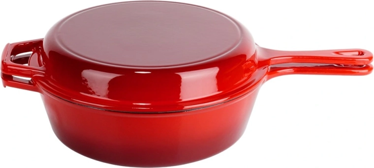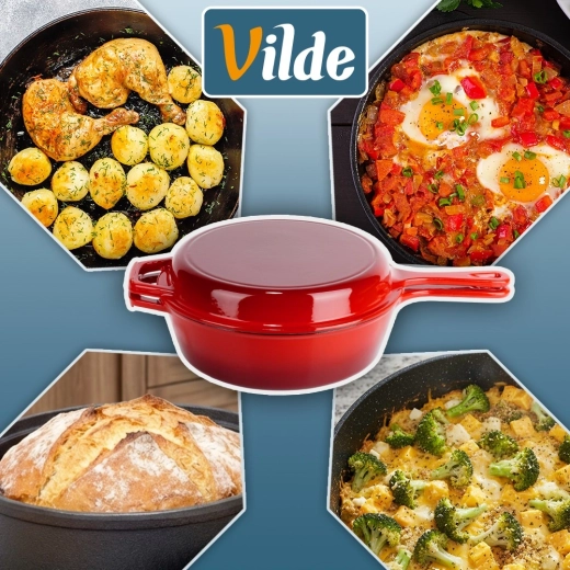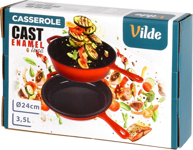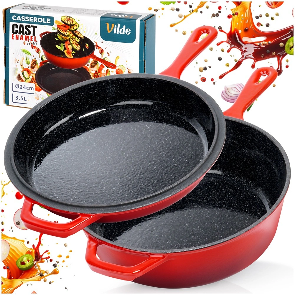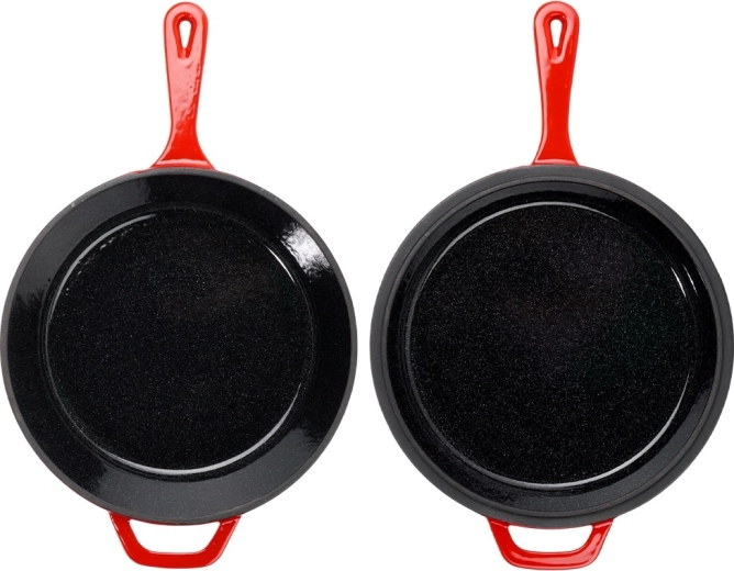 A robusztus, piros színű öntöttvas készlet egy mély lábast/nyeles lábast (3,5 l) és egy 24 cm átmérőjű serpenyőt kombinál. A belső fekete zománc sima és könnyen tisztítható, kívül fényes piros zománc védi az edényt. Az öntöttvas kiválóan vezeti és tartja a hőt, így szaftos húst, ropogós burgonyát és aromás zöldségeket készíthet kevesebb energiafelhasználással.