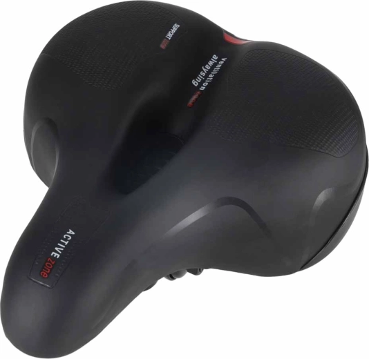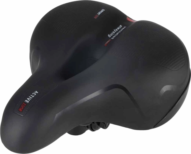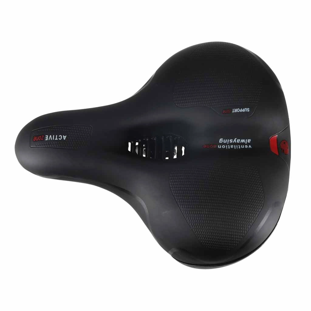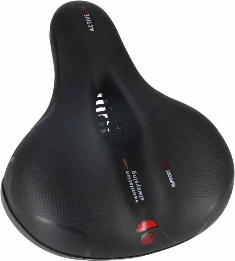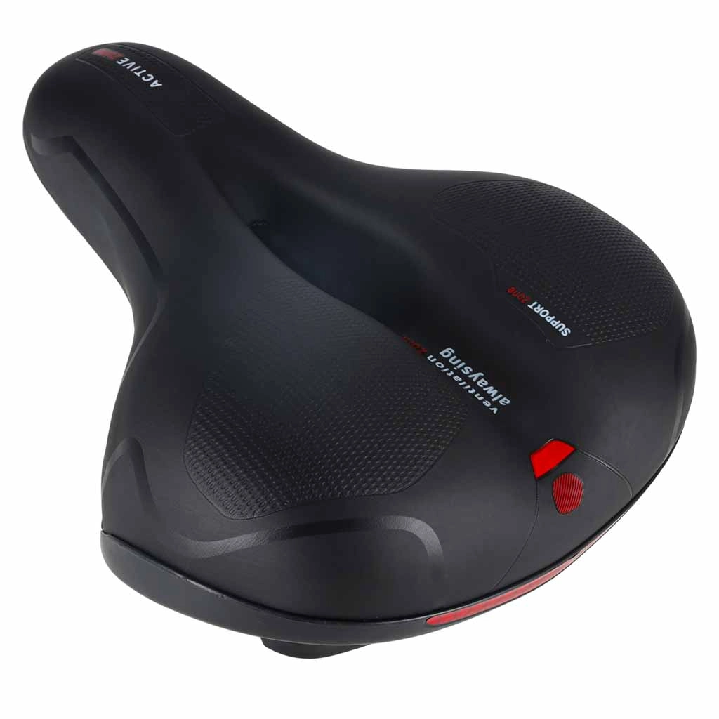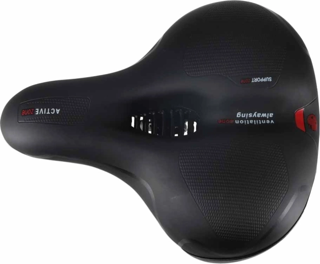 Kényelmes kerékpárnyereg városi és trekking használatra, széles ergonomikus formával, rugalmas habbetéttel és kettős rugós csillapítással az egyenletes, nyomáspontoktól mentes utazáshoz. A központi szellőzőcsatorna levegősen tartja a nyerget, a vízálló PU bőr felület ellenáll az esőnek, a beépített hátsó prizma pedig növeli a láthatóságot sötétedés után.