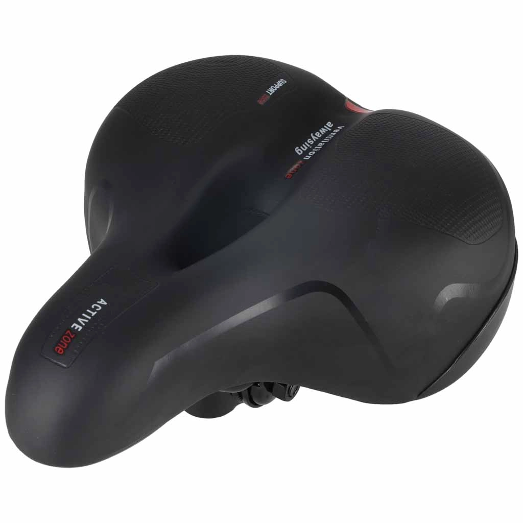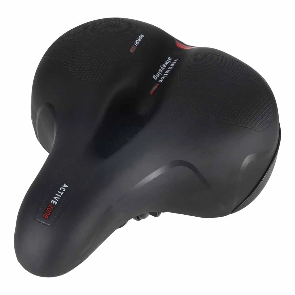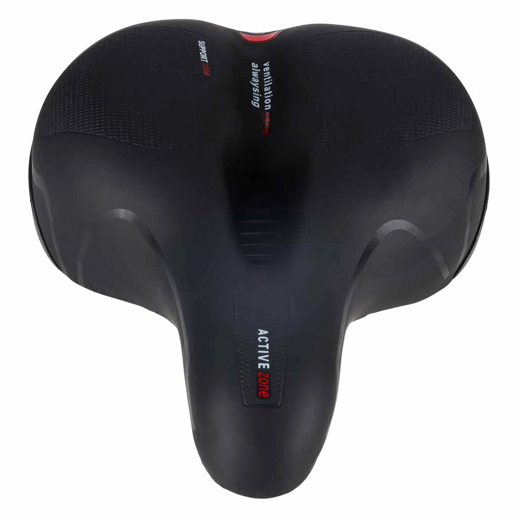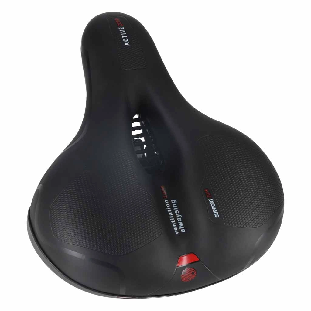 Kényelmes kerékpárnyereg városi és trekking használatra, széles ergonomikus formával, rugalmas habbetéttel és kettős rugós csillapítással az egyenletes, nyomáspontoktól mentes utazáshoz. A központi szellőzőcsatorna levegősen tartja a nyerget, a vízálló PU bőr felület ellenáll az esőnek, a beépített hátsó prizma pedig növeli a láthatóságot sötétedés után.
