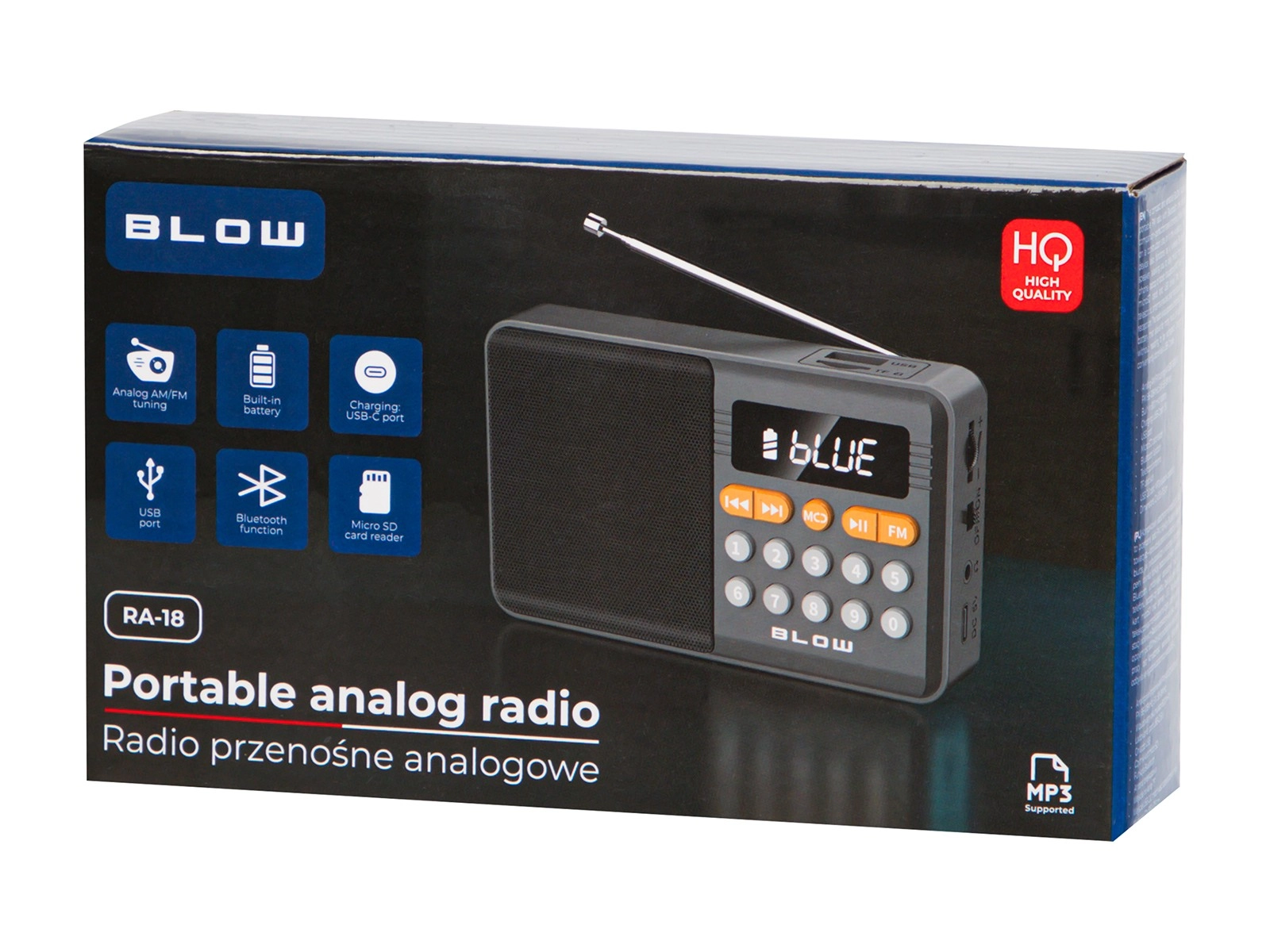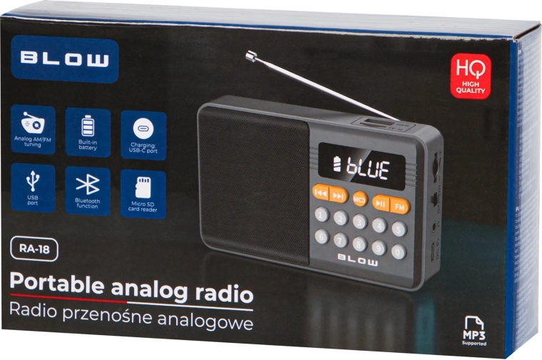 A kompakt és sokoldalú BLOW RA18 rádió ötvözi az FM vételt, a Bluetooth hangszórót és a MP3 lejátszást USB-ről és microSD-ről. A teleszkópos antenna tiszta jelet biztosít, a beépített 800 mAh akkumulátor pedig órákon át tartó működést nyújt. A praktikus USB‑C töltés és a hordozható kialakítás ideális társsá teszi utazáshoz, műhelybe és otthonra is.