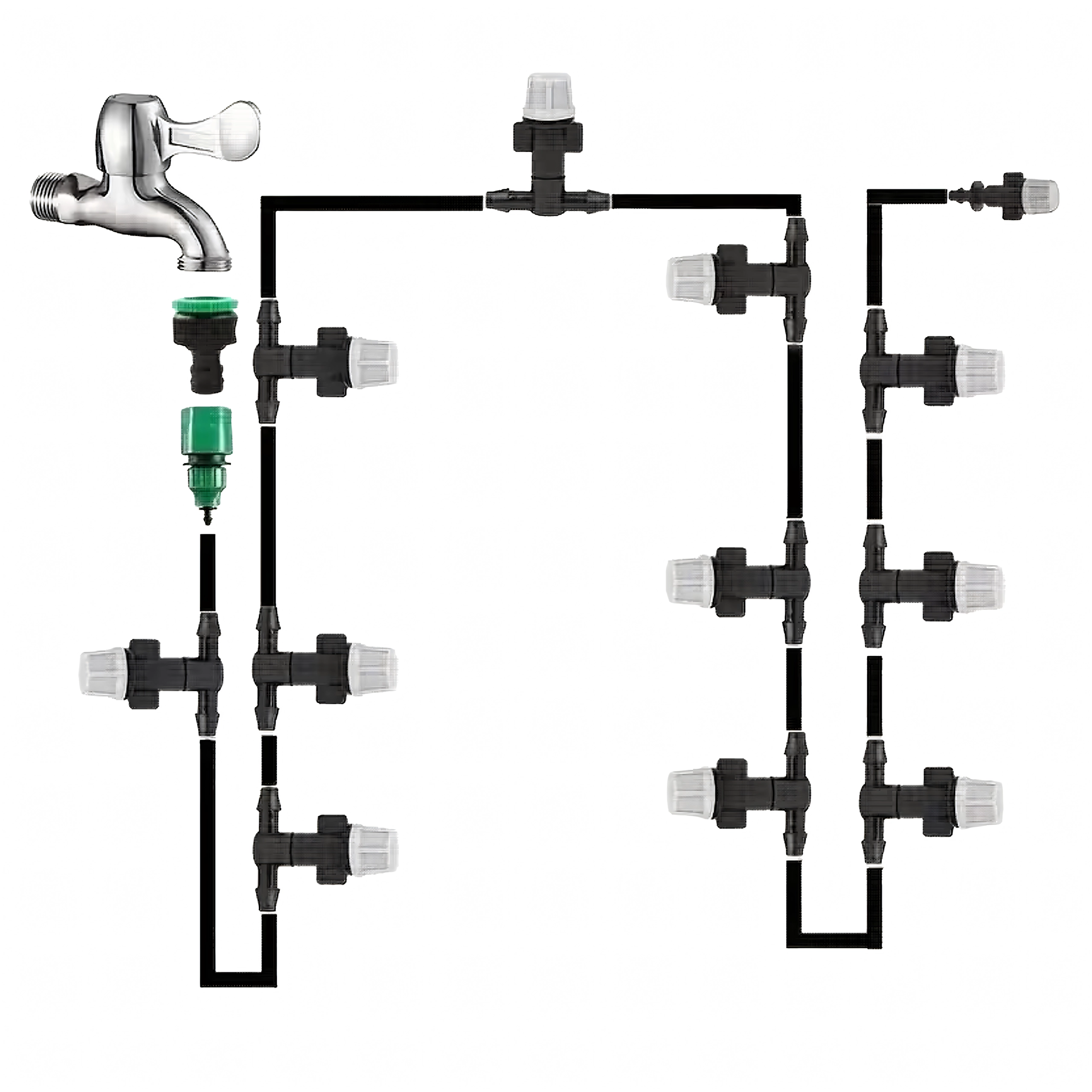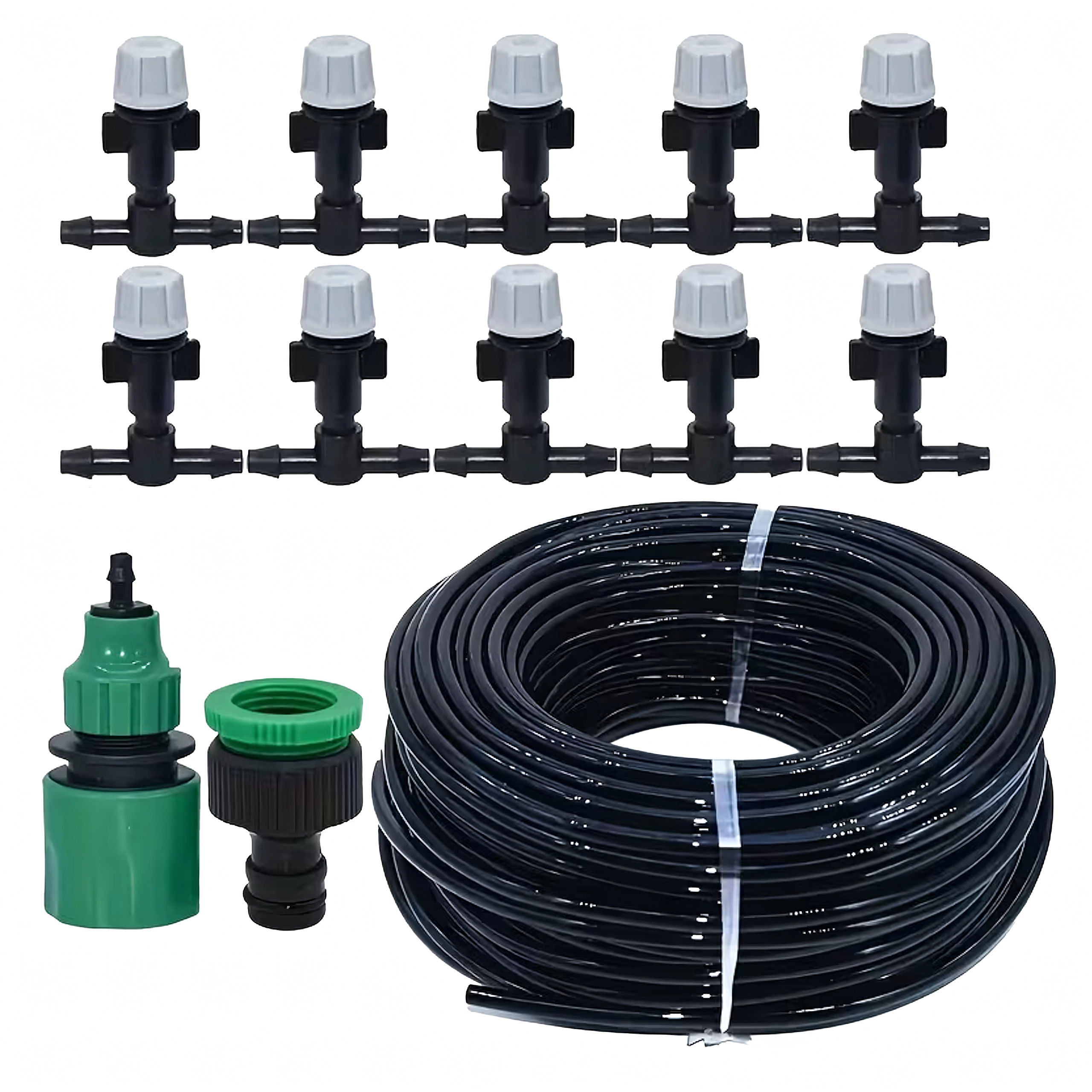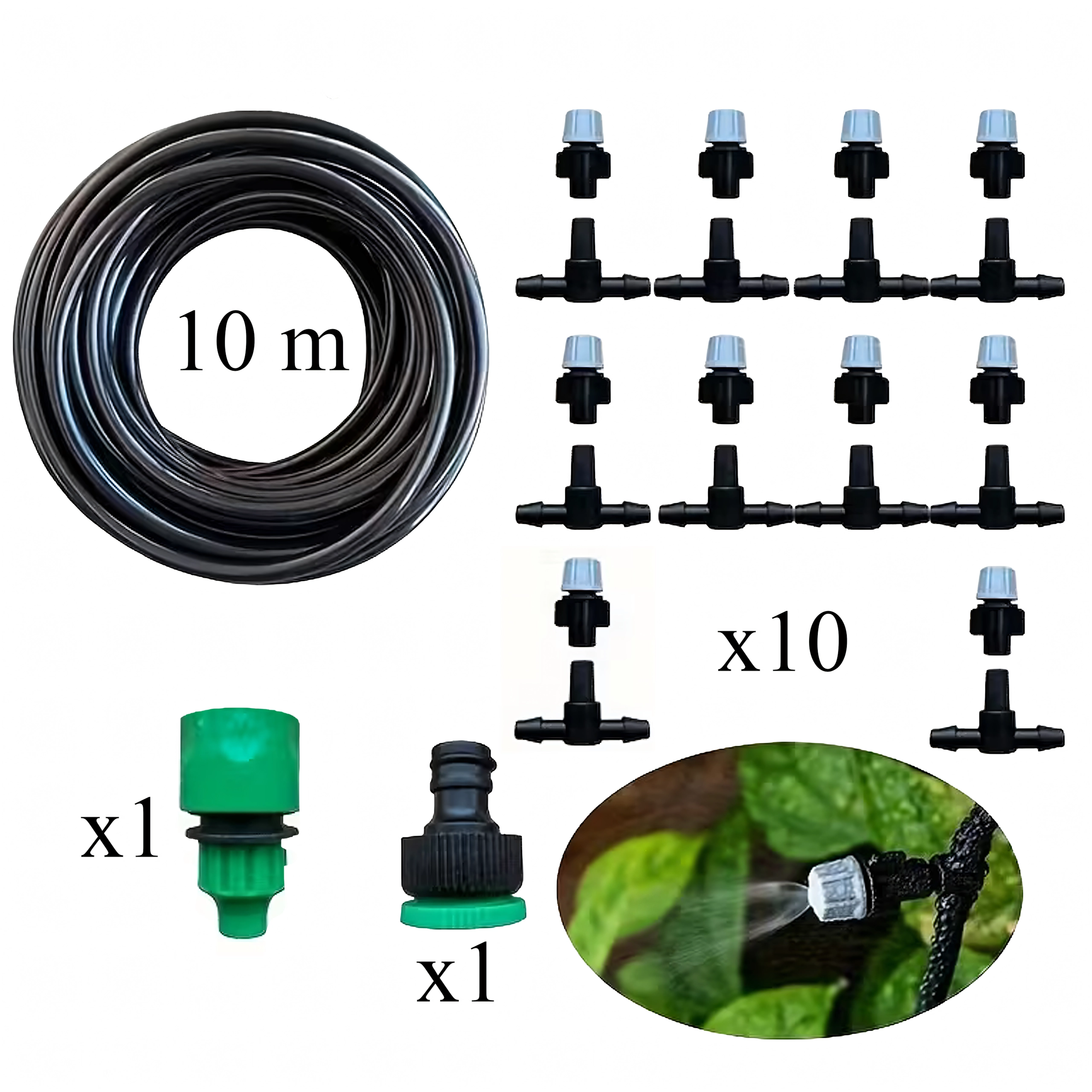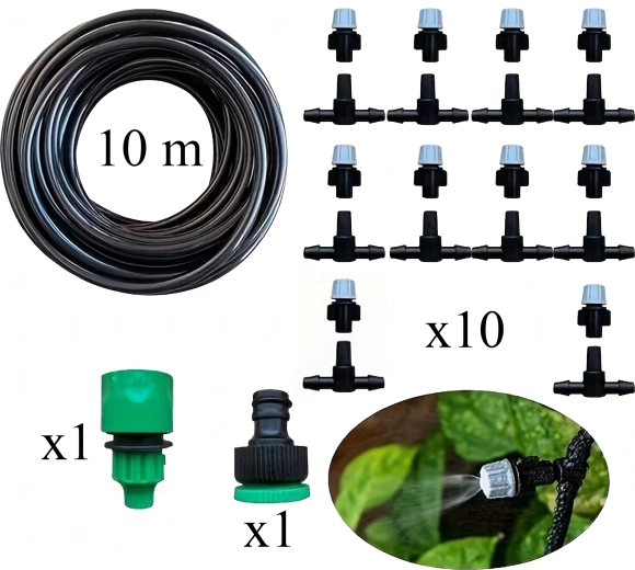 Tartalmaz tömlőt, állítható emittereket, T-csatlakozókat és csapadaptert a gyors telepítéshez és a víz több pontra történő elosztásához.