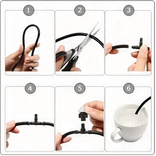 A telepítés gyors: csatlakoztassa a tömlőt a mellékelt adapterrel a vízcsaphoz, vezesse el a 10 m-es csövet, helyezze el a fúvókákat, majd finomhangolja az irányt és az intenzitást. A tartós anyagok kültéri használatra alkalmasak, míg az állítható emitterek minimalizálják a vízfogyasztást és megelőzik a túlöntözést.