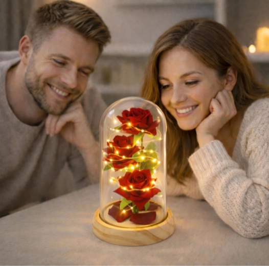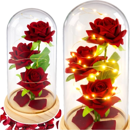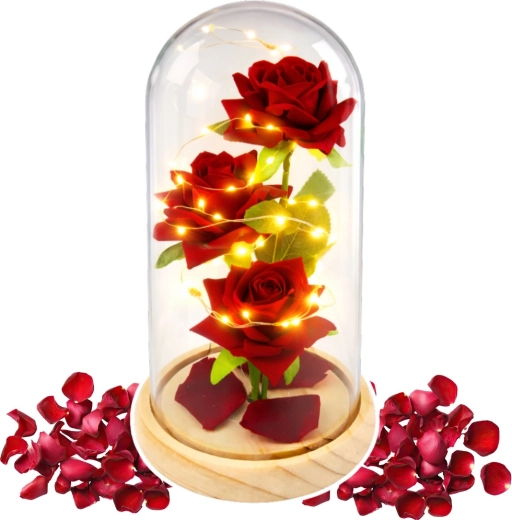 Az üvegkupolába zárt örök rózsák a időtlen eleganciát és a modern dizájnt ötvözik. A finom LED fényfüzér körbeöleli a szirmokat, kiemelve a mélyvörös árnyalatot, így meghitt, romantikus esti fényt teremt. A dekoráció remekül mutat asztalon, komódon vagy éjjeliszekrényen, és illik otthonokba, éttermekbe és szállodákba is.