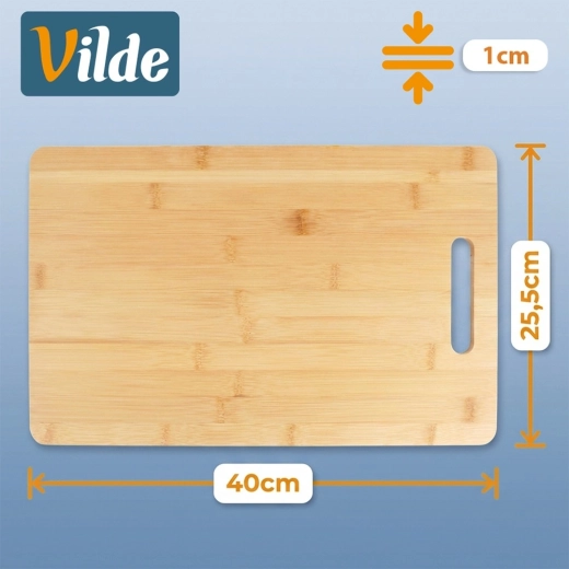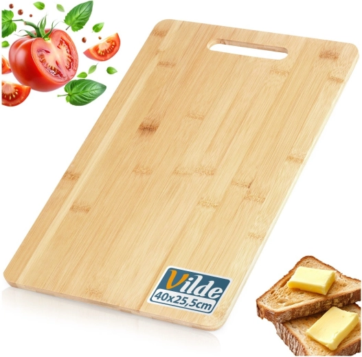 Praktikus bambusz vágódeszka 40 × 25,5 cm méretben, 1 cm vastagsággal, ideális a mindennapi előkészítéshez és tálaláshoz. Tartós felületet, ergonomikus fogantyút a könnyű hordozáshoz, valamint természetes bambuszt kínál olyan tulajdonságokkal, mint a nedvességállóság és a gyors száradás.