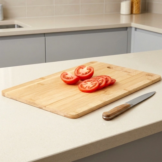 Minőségi bambuszfából készült, természetes ellenállással a nedvességgel és deformációval szemben. A felület kíméletes a kések éléhez.