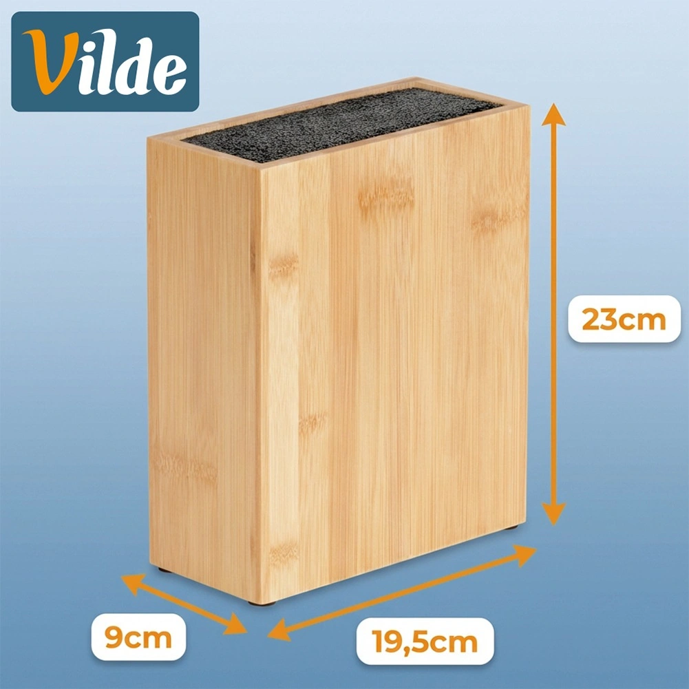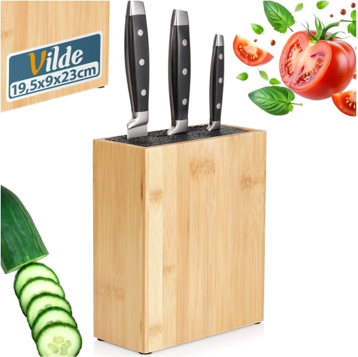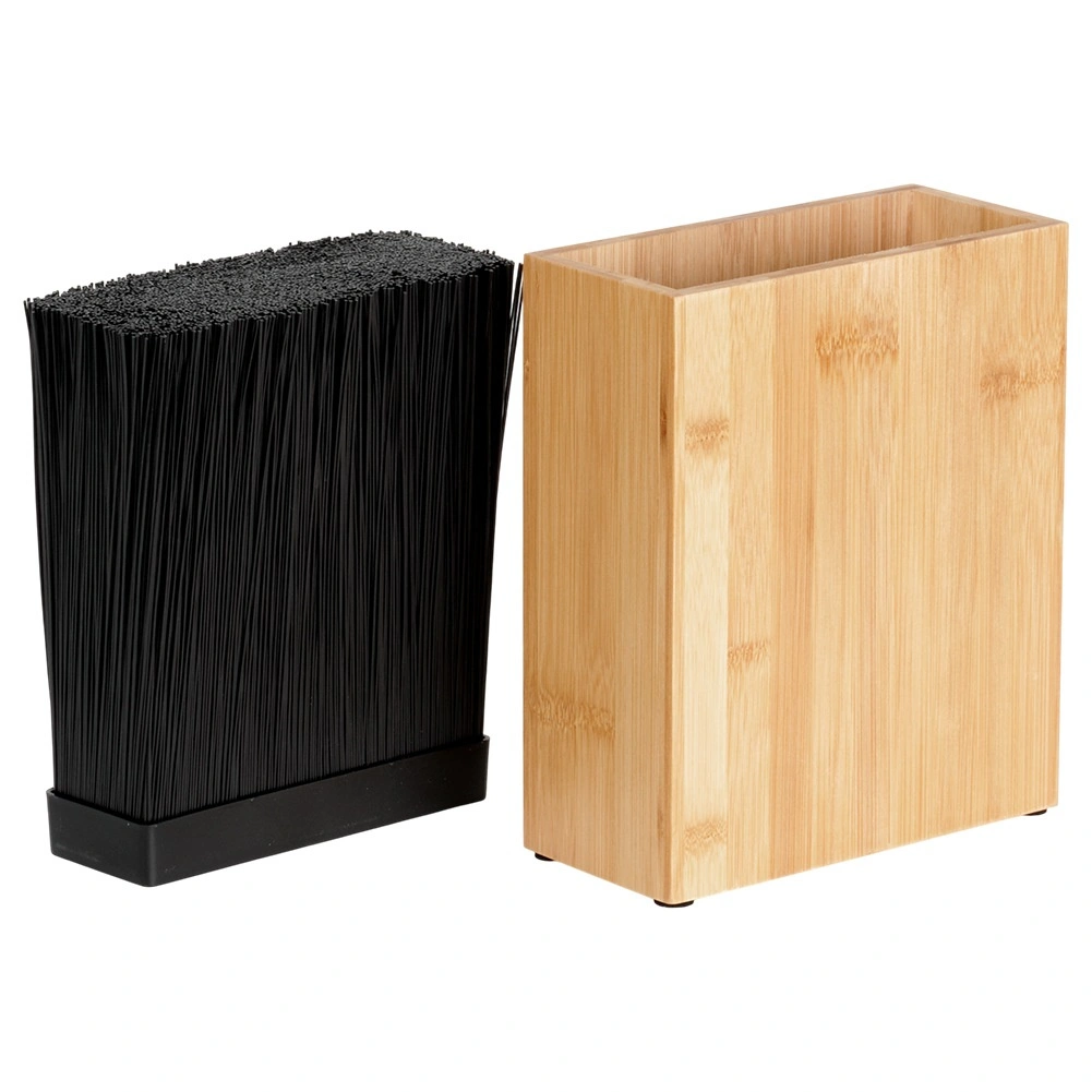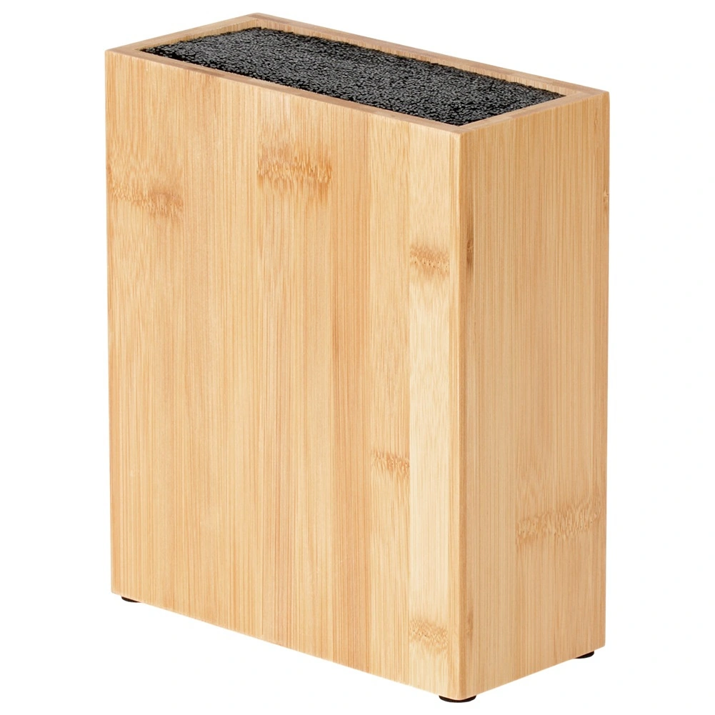 Univerzális bambusz késblokk 19,5 × 9 × 23 cm méretben a konyhakések és eszközök biztonságos, áttekinthető tárolásához. A kivehető műanyag sörtés betétnek köszönhetően különböző méretű és formájú kések is elférnek benne az él sérülése nélkül. A strapabíró bambusz természetes eleganciát kölcsönöz a konyhának, a csúszásgátló filcpárnák pedig stabilitást biztosítanak a munkalapon.