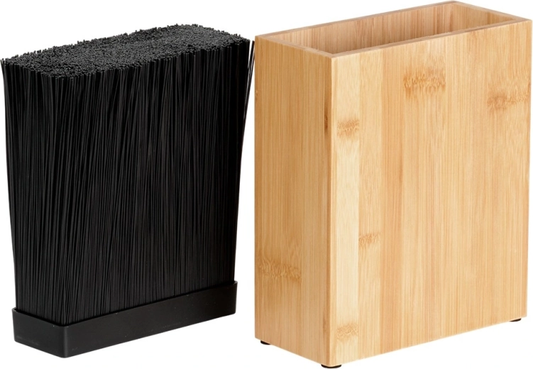 Stílusos és praktikus késblokk természetes bambuszból, hogy konyhai eszközei mindig kéznél legyenek. Az univerzális brisztol (sörtés) betét alkalmazkodik a penge formájához és szélességéhez, és megvédi az élt a koptatástól. A modern, mégis időtálló dizájn bármely konyhába illik.