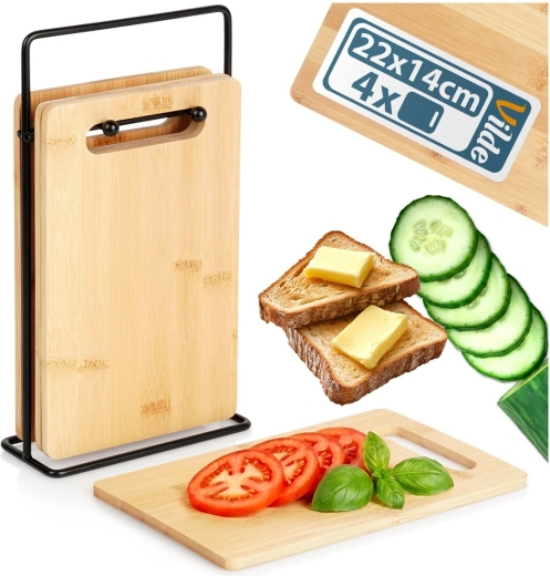 - 4 × bambusz vágódeszka, 1 × fém állvány