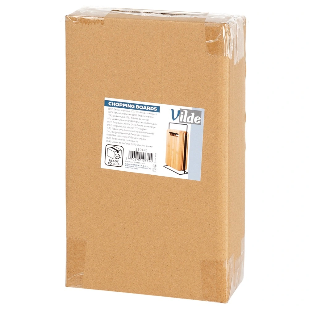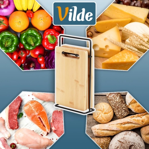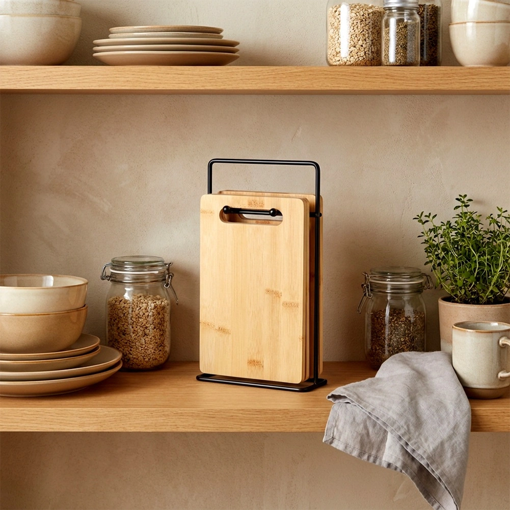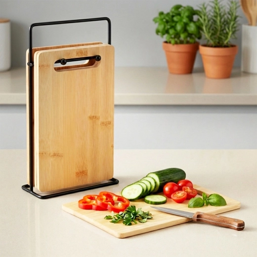 A bambusz vágódeszka-készlet ideális a mindennapi zöldség-, gyümölcs-, pékáru- és húsvágáshoz. Kompakt méretének köszönhetően nem foglal felesleges helyet a munkalapon, az állvány pedig gondoskodik róla, hogy a deszkák mindig kéznél legyenek és higiénikusan szellőzzenek. Időtálló, természetes megjelenése bármely konyhába illik.