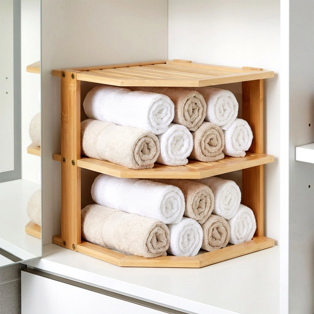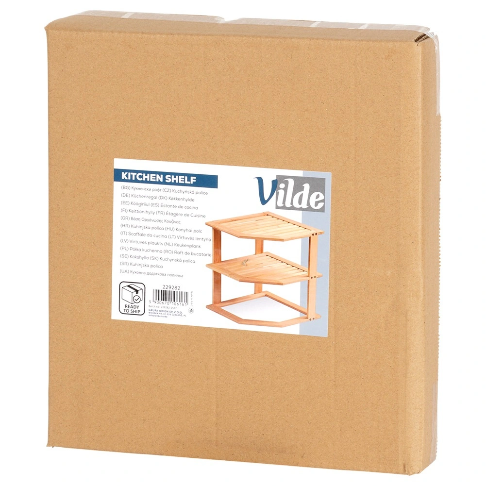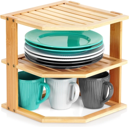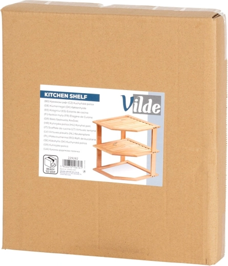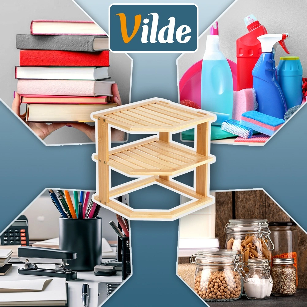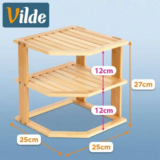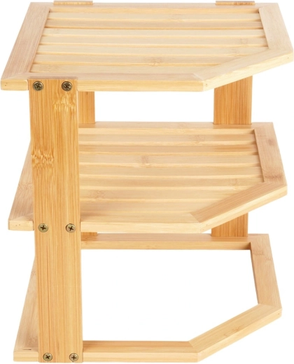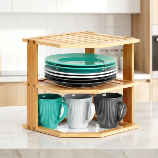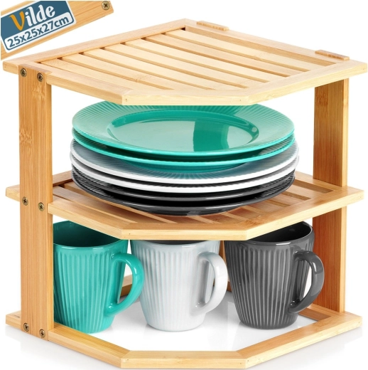 Praktikus sarokpolc bambuszfából, amely okosan kihasználja a konyhapult vagy a szekrény sarkát. A több szintes kialakításnak köszönhetően több tárolóhelyet kínál, stabil, nedvességálló és könnyen tisztítható. Ideális fűszerekhez, poharakhoz, bögrékhez vagy kozmetikumokhoz a konyhában, a kamrában és a fürdőszobában is.
