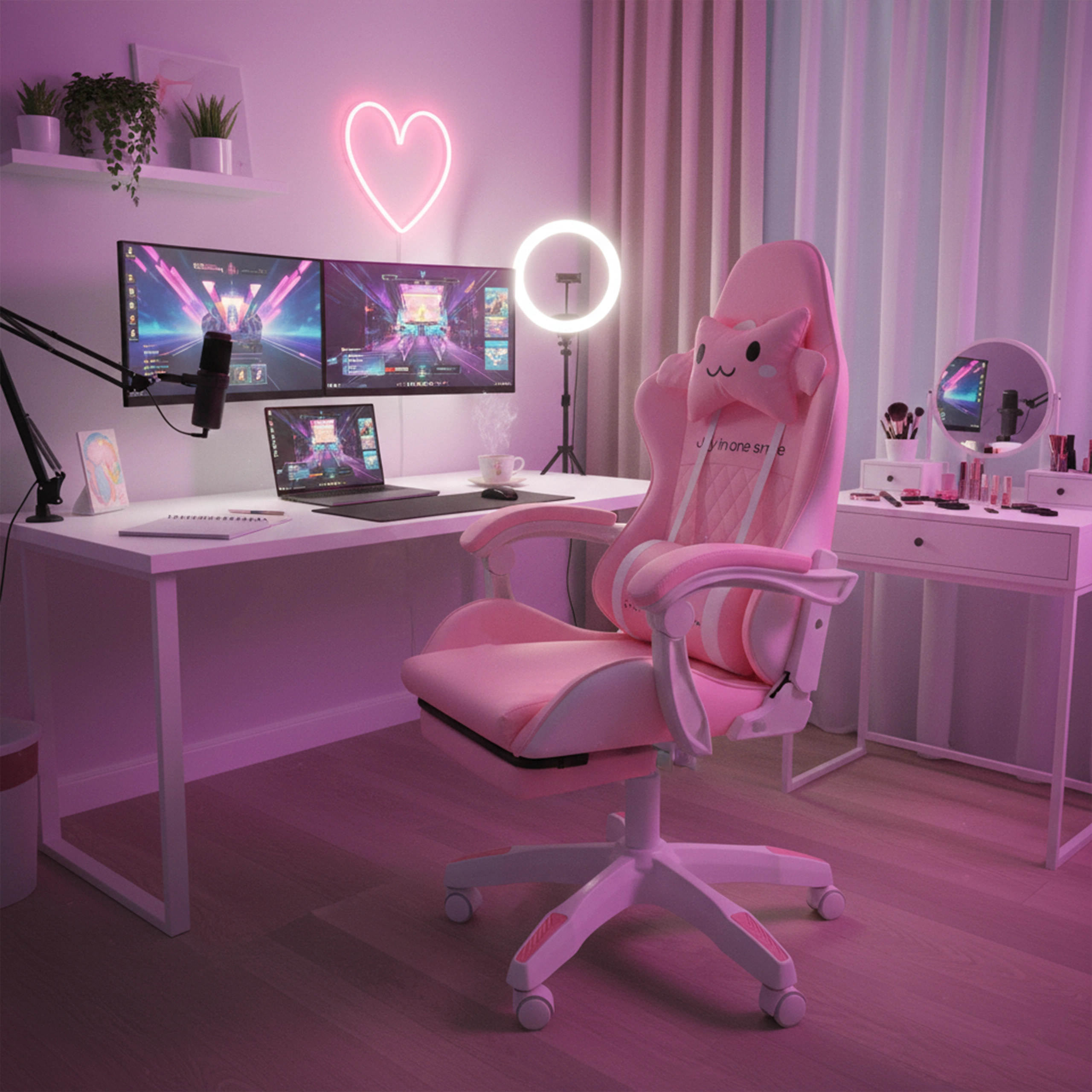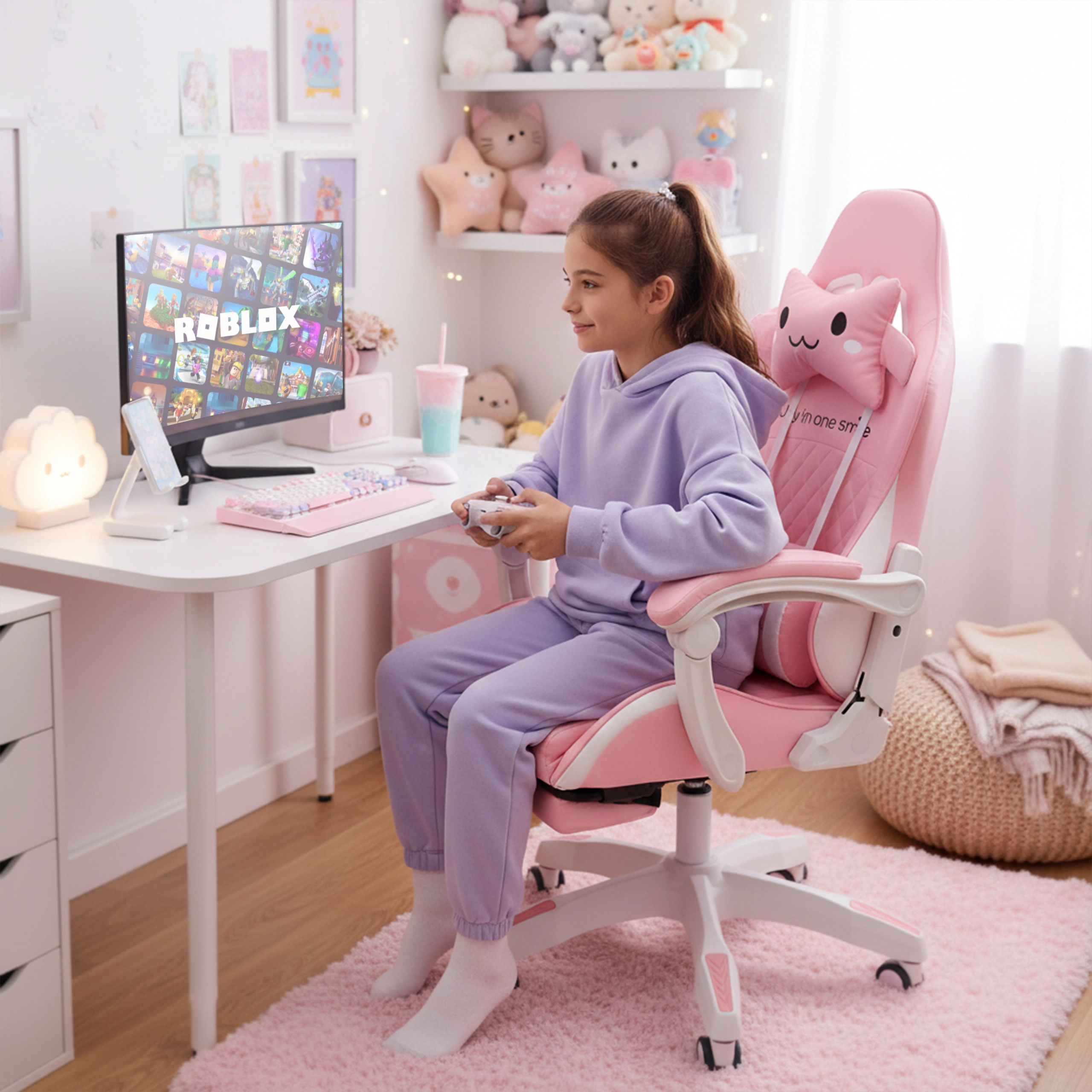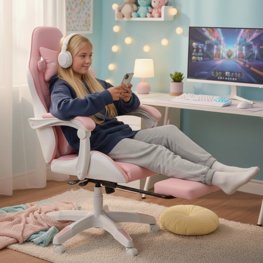 A rózsaszín gyerek gamer és irodai szék ötvözi az ergonomikus kényelmet, az állítható magasságot és a kihúzható lábtartót a gyors pihenéshez. A kagylóülés stabil háttámlával, puha, szivaccsal párnázott karfákkal és sima 360°-os forgással, görgőkkel megkönnyíti a tanulást és a játékot. A csomag része a nyak- és deréktámasz párna az egészségesebb ülésért a gyerekszobában.