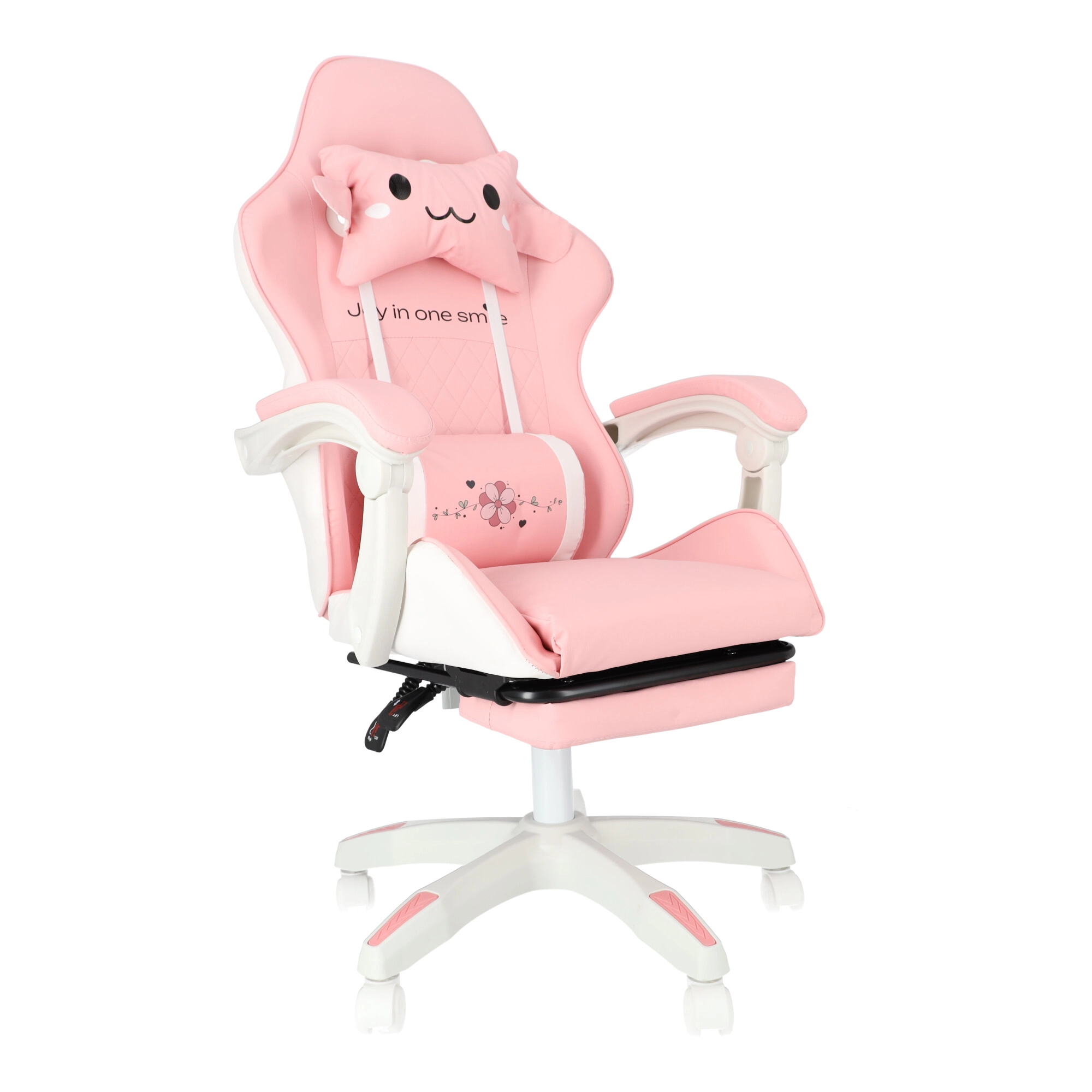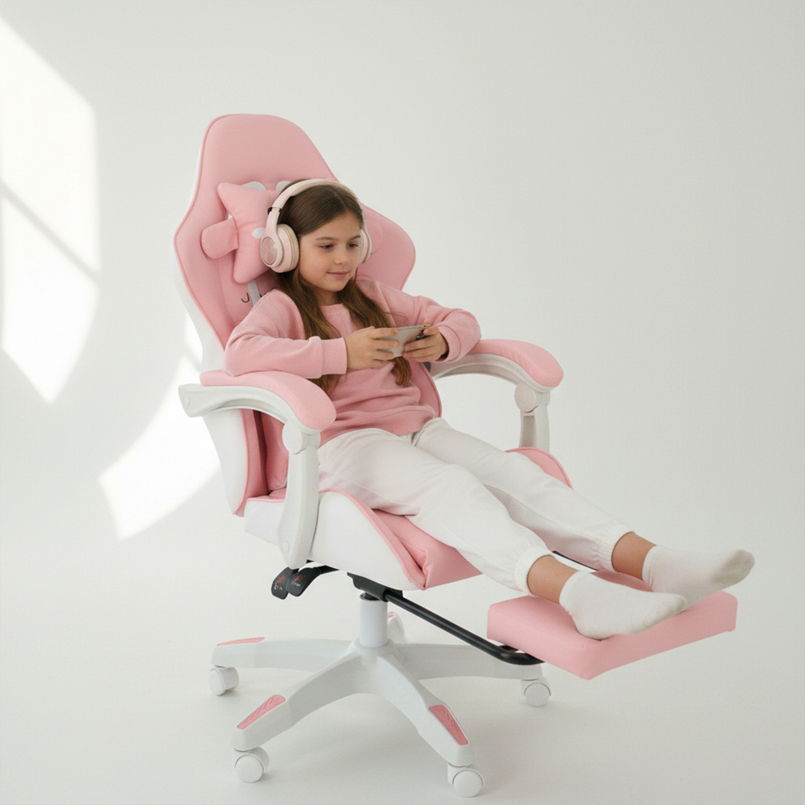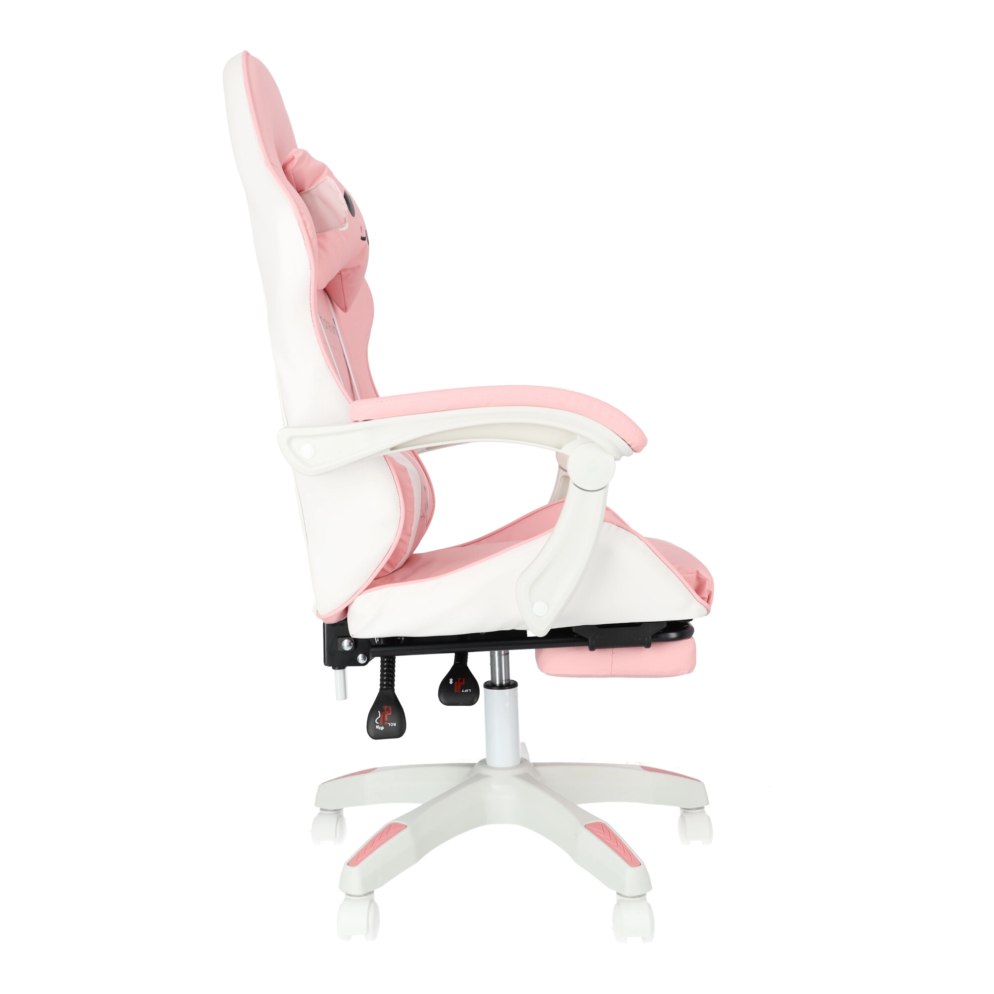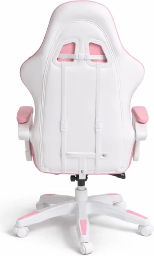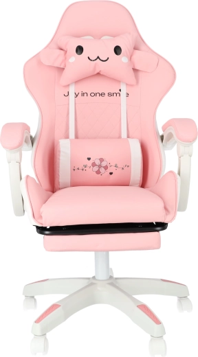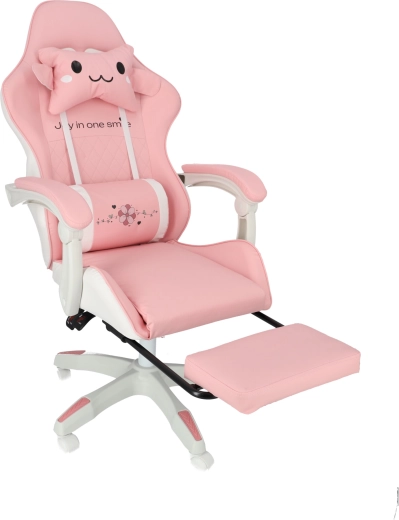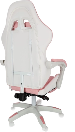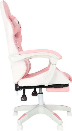 A kényelmet a párnázott karfák és a kihúzható lábtartó növelik, amelyek pillanatok alatt munkapózból pihenőhelyzetté alakítják az ülést. A masszív talp 360°-os forgómechanizmussal és görgőkkel könnyű mozgást biztosít a szobában. A stílusos rózsaszín-fehér kivitel modern gyerek- és diákszobákba illik.