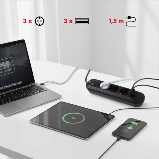 Három Schuko aljzat és három USB port teszi lehetővé, hogy egyszerre üzemeltessen készülékeket és töltsön telefont vagy tabletet további adapterek nélkül.