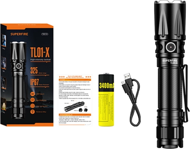 A Superfire TL01-X egy masszív, taktikai zseblámpa, amelyet profiknak és outdoor rajongóknak terveztek. A 1800 lm magas fényerő és a 325 m hatótáv minden helyzetben biztos láthatóságot nyújt, míg az IP67 védettségű alumíniumötvözet ház ellenáll a pornak és a víznek. Beépített védelmek óvják az elektronikát és az akkumulátort, így hosszú élettartamra és biztonságos működésre számíthat.