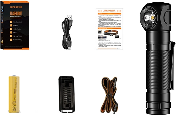 - Lámpa, USB-C kábel, 18650-es akkumulátor, lámpatartó, fejpánt, felhasználói kézikönyv, csomagolás