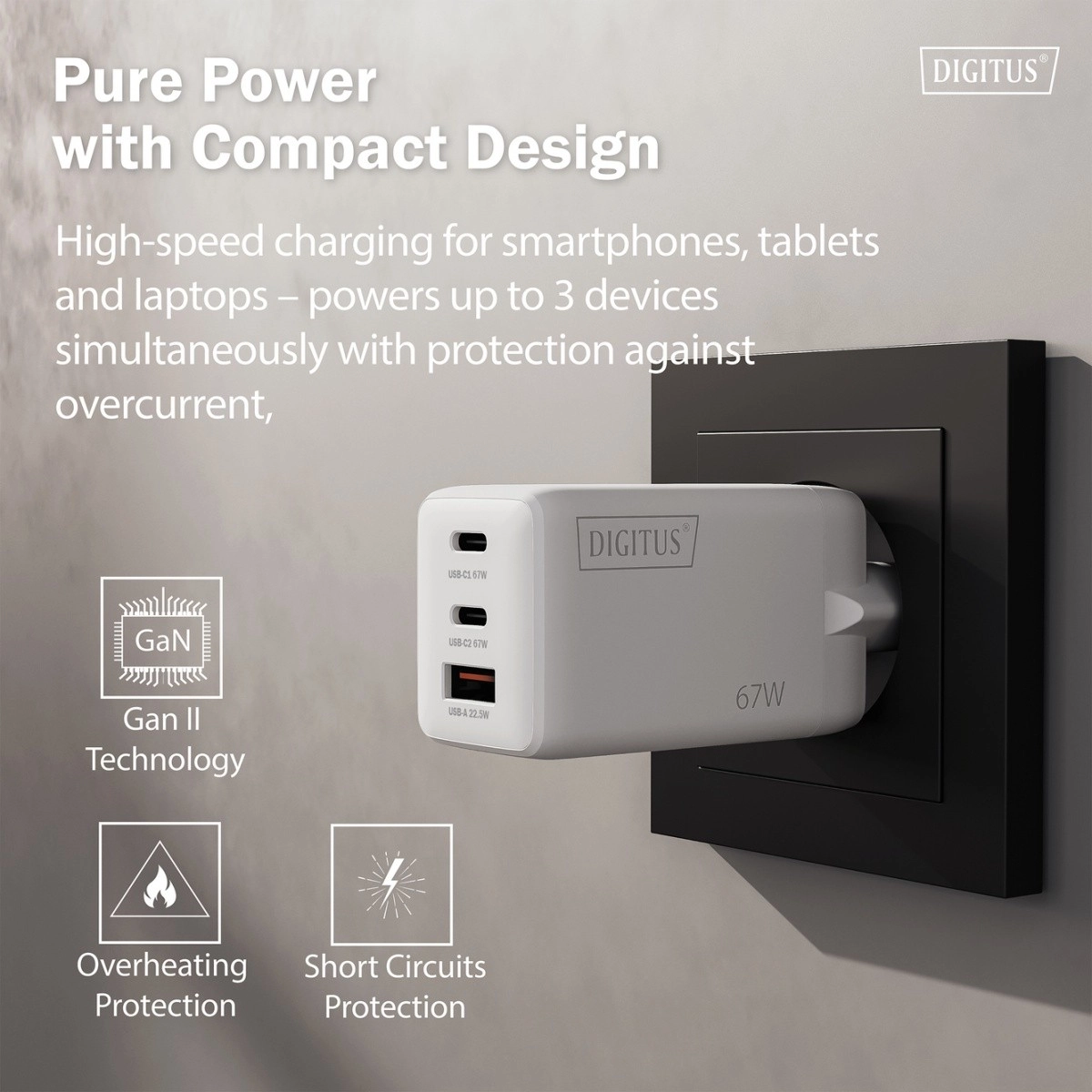Kompakt és nagy teljesítményű töltő GaN II technológiával, amely gyors töltést biztosít akár 67 W‑ig okostelefonokhoz, tabletekhez és laptopokhoz. A 2× USB‑C (egyenként akár 67 W) és 1× USB‑A (22,5 W) portoknak köszönhetően akár három eszközt is képes egyszerre táplálni intelligens teljesítményelosztással. Fenntartható kialakítás 98% PCR műanyagból és műanyagmentes csomagolással, amely környezetkímélő megoldást nyújt kompromisszumok nélkül a biztonság és a minőség terén.