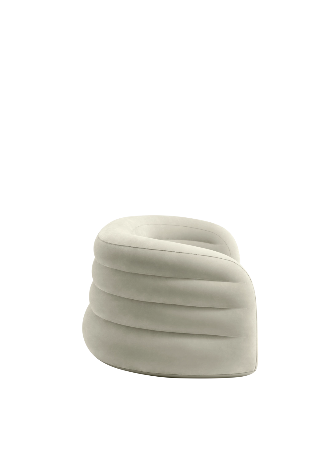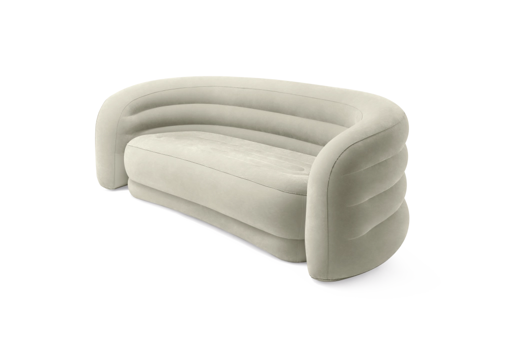A Curve felfújható kanapé organikus, otthonos hatású, lekerekített vonalaival hódít. Az olívabezs, semleges árnyalatú plüssbársony eleganciát kölcsönöz és kellemes tapintású. A szerkezet masszív, mégis könnyű és könnyen hordozható – ideális a rugalmas belső elrendezéshez.