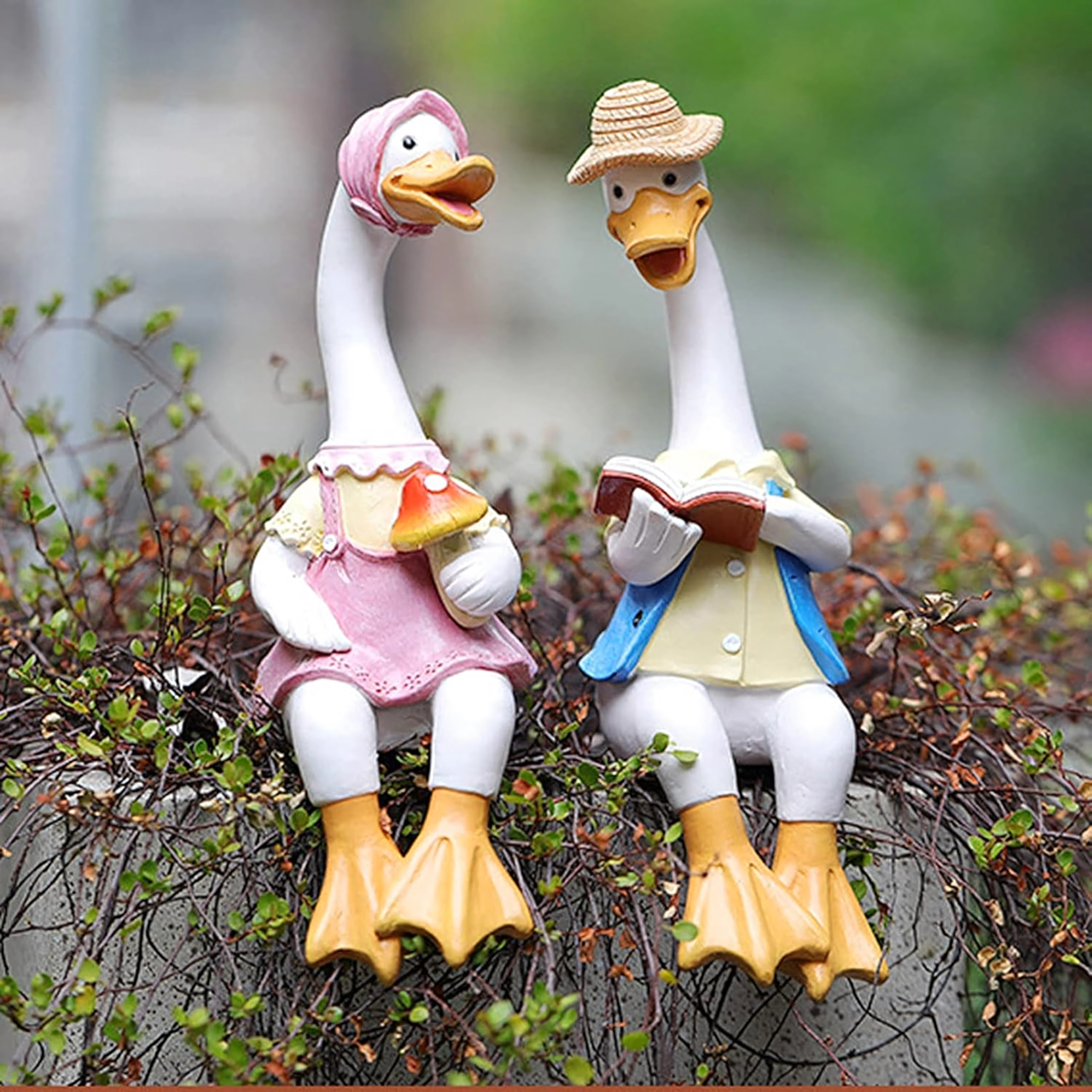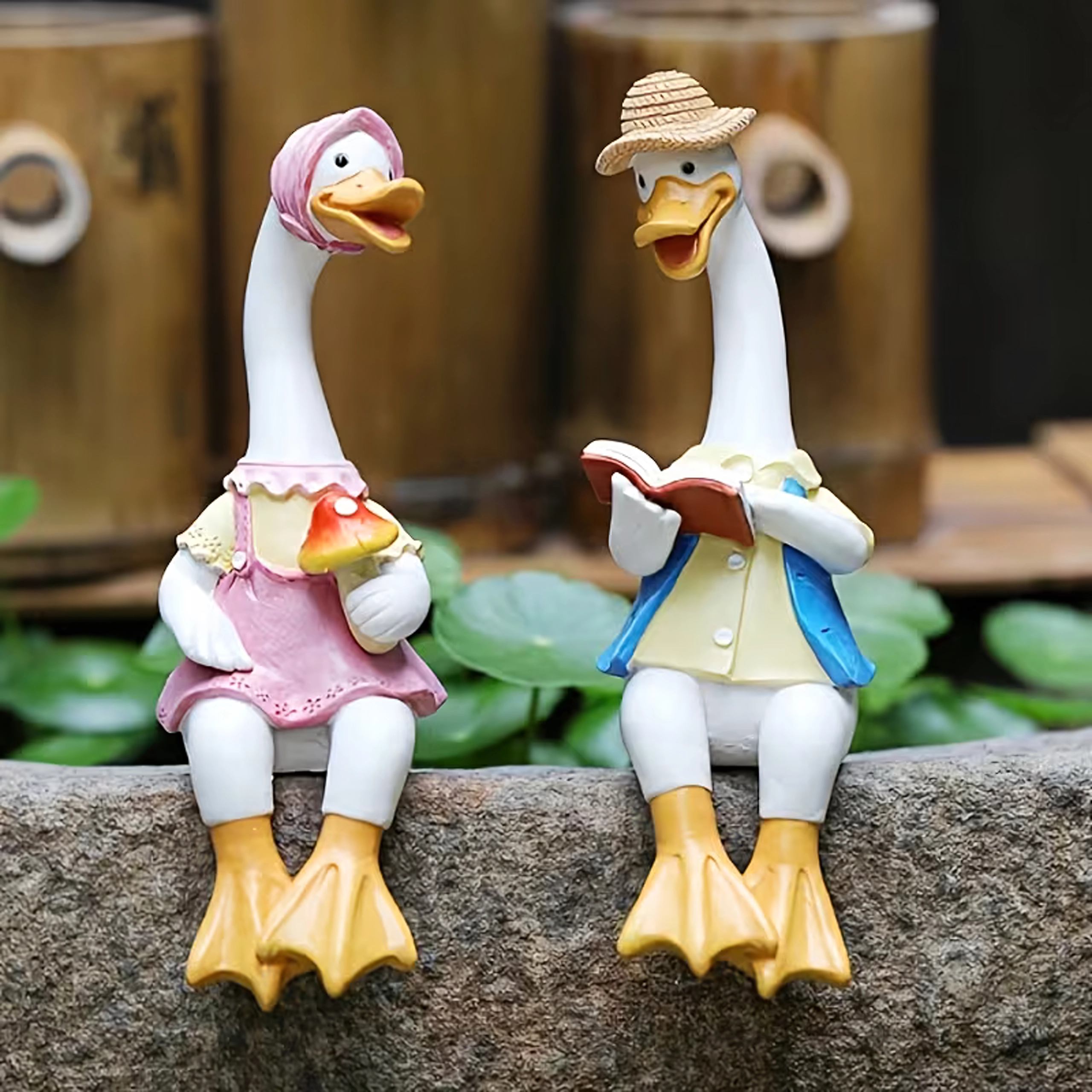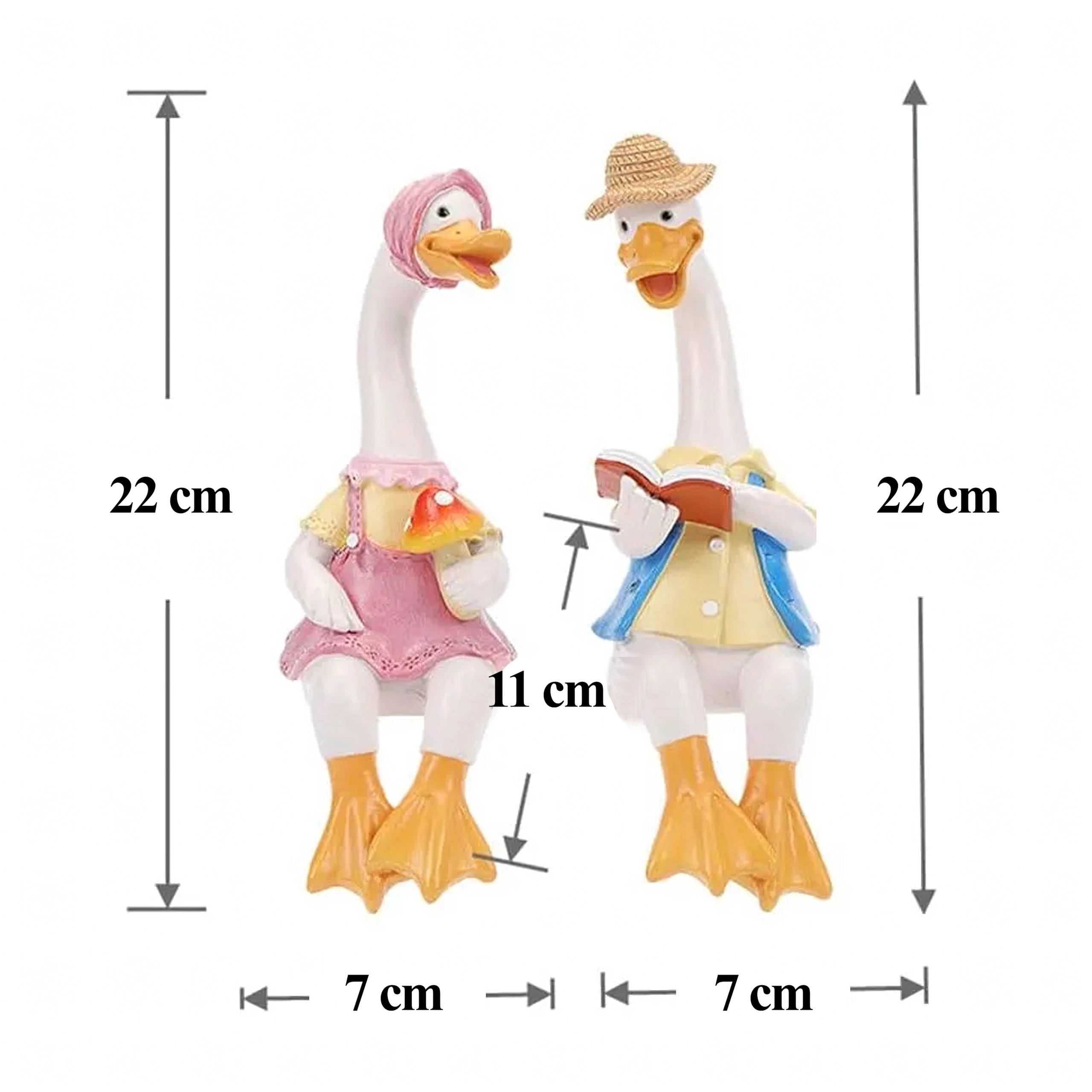 A szett két stílusos kacsát tartalmaz – az egyik rózsaszín ruhában, fityulával és apró kézdísszel, a másik kalapban, kék mellényben, nyitott könyvvel. Mindkét figura peremre ültethető, lábaik szabadon lógnak, játékos, ötletes látványelemet teremtve.