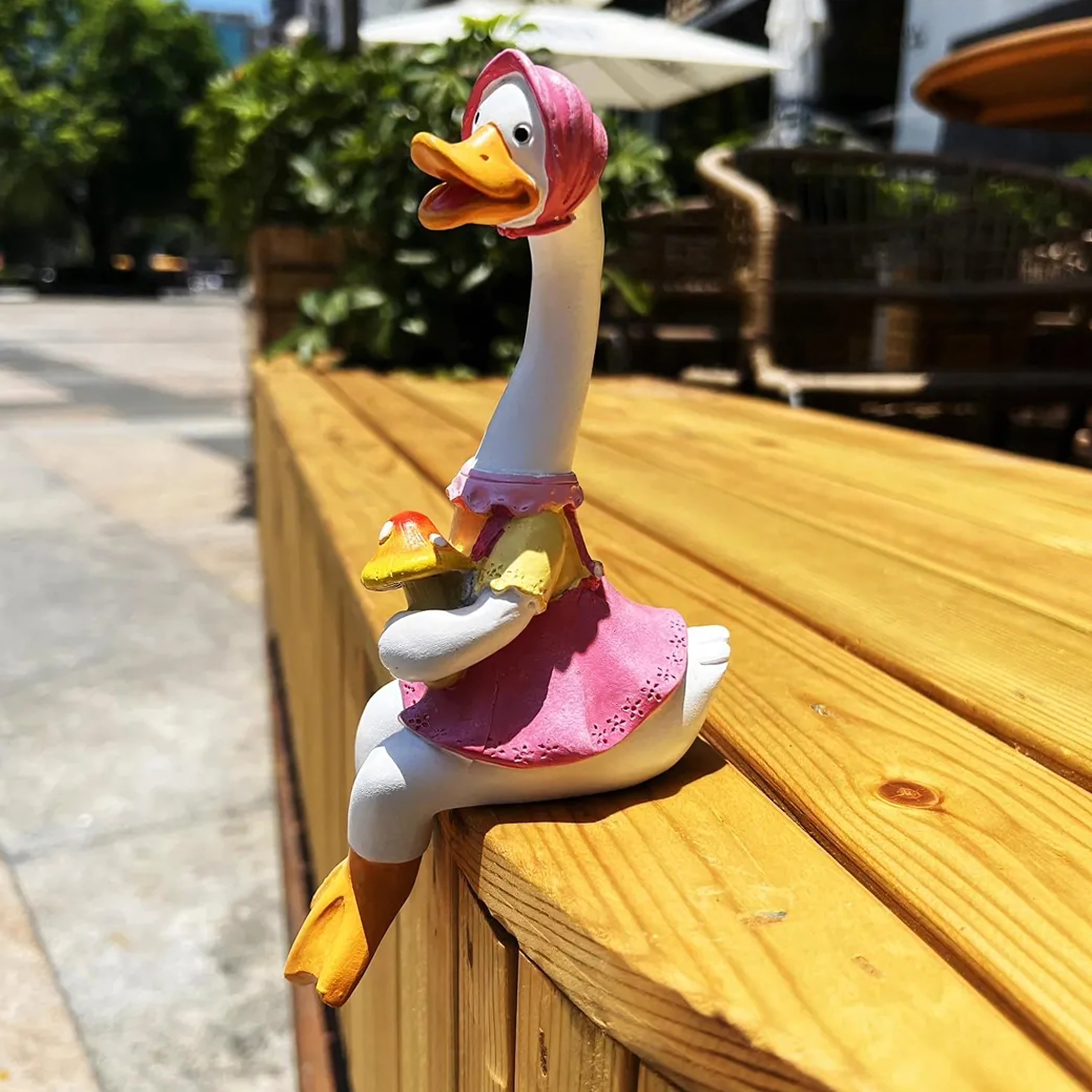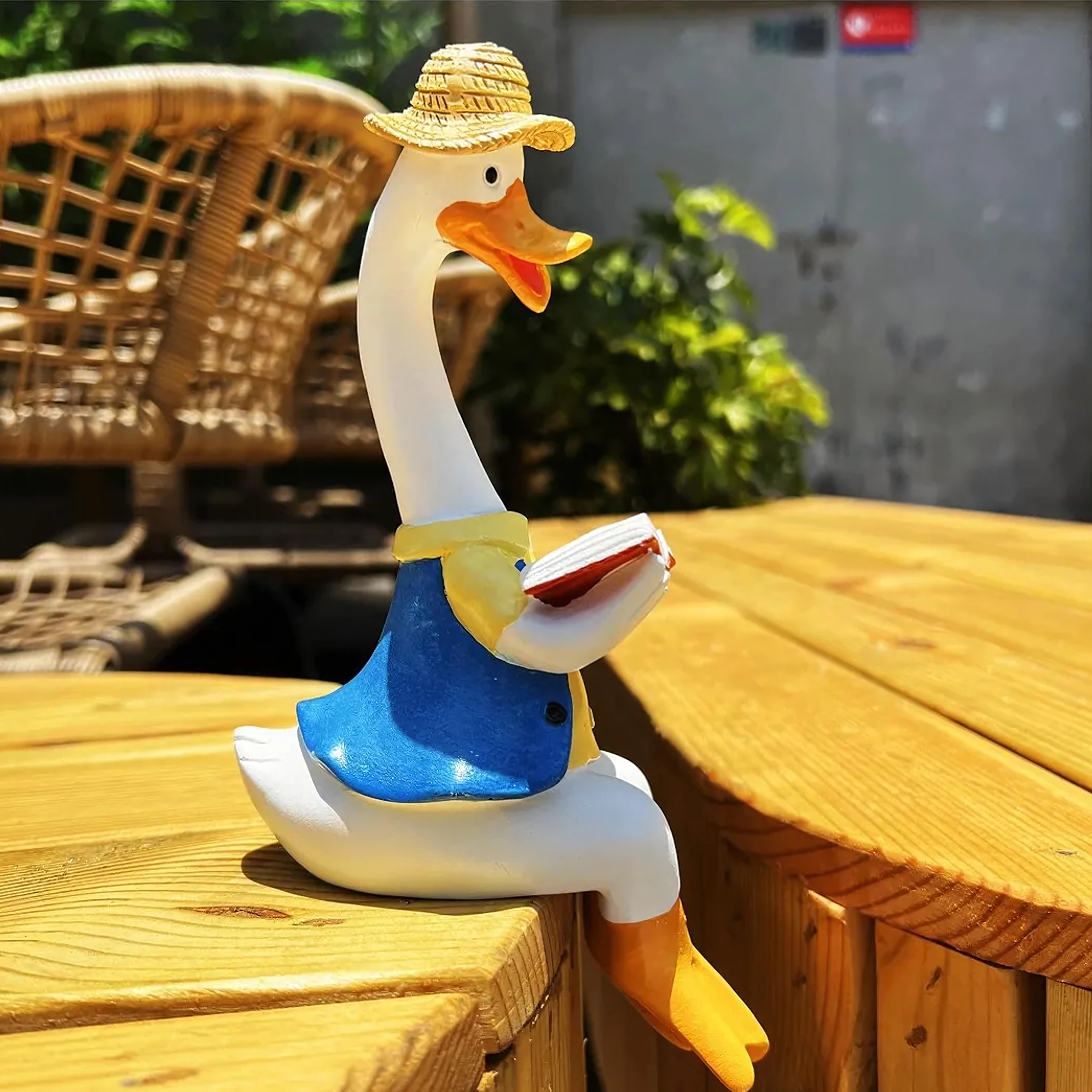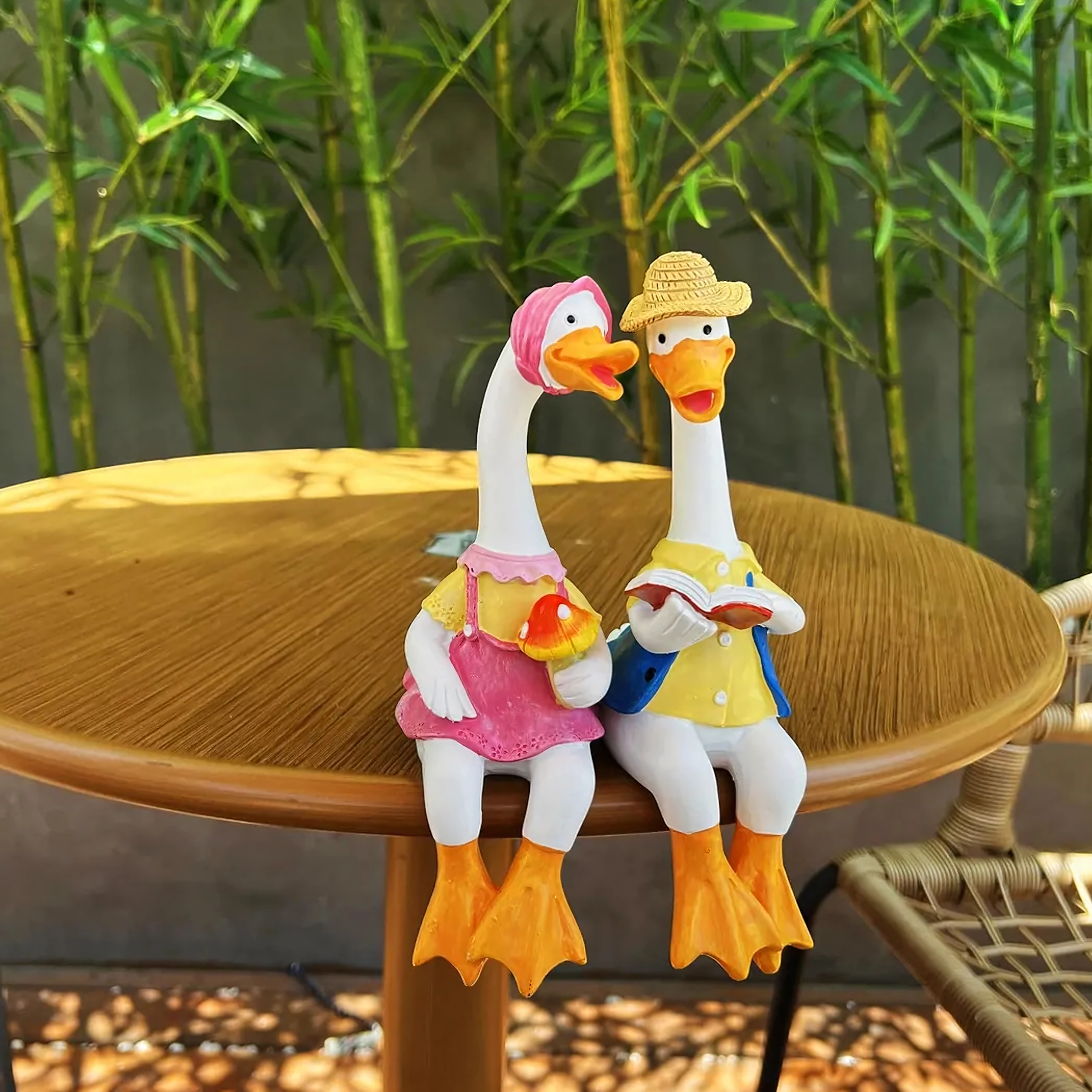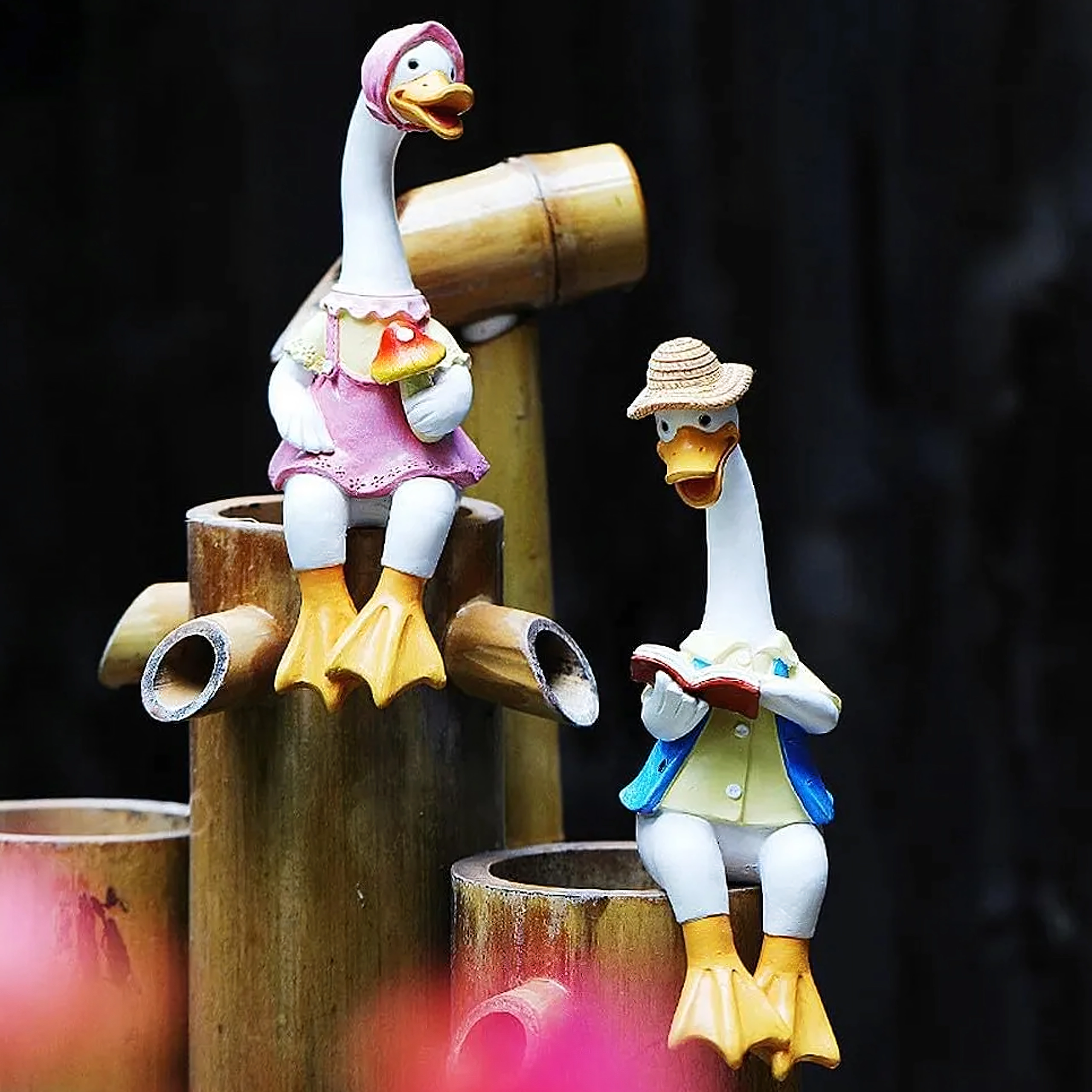 A szett két stílusos kacsát tartalmaz – az egyik rózsaszín ruhában, fityulával és apró kézdísszel, a másik kalapban, kék mellényben, nyitott könyvvel. Mindkét figura peremre ültethető, lábaik szabadon lógnak, játékos, ötletes látványelemet teremtve.